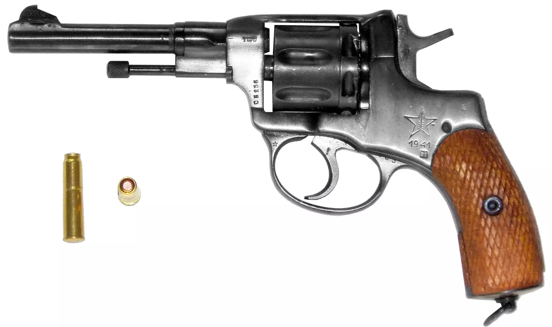 纳甘M1895(苏联) 这是一款由比利时人莱昂·纳甘于19世纪80年代末为俄罗斯政府设计的七发双动气封式左轮手枪。它使用7.62×38毫米凸缘弹,是游戏中唯一使用这种独特弹药的武器。几乎所有左轮手枪的弹巢与枪管之间都必然存在一个小间隙,以便弹巢旋转。然而,这个间隙会导致子弹穿过时推进剂气体泄漏,从而降低子弹速度(最多降低75英尺每秒)。纳甘设计的弹巢在击发时会被推向枪管,再加上子弹前方的卷边设计,使得子弹从弹巢进入枪管时几乎不会损失推进剂气体。这也意味着这把 pistol 可以加装消音器,而且通常情况确实如此。我不知道二战时期是否有该 pistol 的消音版本,但在越南战争期间人们确实发现了这类版本。和所有左轮手枪一样,这把 pistol 最大的缺点就是 reload 速度非常慢。