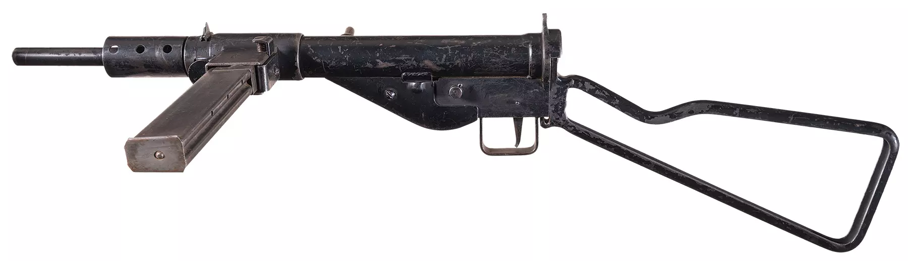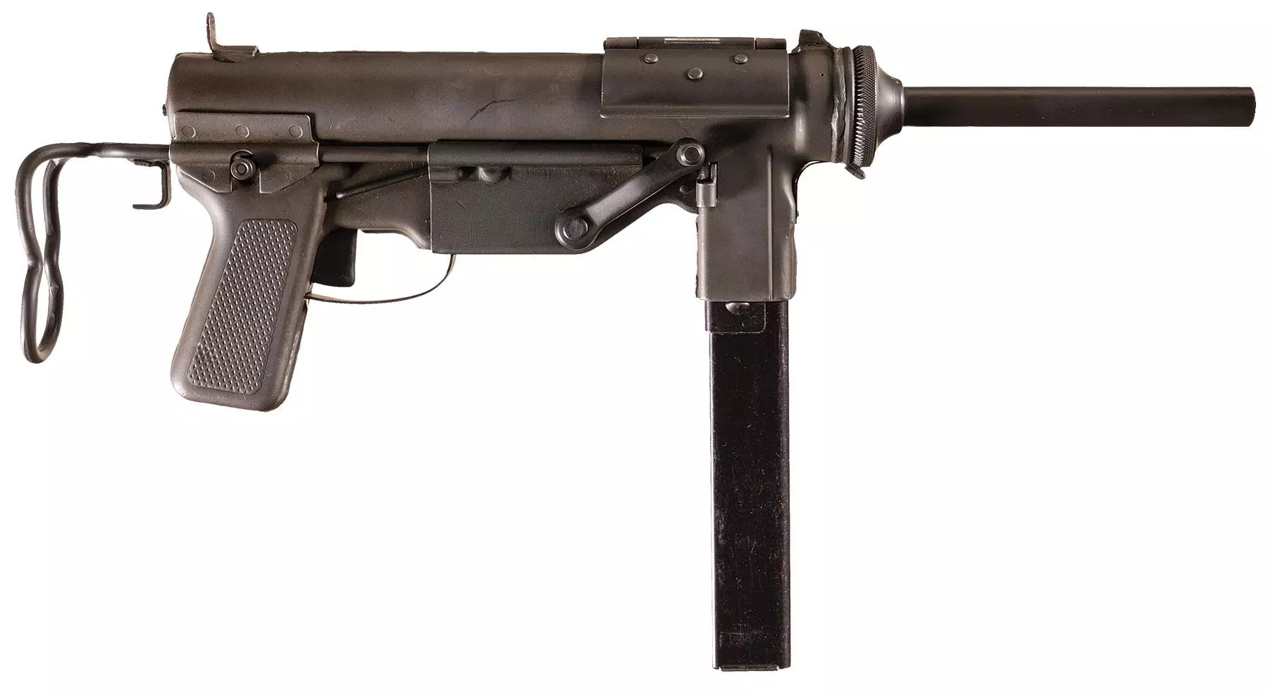 M3黄油枪(M3冲锋枪)(美国) 1944年列装的M3冲锋枪使用与汤普森冲锋枪相同的.45 ACP弹药,旨在替代汤普森,因其生产成本更低且重量更轻(8.15磅,而汤普森为10.8磅)。因其外形类似机械工具而被昵称为“黄油枪”,实际上它的精度不如汤普森,仅支持全自动射击,射速较低,约为450发/分钟。通用汽车的Guide Lamp公司在1943至1945年间生产了超过60万支。它还配备了可折叠的金属丝枪托。约1000支9毫米版本被生产出来供战略情报局(OSS)使用,用于敌后行动,因为9毫米弹药在被占领国家更容易获取。这就是战略情报局提供给法国和挪威抵抗组织的版本。此外,OSS订购了1000支.45 ACP口径的消音版本。据称,这种消音器的效率不如英国的司登冲锋枪消音版本,即Mk IIS。该消音器与枪管为一体式设计,可像原枪管一样拧上或卸下。