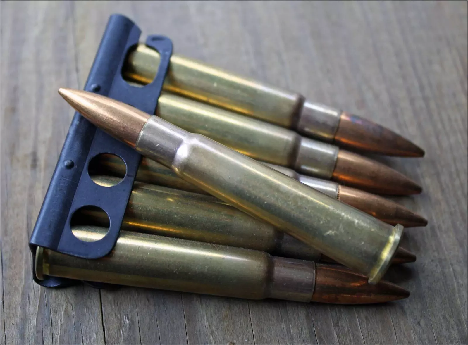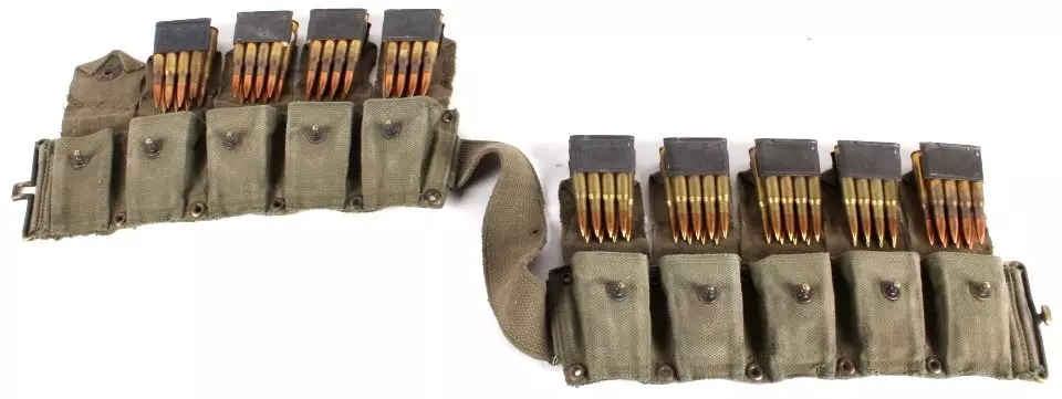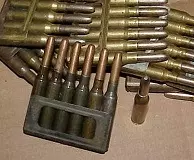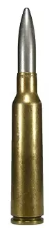 .30-06(7.62毫米×63毫米)(位于.30-06加兰德漏夹和M1923弹药带上方) 该弹药的发音为“三十-aught-six”,是二战期间乃至朝鲜战争时期美军的步枪 cartridge。它于1906年被美军采用,并一直服役到20世纪70年代末。其中,“.30”指的是子弹的口径(以英寸为单位),“06”则代表该 cartridge 被采用的年份。这是一种威力强大的弹药,至今仍广受欢迎。其被定型为M2普通弹,采用152格令的尖头平底弹头,枪口初速在战时名列前茅,达到2805英尺/秒。当时唯一比它更快的是俄罗斯的7.62毫米×54R弹药,其初速约快40英尺/秒,但弹头略轻。在游戏中,本弹药由M1903春田步枪、M1加兰德步枪以及温彻斯特M1895步枪发射。此外,在游戏之外,该弹药也被M1918 BAR自动步枪和M1919型.30口径机枪使用,后者最初采用布制弹带,后来改为金属弹带。