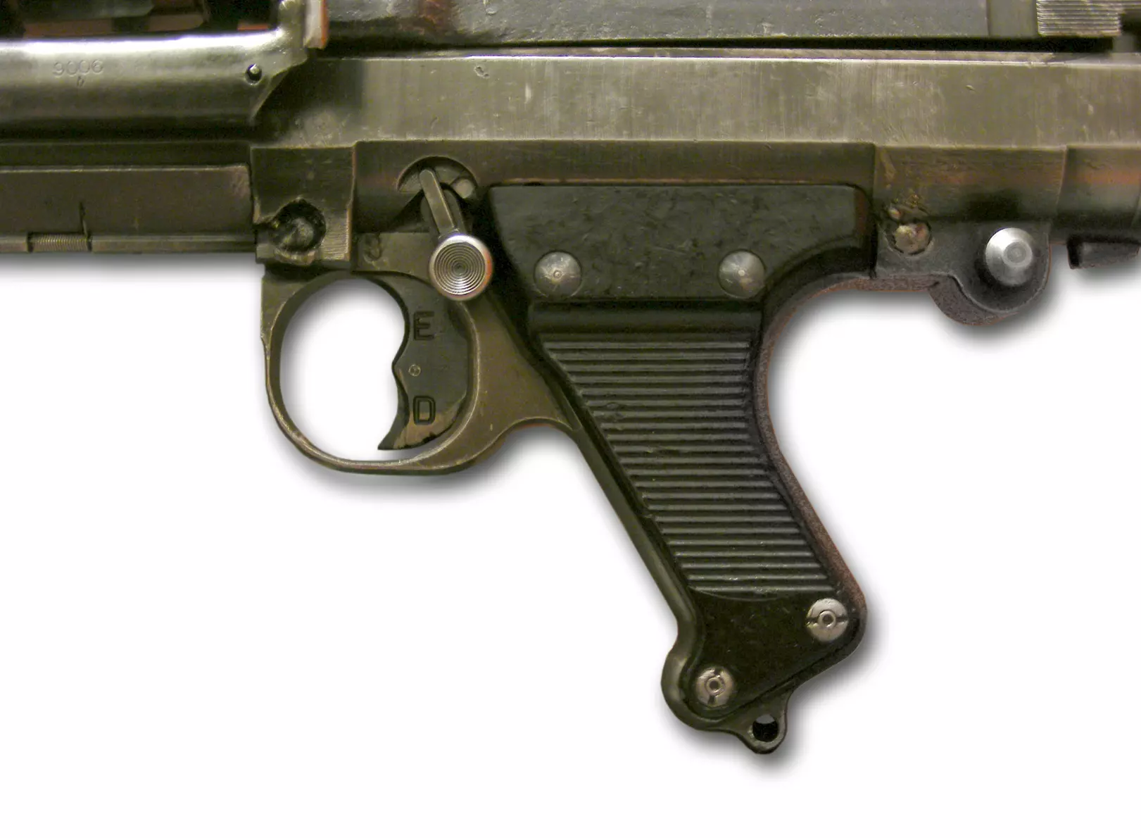 MG 34(Maschingewehr 34)(德国) 该机枪于1934年首次推出,并于1936年装备部队,它的出现具有革新意义,堪称世界上第一款Einheitsmaschinengewehr(通用机枪,GPMG)。盟军士兵错误地将其戏称为“施潘道”,这是因为第一次世界大战中的MG 08机枪由施潘道兵工厂生产。MG 34发射7.92×57毫米毛瑟弹(Karabiner 98K、Gewehr 43和FG 42也使用该弹药)。它重量较轻(26.7磅),可由单人携带,射速可达900发/分钟。不过,MG 34结构复杂,难以大规模生产,因此后来被成本更低、结构更简单的MG 42所补充。这两款标志性机枪在整个战争期间持续生产。其最大射程为4700米,通常由50发或250发的不可散弹链供弹,较短的弹链常装在50发或75发的弹鼓中。令人惊讶的是,这款机枪具备选射功能,配有独特的双月牙形扳机——扣动扳机上半部分可进行半自动射击,扣动下半部分则为全自动射击(如下图所示)。E代表Einzelfeurer(半自动);D代表Dauerfeuer(全自动)。