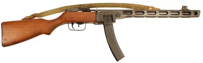 PPSh-41(苏联) 由格奥尔基·什帕金设计,旨在作为苏联此前PPD-40的更廉价且更可靠的版本。这是一款可选择射击模式的冲锋枪,采用弹匣或弹鼓供弹,发射威力强大的7.62×25毫米P型手枪弹,配备固定式木质枪托。 苏联人给这款武器起了个昵称“papasha”,意为“爸爸”,又因其高射速(900-1000+发/分钟)而被称为“打嗝枪”。它采用自由枪机式工作原理,开膛待击,可使用35发可拆卸盒式弹匣或71发弹鼓供弹。德军缴获的版本则使用32发盒式弹匣。其主要发射7.62×25毫米P型手枪弹,这意味着