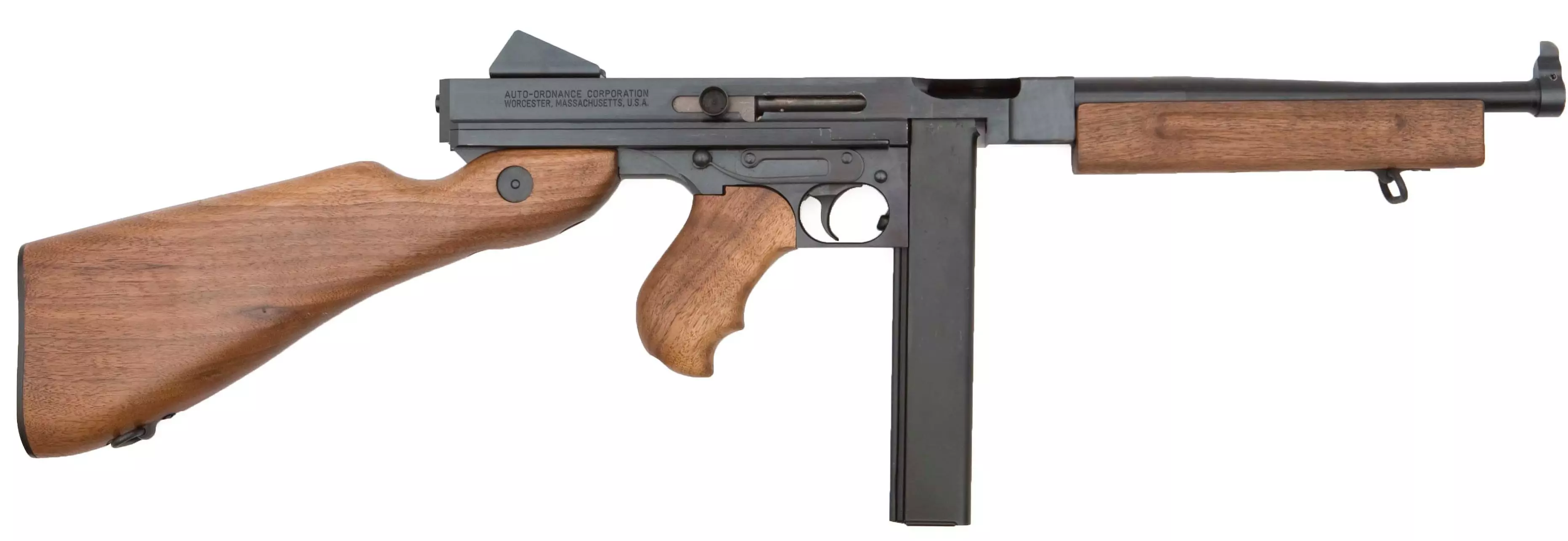 汤普森(M1A1)(美军) 这款可选择射击模式的半自动冲锋枪使用20发和30发可拆卸盒式弹匣,配备10.5英寸枪管,发射.45 ACP弹药。它是二战中标志性的美军冲锋枪。该枪由约翰·T·汤普森于1918年发明,最初被命名为M1921。在禁酒令时期(1920年至1933年)前后,它因被有组织犯罪集团、联邦调查局以及军队使用而声名鹊起。M1921的射速约为800发/分钟,美国海军认为这一射速过高,因此自动军械公司生产了射速为600发/分钟的1928型。二战期间,它被美军采用,主要有三个版本。第一种是M1928A1,可使用盒式弹匣和弹鼓,枪管末端装有卡茨补偿器,枪管上设有散热鳍片,拉机柄位于机匣顶部,采用延迟后坐式操作系统。第二种和第三种型号是M1和M1A1,它们的枪管没有散热鳍片,只能使用盒式弹匣,拉机柄位于侧面,采用自由枪机式操作系统。该枪配备固定枪托,虽然无法折叠,但M1928A1版本的枪托可以完全拆卸,而M1和M1A1版本则不能。M1和M1A1之间的两个主要区别在于:M1采用击锤驱动式撞针,而M1A1则为固定式撞针;M1的射速接近900发/分钟,而M1A1的射速为600发/分钟!二战期间,该枪的产量超过150万支。其主要缺点是重量较大(超过10磅)以及在肮脏或丛林环境中存在可靠性问题。游戏模型是M1或M1A1,但更有可能是M1A1版本,因为M1版本仅生产了约6个月就改进为M1A1版本。事实上,M1版本非常罕见。 我曾射击过M1928A1版本,尽管它的后坐力很强,但其坚固的结构和高射速使其更容易保持瞄准——而且,它确实非常酷。