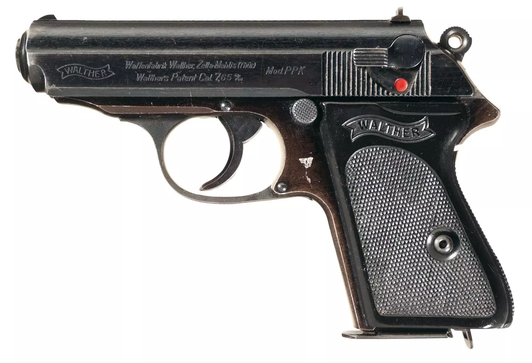 瓦尔特PPK(德国) 由卡尔·瓦尔特设计的PP(警用手枪)于1929年开始生产,专为警方使用而设计,至今仍在生产。它是最早生产的双动单动手枪之一。PP及其更小的版本PPK(警用刑事手枪)发射.32 ACP和.380 Auto(或9毫米短弹)口径弹药。两者均使用可拆卸盒式弹匣,其中PP的.32 ACP版本容弹量为8发,.380版本为7发,而PPK的两种口径版本容弹量各少1发。目前没有发现PP或PPK有任何口径版本被配发给德国军队的相关信息,但它们曾被配发给警察,希特勒使用其.32 Auto口径PPK自杀。这把手枪确实有可能装备德国军队。在游戏中,PPK手枪的口径为.380而非.32自动,这是根据其弹匣容量判断的。
