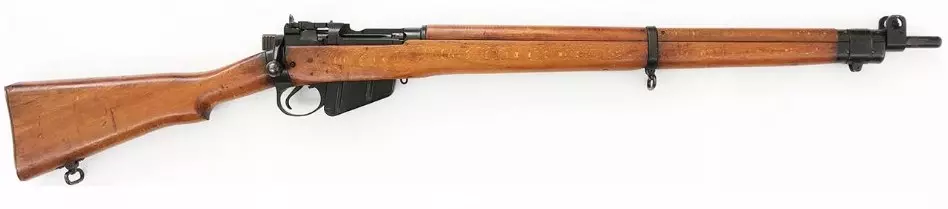 李-恩菲尔德No.4型(英国) 该步枪是二战期间英国陆军的主力武器,使用.303英寸弹药。它采用旋转后拉式枪机,配备10发内置盒式弹匣,通过5发弹夹装填。这款步枪的各种型号自1895年正式列装以来,一直为大英帝国服役至1957年。No.4型是整个二战期间英国陆军及英联邦部队在欧洲和太平洋战场的主要步枪。与前代产品No.1型相比,它结构更坚固,更易于大规模生产。 二战期间,工厂会对标准No.4型步枪进行精度测试,选出的精准步枪会进行改装,在枪托上增加加高的贴腮板,并安装可适配No.32型3.5倍望远镜瞄准镜的瞄准镜座。这款瞄准镜顶部设有弹道下坠补偿距离调节鼓,刻度以50码为增量,范围从0到1000码。这些步枪被命名为No. 4 Mk I (T)型。它们在200码距离上可实现7发7中,弹着点均落在5英寸圆圈内;在400码距离上则能达到7发6中,弹着点位于10英寸圆圈内。为安装瞄准镜底座,后部战斗瞄具已被磨去。