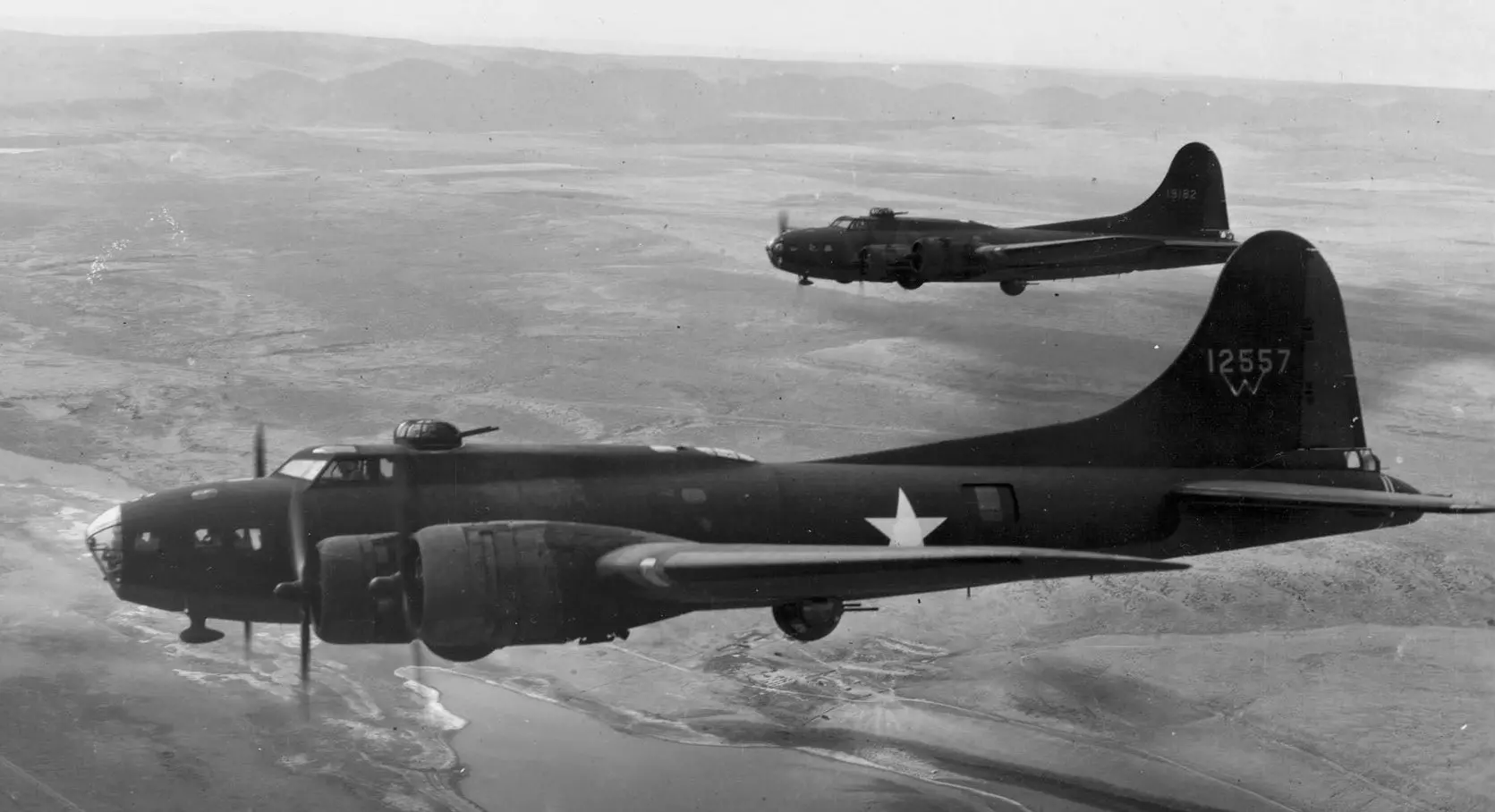 波音B17G飞行堡垒(美国) 这是美国在20世纪30年代为美国陆军航空队研发的四引擎重型轰炸机。自1938年投入使用以来,它不断得到改进,最终型号为B-17G。B-17主要作为日间战略轰炸机,用于打击德国的工业、军事和民用目标。美国第八航空队从英国起飞执行任务,第十五航空队则以意大利为基地。尽管与B-24解放者或阿芙罗兰卡斯特轰炸机相比,B-17的载弹量更小、航程更短,但它以极其坚固而闻名,即便遭受难以置信的损伤,仍能成功抵达目标并将机组人员带回基地(见下方B17与德国战斗机空中相撞后幸存的照片)。它向德国投下的炸弹数量超过了美国其他任何轰炸机(占总量的42.6%)。B-17G型号由四台莱特R-1820“旋风”涡轮增压星形发动机提供动力,每台发动机可产生1200马力!它的巡航速度为182英里/小时(293公里/小时),最大速度为287英里/小时(462公里/小时)。实用升限为35600英尺(10850米)。在400英里以内的短程任务中,其炸弹有效载荷为8000磅(3600千克);在800英里以内的任务中,有效载荷为4500磅(2000千克)。机组人员由10人组成:飞行员、副驾驶、领航员、投弹手/机头炮手、飞行工程师/顶部炮塔炮手、无线电操作员、2名腰部炮手、球形炮塔炮手和尾部炮手。