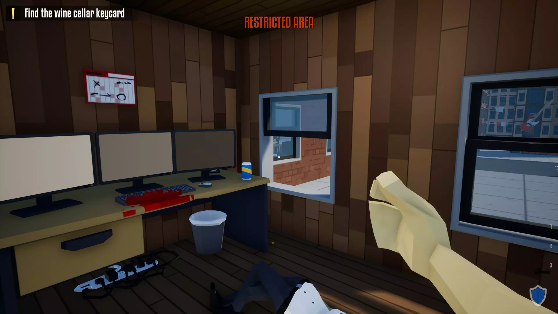 5. 在二楼摄像头监控下杀死保安。打开窗户,爬进另一个房间。房间的桌子上会放着一张蓝色的钥匙卡。