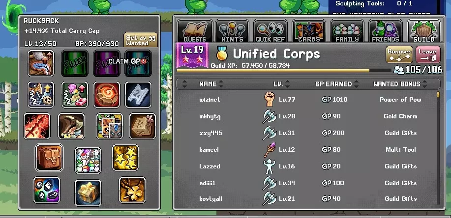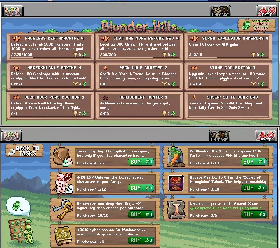 It's recommending to go watch him as you can learn about the game and see what content is coming up. Also, he likes to hand out gems and spawn bosses and crystal creatures. What he does is go to certain world (worlds can be switched by going to the menu, world, selecting an icon on the top following by a world #(so like Cookie World 1, or Pizza World 12). He usually spawns things in the mushroom area of map 1 so everyone can access it. Bonus Stuff -Every time you unlock a Steam Achievement, a bunch of gems and other items will drop on the ground around the map. MAKE SURE YOU PICK UP ALL ITEMS WHEN THIS HAPPENS AS ALL ITEMS DISAPPEAR ONCE YOU LEAVE THE CURRENT MAP OR SHUT THE GAME OFF. -The guy who lets you select a class will give a quest to find a walking house after selecting a class. It's a boss monster called Baba Yaga. To find it, you'll need to kill Green Beans around the area until you unlock the lower left portal by the Birch Tree. In the portal is a dead end map full of orange mushrooms to kill. At 00 every hour, Baba Yaga spawns. You likely won't be able to kill it as it's very high level. The next quest in this chain is to kill it. -The Tools that the stone block in town wants are sold by the store in town for around 35 silver. -The Pig character in town sells permanent upgrades called bribes which will save you lots of money in the long run. -The Pig also lets you upgrade stamps which are permanent stat boosts shared across characters. Each rank of each stamp gets more and more expensive. Once you max out a stamp, you can upgrade it to a new set of levels by handing over a certain amount of specific resources. The stamp will tell you what it needs. -Ideally, you want to never take damage. Make sure to raise your defense through stamps, statues, and new armor if you're taking damage from monsters. -If you start getting MISS when attacking monsters, your accuracy is too low. You will need to raise your class' accuracy skill or get flat accuracy bonuses through cards and other means. If a monster drops their card, you can see what accuracy is required to reach 100%. Using the AFK info inside menu can also show your total accuracy % -When you get to the first big boss, there's a pretty good chance you'll only have about 50% accuracy. Try not to fight him if it gives you a warning above his door about your accuracy. -Dailies reset around Midnight American time. -All stores have different stock. Make sure you buy your daily rare restocked items from them (statues, shards, etc) -Make sure you don't buy duplicate items from stores that can't be used multiple times (chest space for example). This can cost you a lot of money. Selecting the item before purchasing will tell you if you need it. -Prioritize Chest space over Stack capacity over Inventory space. All monster drops different materials and you need as much chest space as possible. Stack capacity allows you to hold more items at once which saves inventory space. This is the reason why Inventory space is at the bottom as the other 2 are far superior. -Shop around for space upgrades. If you have 3 gold, you may be able to buy a +5 chest upgrade in the jungle store, while the main town store only sells +4 for 3 gold. -If an NPC has a circular arrow speech bubble, that means that they have a repeatable quest (usually daily). -If you get duplicate quest rewards like stamps, sell them to the store as they are worth quite a bit of money. -The Peanut Recipe can be obtained by completely the Picnic basket's first daily quest for 200 frog legs and 100 bean slices. -If you drop a quest item and need to reclaim it, you can go to the quest log, go to the quest and click reclaim. This mostly matters at higher levels when you start getting handed quest chain tokens that all combine into another token. -There's a food slot in your inventory to equip 2 food items (can be upgraded for more). Always equip the Golden Jams you get in 1 slot as this is free hp increase (you'll get many more and they all stack for more hp). The other can be for healing, but you should only be taking damage on bosses. -When you kill an NPC, there's a chance for a crystal NPC to spawn which has better loot. -For the summer event, use the oysters in the highest level area you can handle as the summer NPCs scale with the area, thus give more xp and loot. Just use 1 oyster at the start in order to test the waters as you don't want to waste a stack and be unable to kill any of them. -Create new characters every time you unlock a new slot as they are free resources and free xp across your account. -The spiked boxing gloves suck, don't make them. They can only hit 1 enemy at a time and aren't a class weapon, so they don't benefit from class bonuses like warrior double hitting. Boxing gloves are only used for the journeyman class. -The reason you see the locations of all portals on each map is because you can click the portals and your character will auto-walk over and use them. -Don't forget to click the buy points button on the anvil. You can buy upgrade points for money and monster drops. The best use for points is speed and capacity, as exp isn't very good in the early levels. -There's a hidden minigame that can be played once a day for up to 40 gems. The portal to it is in the carrot man room, but you can teleport to it by typing into chat "If u love me let me go". It's case sensitive and you have to type it EXACTLY like that. The minigame starts a 00 each hour (make sure you're a minute early) and the goal is to last as long as possible as spikes randomly pop out of the ground to instant kill. You get 2 gems each round you survive. It's completely random, so no skill is involved. -If you go to codex, quick ref, and anvil, you can use the quick deposit button anywhere to deposit all produced items (like thread, nails, and bricks) directly into your storage.