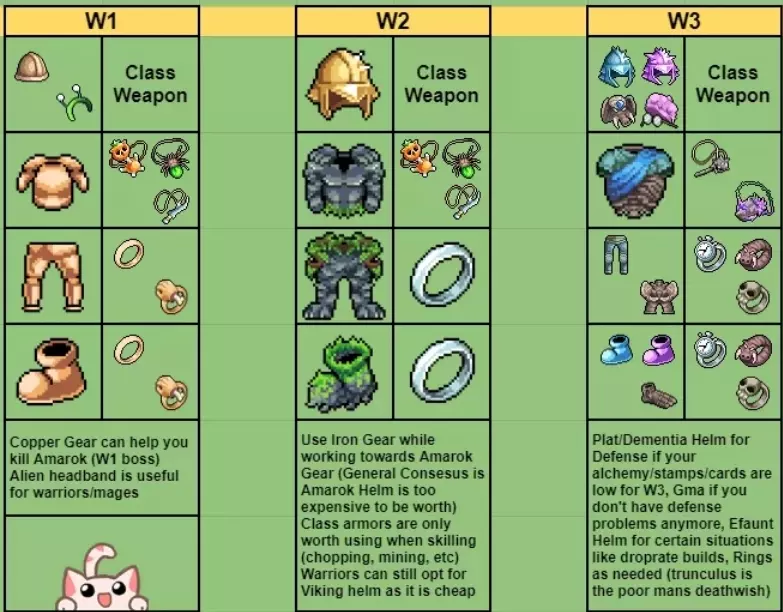 你的第二个职业将在世界2的地图3中选择。这需要250个烤肉串(可在世界2的商店购买)和150个蟹饼(由地图3的怪物掉落)。 装备 游戏中有大量装备。以下是展示最佳战斗装备的信息图。