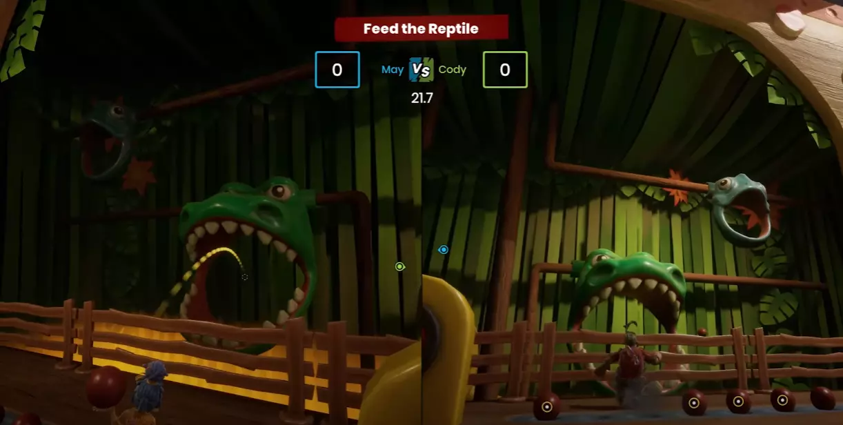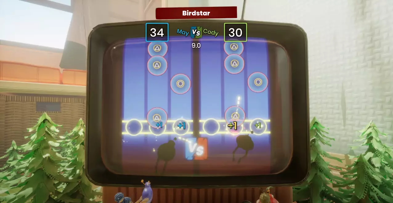 零食恐龙 现在看看谁灭绝了!区域:恐龙乐园 这有点 tricky:当科迪骑上他的红色恐龙并(在小梅的帮助下)向上移动后,他必须用恐龙的尾巴击中第一个红色地板,然后站到藏有化石的棕色地板上。一旦站在那个平台上,小梅可以骑着她的恐龙靠近他并吃掉科迪(记住,这是小梅唯一能吃掉科迪以获得此成就的地方)。 • 迷你游戏 11:鸟星 区域:很久很久以前 穿过魔法城堡的大门后,向左走,你会看到一台电视,在上面可以玩这个迷你游戏。
