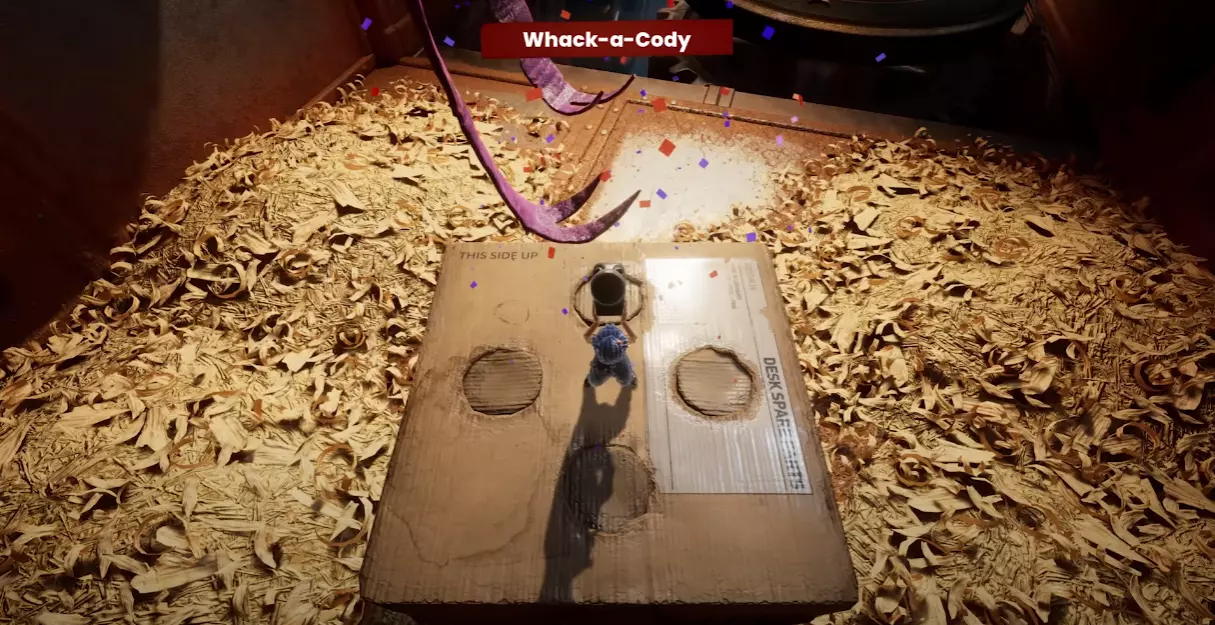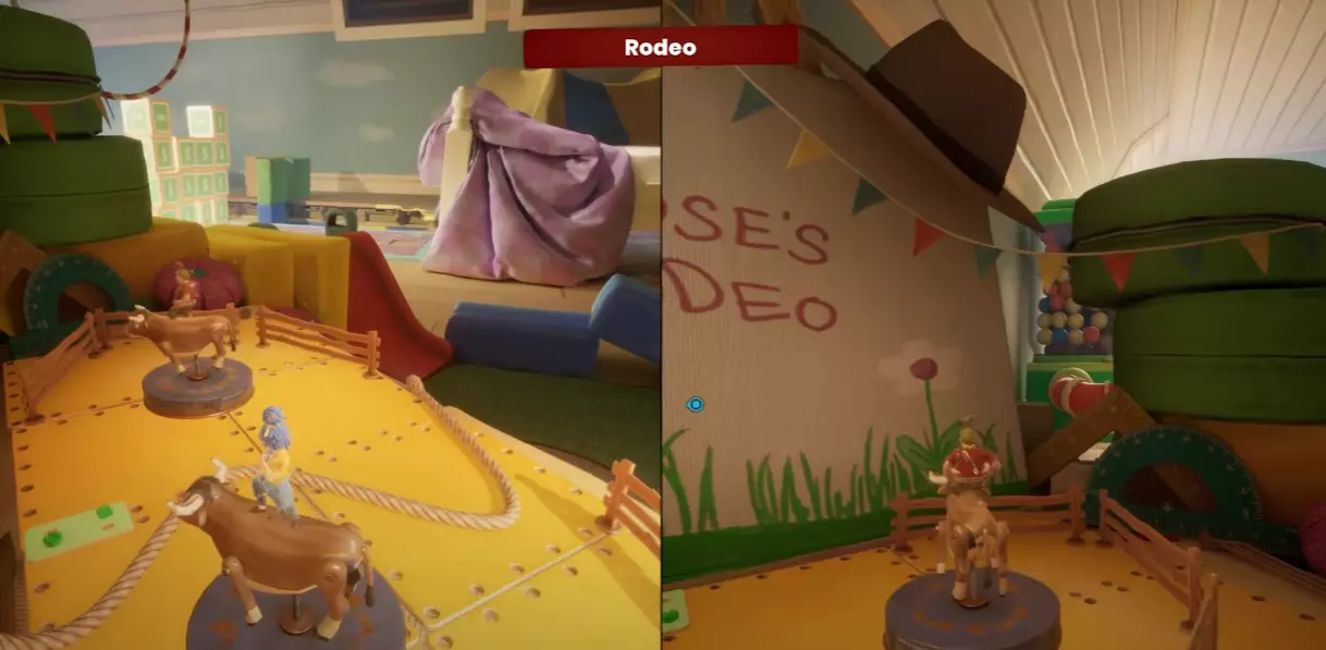 大胆的恶魔 上演一场表演,即便粉身碎骨。 章节:跳房子 生成后,进入一辆汽车,在朋友的帮助下驾车穿过圆环。如果失败,会重新生成一辆新汽车。只要成功穿过圆环一次,即可解锁该成就。 • 小游戏8:牛仔竞技 章节:跳房子 在上述提到的汽车旁边,有一个标有“罗丝的牛仔竞技”的枕头,你可以在那里找到这个小游戏。