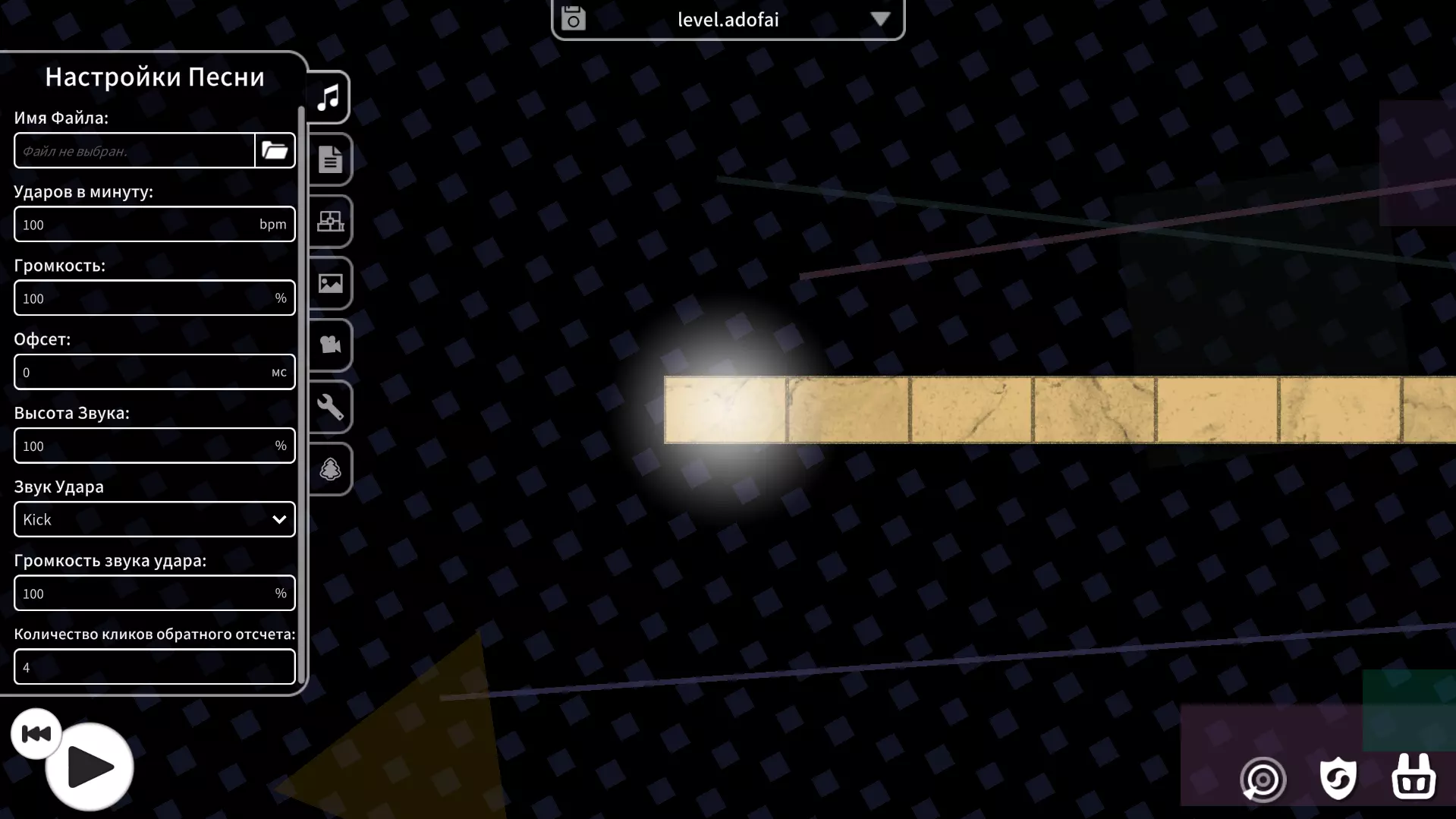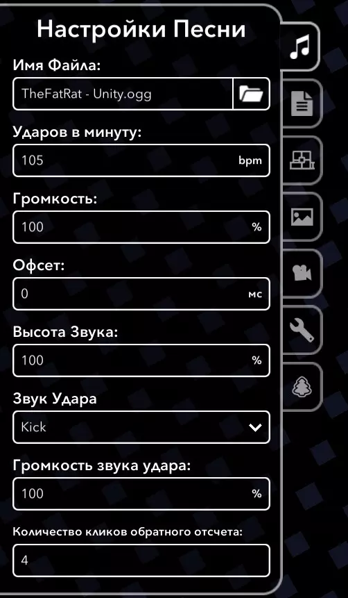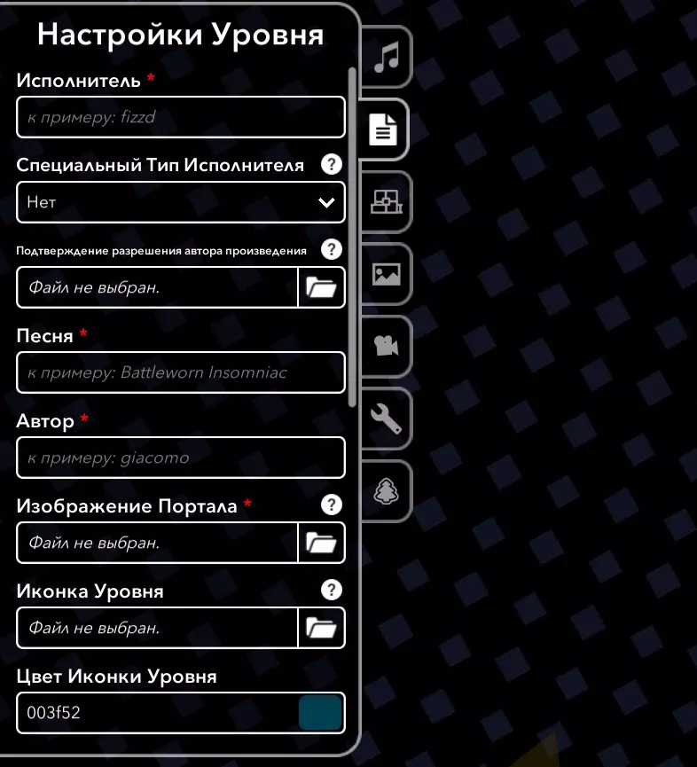 目前这就是我们在编辑器中看到的全部内容。现在让我们来弄清楚各个功能的作用! 关卡创建。歌曲设置 首先,让我们添加音乐。毕竟,没有音乐的关卡算什么呢?更何况这是控制面板上的第一个选项卡。要添加音乐,请在第一行选择文件。文件格式需为.ogg格式的音频可以通过一些网站进行转换。另外,如果你之后想将关卡公开,需要使用该游戏允许使用的音乐人创作的音乐。要确认这一点,可以前往已认证音乐人网站,在那里能找到所有被允许的音乐人。如果该音乐人不在其中,你可以自行向音乐人申请在游戏中使用其歌曲的许可。为此,请复制包含创作者名称的消息并发送至其私信。然后截取回复截图并上传至网站。若获得批准,你将可以在游戏中自由使用其音轨。若不想等待,可在第二个标签页直接将授权截图上传至关卡。是的,我知道这一切都很复杂,所以一开始我建议你先加载已获得授权的热门歌手的音乐。为了后续能正确创建关卡,建议你立即在网上找到你歌曲的BPM(每分钟节拍数),并将其输入到下一行的“每分钟节拍数”中。 以下是最终效果的示例: ======