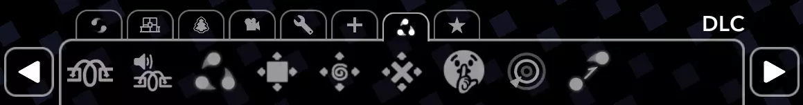 这是关卡事件菜单。在这里你可以添加【漩涡】、设置速度、放置检查点等。但这个菜单不仅可以修改游戏玩法。让我们看看所有部分: 1. 游戏玩法 除了上述功能外,你还可以在这里设置新的打击音效、播放声音、设置行星轨道、暂停节拍以及制作自动片段。所有功能将在你为其设置功能的方块被点击后开始生效,或者你可以在“角度偏移”栏中设置自己的事件开始偏移值。 2. 歌曲事件 在这里可以直接在关卡中修改方块!具体包括: 设置颜色、移动、重新着色、设置轨道动画。 移动或重新着色轨道时,你需要指定起始方块和最后一个方块。 3.装饰事件 在此处可以修改装饰的参数和文本,还能放置对象以及设置自定义粒子效果。 4. 视觉效果 这是一个适用于各种效果的实用板块。 在此处可以设置背景、制作闪光效果、移动镜头、添加滤镜等。 5. 事件修改器 可以重复事件并设置条件事件。第一种在需要在一段时间内以特定间隔重复事件时很有用。第二种可以设置命中或失败的精度标签。例如,可以制作某种死亡效果。 6. 便利功能 这是个有趣的部分名称。 实际上这里可以为板块添加评论和添加书签。在实际层面不会有任何改变。 7.DLC — 此部分仅在您购买了DLC后才会出现,相应地,这里包含DLC中的游戏功能,例如【延迟】、【三颗行星】、【自由移动】、【行星半径大小】。对于没有DLC的玩家,以下是所有图标: