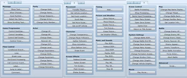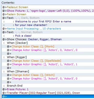 让标题画面渐变为黑色。 创建角色时显示背景图片。 让背景图片淡入。 向玩家提供一些操作说明。 创建供玩家输入姓名的输入框。 为玩家提供职业列表。 创建供玩家选择的职业选项。 将玩家选择的职业与对应的头像关联。 告知玩家游戏即将开始。 让背景图片淡出。 移除背景图片。 将玩家传送至城镇地图。 让城镇地图淡入。 这些是玩家选择“新游戏”后到游戏实际开始前需要执行的操作。你可以在图片中查看它们对应的事件指令进行对比。花点时间阅读这份列表,并将其与我们的伪代码进行比较。希望你能理解我们需要执行的操作与命令形式之间的关系。双击内容框内部会弹出3页事件命令。这些页面中包含了你在上面看到的每个命令。再次提醒,请花点时间阅读下面命令的每个部分,这只会占用你一分钟时间。以下是一份入门列表。