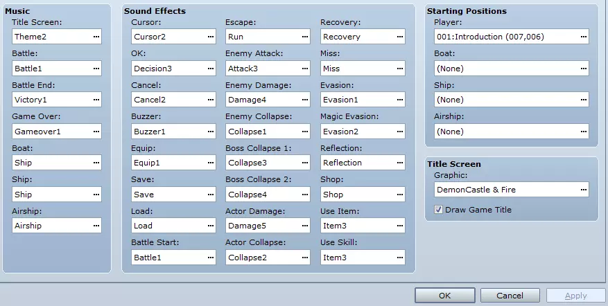 资源管理器是导入游戏所需所有媒体文件的地方,包括图像、视频、声音和图片。导入后,这些文件可在整个游戏设计过程中使用。例如,若导入了一些图块集,在编辑地图时,导入的图形将在编辑器中可用。在本教程中,请将一张你喜欢的游戏图片导入到图片目录。此外,建议保留所有默认资源。 数据库用于调整和编辑游戏的核心功能。本节课我们只需关注系统和角色选项卡。将鼠标悬停在任何按钮或区域上,会显示工具提示,其中包含相关描述。工具提示的解释很详细,请善加利用。编辑角色:在“角色”选项卡中,选择第一个角色,右键点击并选择“清除”。我们要保持这个角色槽为空,以便在游戏过程中创建自己的角色。 编辑标题画面:接下来进入“系统”选项卡。在这里我们可以更改游戏的标题画面和音乐!在“系统”选项卡的右下角可以找到“标题画面”。点击它会弹出一个窗口。如果你已将任何标题画面图形导入资源管理器,就能在这里找到它们。默认图形是很好的占位符,通常先设置好基本内容,之后再回来自定义即可。至于音乐,在“系统”选项卡中左侧中间位置寻找“音乐”部分。 现在我们准备好制作游戏了。我们所有的资源都已准备就绪,无需再次编辑数据库或资源文件。