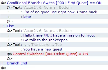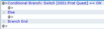 注意文本框顶部的小箭头。它们会显示文本在屏幕上的截断位置,以及你应该开始新行的位置。 第二部分:ELSE。现在我们来看条件语句的“Else”部分。在这里,我们将通过开启【第一个任务】开关来实际给予玩家任务。无需重复上述步骤,我们只需点击“Text”语句来选择最后一个文本事件(它会选中整段文本行——见图)。然后复制该文本事件,并将其粘贴到“Else”下方缩进的@符号处。现在就这么做!