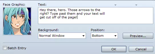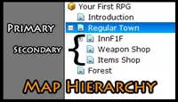 We want these shops to be child maps of the Regular Town we're using. Select that map and click "Load Map". Look for an interior map named "InnF1F". That's our Inn! Next we want to make sure the player can go inside of it and also get back out. Select the Regular Town Map. You should see an Inn already on it. Right-click the doorway. Select Quick Event Creation > Door. A menu will pop-up. Select InnF1F from the list and choose a spot you want the player to spawn at. Click OK. Now the player can walk in ...but they can't get out. Click on the InnF1F map. You're going to repeat the steps above, but at step #2 instead of selecting Door, select Transfer. We want the player to wind up back outside the Inn. Challenge Yourself. Create an Item Shop using these same steps. PLAY TEST YOUR PROGRESS. Work out any issues before continuing. Battle and Shopping It's really easy to make a game with RPG Maker, but it's a lot of work isn't it? I'm glad you're starting to see that. Most of the work with making a game is sitting down and writing down all of these ideas. Just like right now, we're going to design a simple battle encounter, complete with loot drops and dialogue. Of course, every hero needs to replenish their supplies after battle, so we'll need to have a shop ready for them as well. To Battle This time I'm going to give you the choice of where to create your next NPC. We'll use this NPC to engage in combat. I chose to put my NPC at the Inn. It doesn't get better than bar fights ...errr, at least not in our game so far! After you've created the NPC, here's some pseudocode to help you get going with it's Events. When the player collides with the NPC (touch), dialogue is initiated. Right after the NPC smack talks, start combat processing. The player should fight slimes. The player can escape combat and also continue if they lose. If the player wins, the NPC should yield and give the player some gold and loot. If the player escapes, the NPC should apologize and recommend the player visit the Item Shop. If the player loses, same as the last step. Challenge Yourself. Do you think you can set this up on your own? Give it a shot. If not the steps are below :) Create a Conditional Branch with "Set handling ..." box checked. Name the switch Bar Fight and set it to OFF. Add text that says "What are you looking at?! I'll wipe that smile off your face!" Go to Scene Control > Battle Processing. Select the first option and choose Slimes*2. Press OK. Under "If Win" create text that sais "I yield". Give the player 100g and a weapon. Under "If Win" turn ON the Bar Fight switch. Under "if Escape" create text that says "I'll let you off the hook. Visit the item shop." Under "If Escape" create a new switch named "Escaped" and set it to ON. Turn ON the Bar Fight Switch. Under "If Lose" create text that says "You're a scrub. Go to the item shop and gear up." Under "If Lose" turn ON the Bar Fight switch. For the Else statement, create text that says "Go away, I'm trying to drink!" That should do it for the combat scene. Note how turn-based combat is automatic. All you have to do is select some enemies and throw in some loot. The Shop We sent our player to the shop after the last battle, but nothing is stopping the player from visiting before then. For now, we'll just make a plain ole item shop. Go ahead and create the shop using the same steps we used to create the Inn. You should also create an NPC and place them inside the shop somewhere. Once that's all done, we'll make our new Shopkeep ready to sell you some gear! Again, time to do some planning with our pseudocode. The shopkeep should greet the player when they interact. If the player hasn't had a bar fight, the shopkeep should show them what's for sale. The shopkeep has a weapon, a potion, and a piece of armor for sale. If the player has had a bar fight, the shopkeep should acknowledge the players wounds and offer them a free potion. The shopkeep should then show the player his wares. Challenge Yourself. Create the conditional above. If you need help, just look below! Go to Flow Control > Conditional Branch. Select the Bar Fight switch to ON and check the "Set handling ..." box. Click OK. Go to Message > Show Text and type "Oh may, you have a wound. Take this potion." Click OK. Create a switch called "Free Potion" and turn it ON. Go to Scene Control > Shop Processing. By double-clicking a blank line, add 3 items to the list. Press OK. Under Else, go to Message > Show Text and type in a greeting. Copy and Paste the shop processing you created above. Click OK. Now the shopkeep is ready for business. But why did we make a new switch called Free Potion? Well, we don't want the player to get a free potion from this single bar fight FOREVER, right? So this gives us the ability to add a new events page to this NPC that, when this switch is turned on, will give the player whole new shop options. You're clever. I'm sure you can think of many scenarios you could design using more switches. Don't be afraid to experiment! PLAY TEST YOUR PROGRESS. Work out any issues before continuing. Summary You now have a playable, basic RPG. We have: Created maps. Created NPCs. Created player character. Created quests. Set switches and variables. Given the player items and gold. Created a store. Executed a combat scene. Created dialogue. These are all you need to know to start creating your first real RPG Maker games. These are the bare minimum basics. And with that, this guide has fulfilled it's purpose. I will continue to enhance it. Please leave feedback. It's always necessary to creating guides the community needs. Here's a video of what the game should be like when you're done.