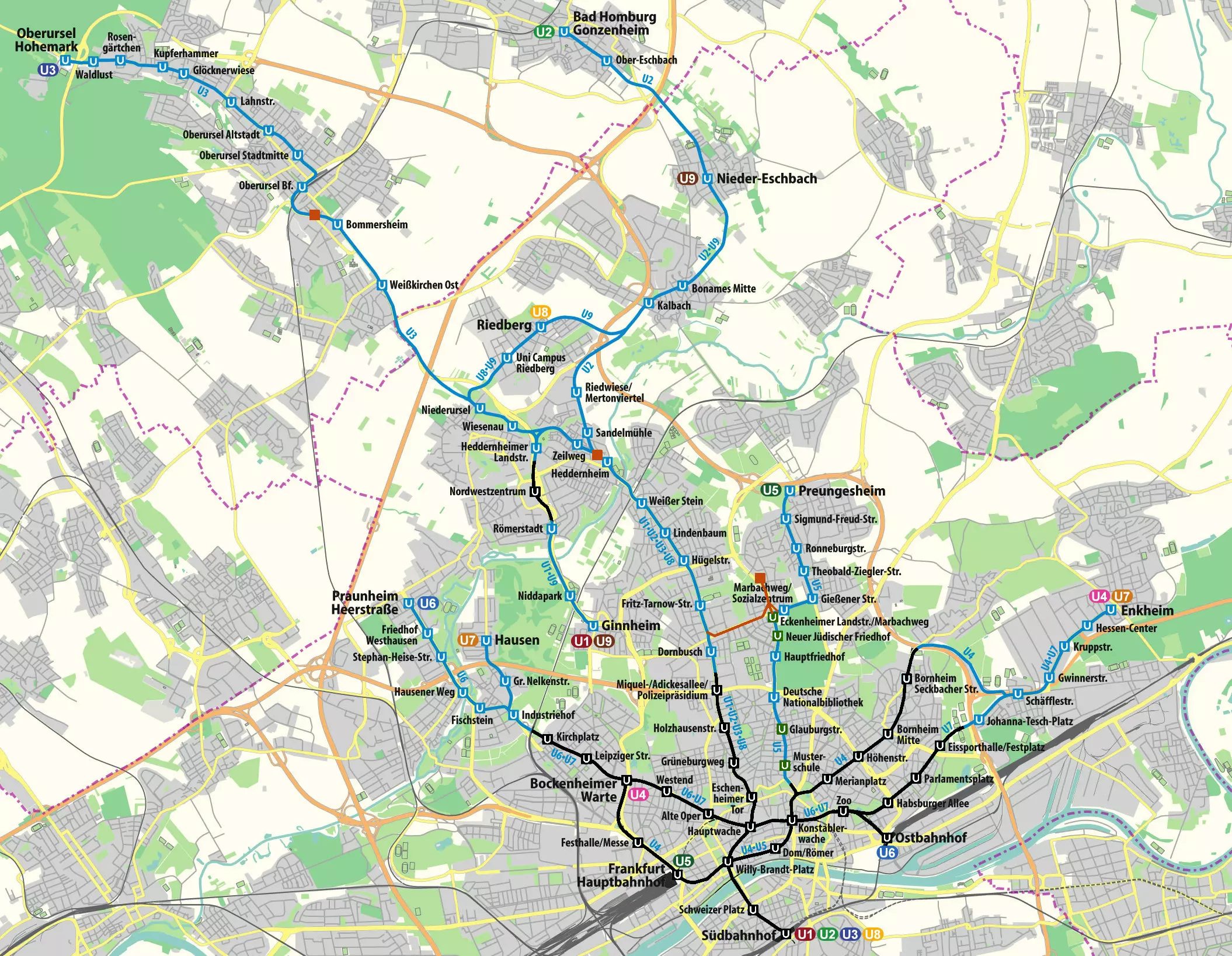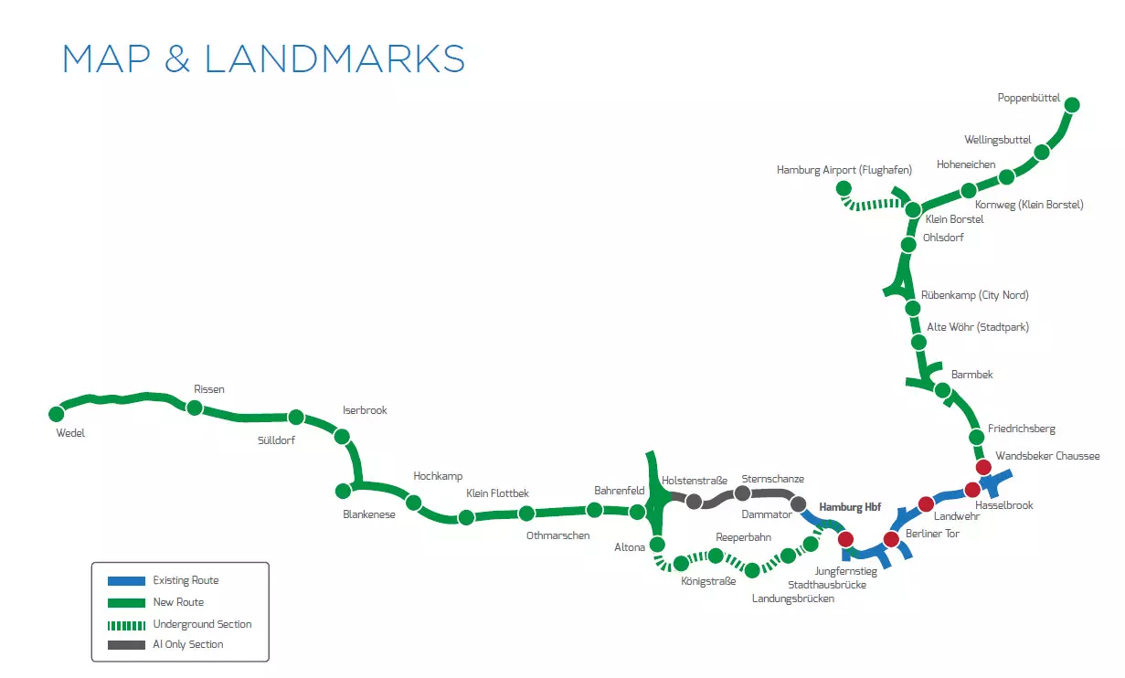 由《法兰克福地铁》的开发商带来的汉堡U1线,是德国最长的地铁线路,全长55公里。该线路大部分为地面段,周围绿树环绕,有时感觉就像一条地方铁路。在布亨坎普站和大汉斯多夫站之间为单线轨道。隧道段位于汉堡市中心以及加尔斯泰特站。我已在手册的这张地图上用黑色标记出这些隧道段。