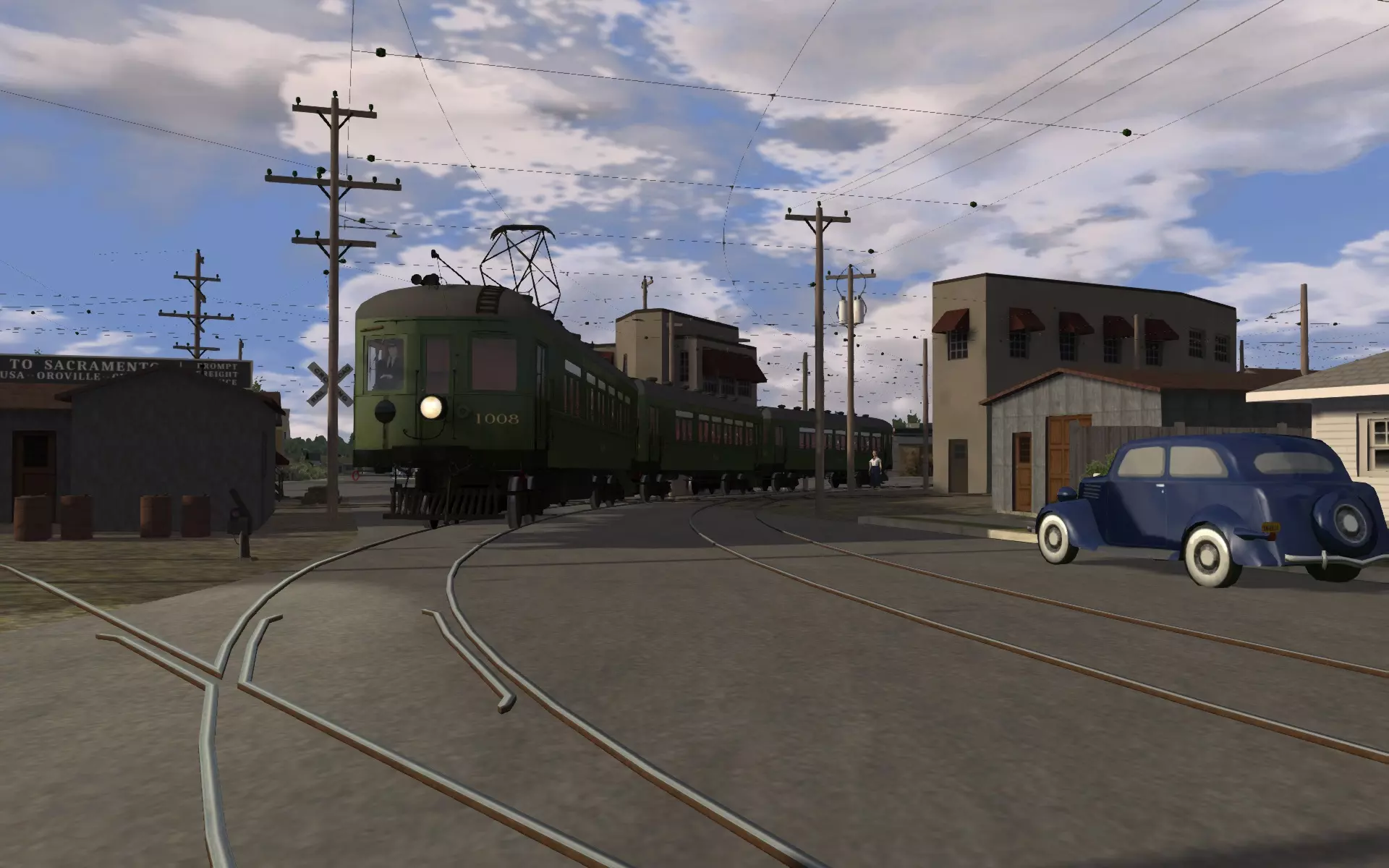这可真是独一无二。这是一项20世纪30年代末至40年代初的美国老式城际铁路服务。线路的部分路段也用于货运,使用箱式电力机车和普通铁路车厢。客运服务于1940年终止,此后该系统专门用于货运。内容详尽的手册提供了完整的历史背景以及创建逼真场景的说明。萨克拉门托北方铁路是一项区域性的半长途服务,包含部分街道运行路段。车站之间的距离相当远。乘客直接从地面登上列车,无需使用站台。 该服务包含四种车辆,其中两种仅供AI使用。我个人认为它们的外观和音效表现不太理想。远处的车辆噪音过大,而且火车停下后刹车仍持续发出刺耳的 squealing 声。 这条线路设有一个带掉头环线的主车站。其中包含一段长长的桥梁区域,该区域使用了 cab-signalling 系统。过了桥梁后,会有一段在街道上行驶的路段,Key System 有轨电车(遗憾的是,这些电车仅为 AI 控制)会在其间穿梭。再之后是一段多弯且多坡的轨道,最终线路会变得相对笔直和平坦。线路最高限速可达 80 英里/小时,但车辆实际只能达到 60 英里/小时。 与现实情况一样,车辆未配备速度表。在使用 cab-signalling 系统的区域,该系统会防止你超速。而在路线的其他部分,你只能自行估算速度。路线的部分路段限速高达80英里/小时,但这些路段可能仍存在弯道,当车速超过40或50英里/小时时,乘客会感到不适。确保旅途平稳完全取决于司机。这让这条路线感觉非常复古,还有点不安全,我喜欢这种感觉。 Frankfurt U-Bahn II(路线和车辆,付费内容)