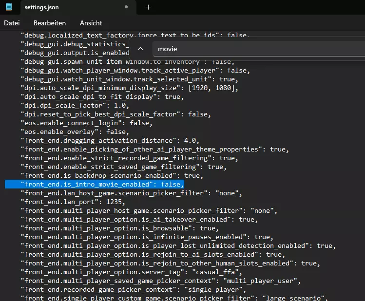 使用搜索功能(CTRL+F)查找包含“movie”的内容,具体为“front_end.is_intro_movie_enabled”: true,,并将其中的true改为false,使其变为“front_end.is_intro_movie_enabled”: false,