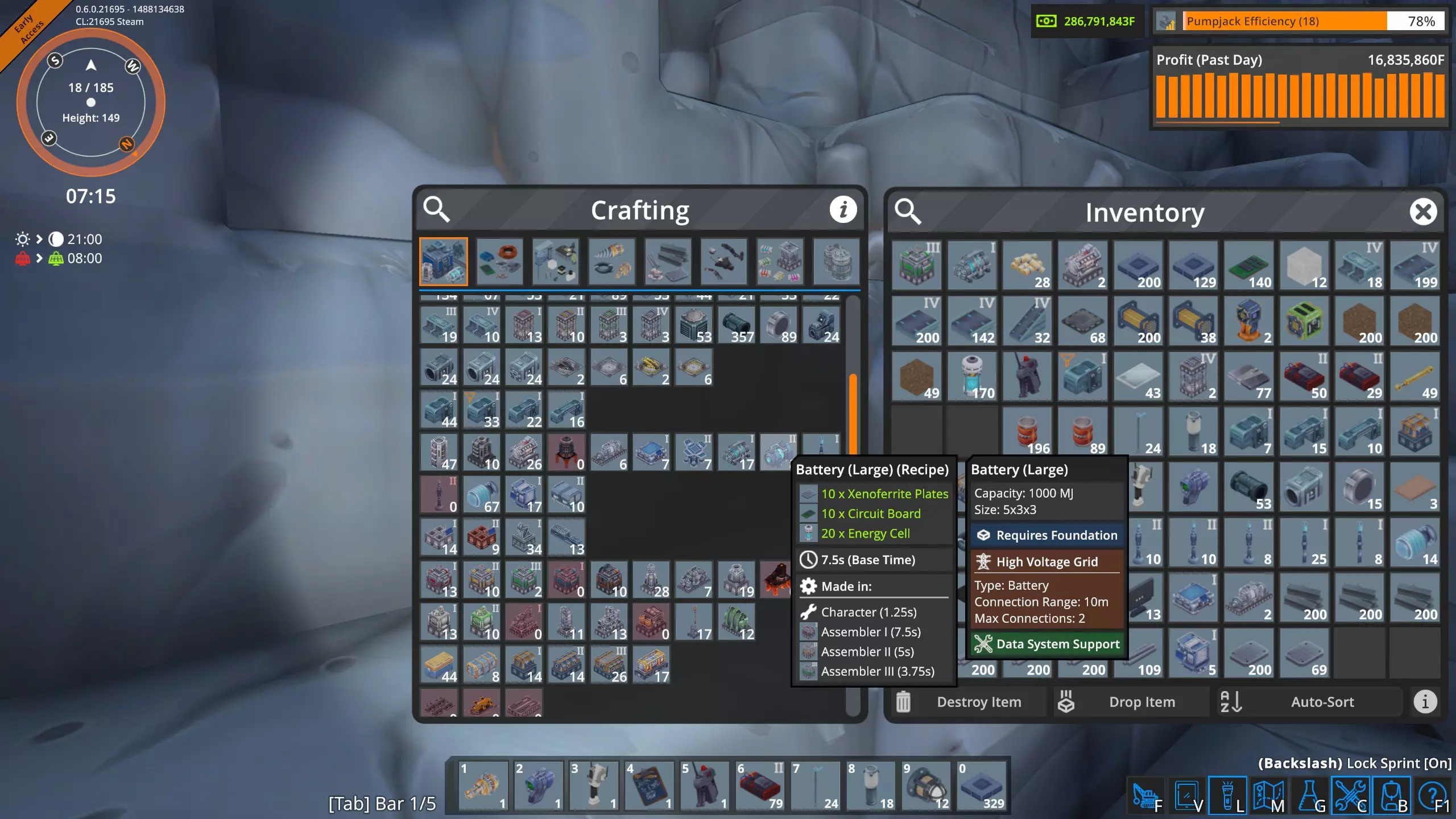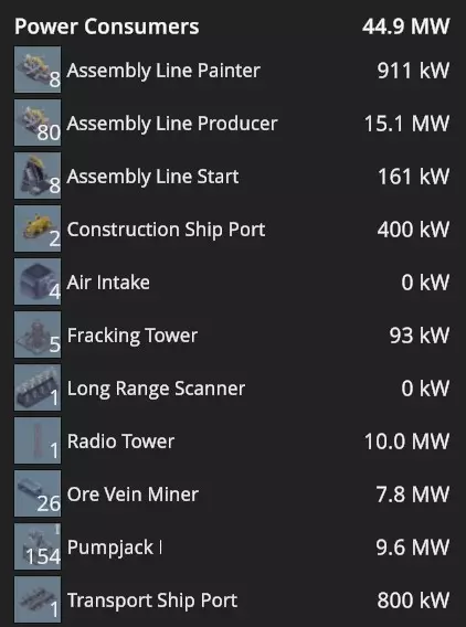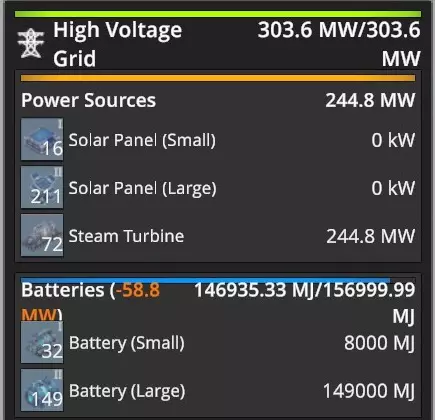 左侧图片展示了我当前的发电结构。顶部显示,目前我的HVG(高压电网)正在产生303.6兆瓦电力。其中244.8兆瓦来自蒸汽轮机,其余58.8兆瓦由电池提供。 电池的最大储能容量为157,000兆焦。由于电网的电力需求高于蒸汽轮机的供应量,目前电池储能略低于147,000兆焦。 在《FOUNDRY》的“电力来源”部分,我们介绍了可用于发电的不同结构。如前所述,只有蒸汽轮机、电池和太阳能电池板会为HVG供电,且太阳能电池板仅在白天工作,白天时长为24小时中的11小时。所以在夜间拍摄这张截图时,电池正在弥补涡轮机的电力缺口。 我得承认,我之前对电池的理解有些混乱。我一直以为电池能产生固定数量的兆瓦,这样就能计算出所有电池的续航时间。但《FOUNDRY》的机制并非如此。电池储存的是一定量的能量,单位是兆焦耳。而在游戏(以及现实生活)中,1兆瓦等于1兆焦耳每秒。 在上面的图片中,电池正以58.8兆瓦的负载放电,这意味着电池每秒会消耗58.8兆焦耳的能量。在铸造厂夜晚期间(现实世界时长约975秒),电池会损失58.8×975,即57330兆焦能量。正如我所指出的,电池的最大容量为157000兆焦,这意味着在正常夜晚,电池会损失约三分之一的储存能量。 不久前,我经历了一个不寻常的铸造厂夜晚。天黑前,我不小心切断了为蒸汽轮机供料的传送带,却没有注意到。由于没有来自轮机的电力,电池开始以惊人的速度耗电,试图为工厂所需的数百兆瓦电力供电。它们没撑多久,我就陷入了一片黑暗。我会尽量避免再犯这种错误!在《熔炉》中,电池在供电时会以最快速度充电,在放电时也会以最快速度耗电。电池的充放电功率没有上限。 举个例子,我做了一个测试:切断为工厂主要供电的60多台锅炉和蒸汽轮机所在地基的电力,导致装载机停止供应燃料。我特意在夜间进行测试,以避免太阳能电池板供电。此时,工厂约250兆瓦以上的大部分电力需求由149个大型电池和32个小型电池提供。这些电池迅速开始输出所需的250兆瓦以上电力,同时电池电量也迅速开始耗尽。 我做了一些计算。正如我之前提到的,正常情况下,我的电池在夜间的自然耗电会损失约35%的总电量。如果保持这个耗电速度,电池大约能持续45分钟。然而,当这么多涡轮机离线后,我计算出即使电池满电开始,也无法撑过16分钟的夜晚。它们大约10分钟就会完全耗尽,耗电速度大约快了四到五倍。这让我们了解到电池的耗电速度有多快。 电力去向何方? 电网信息显示也会显示电力的去向。