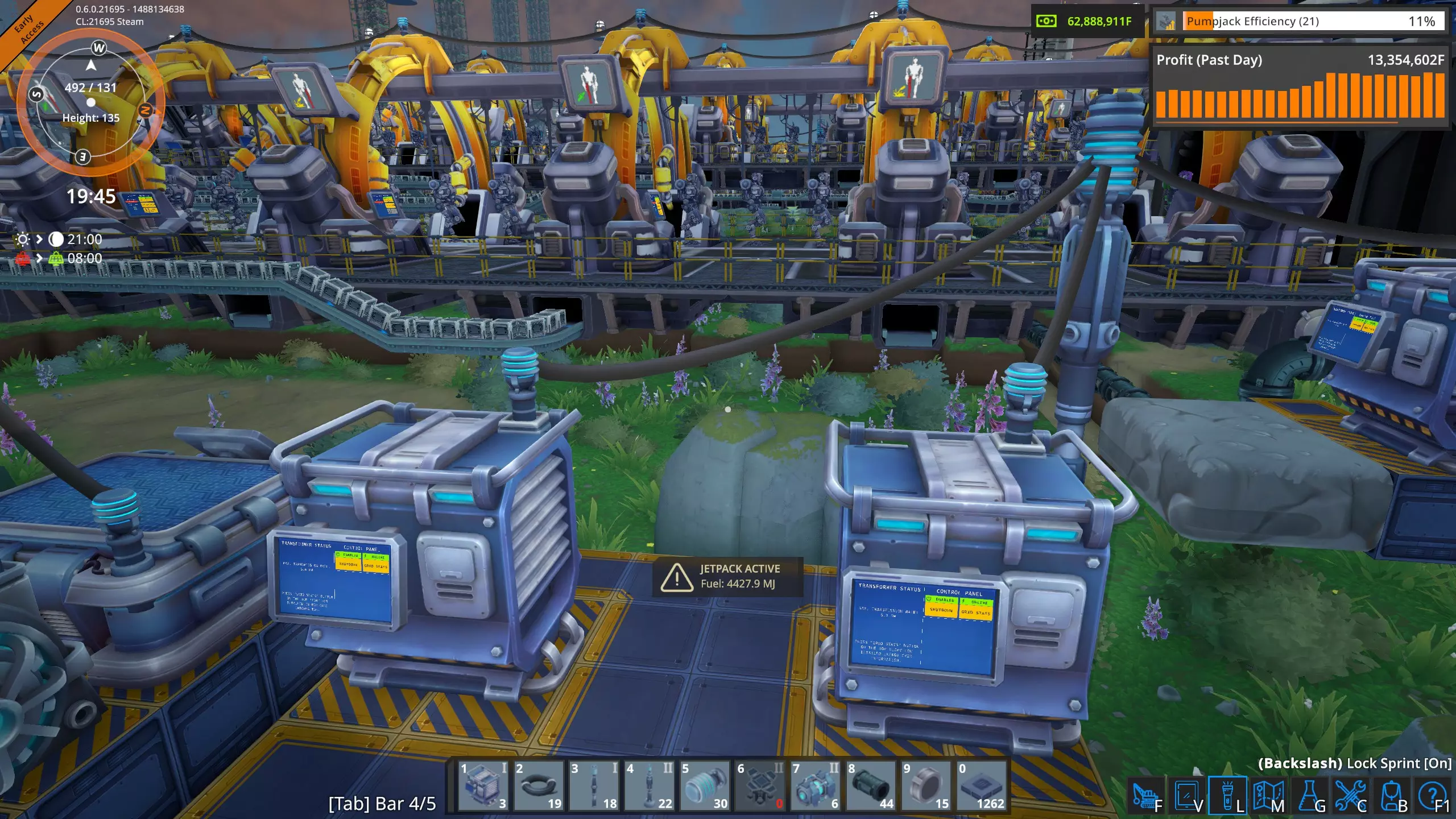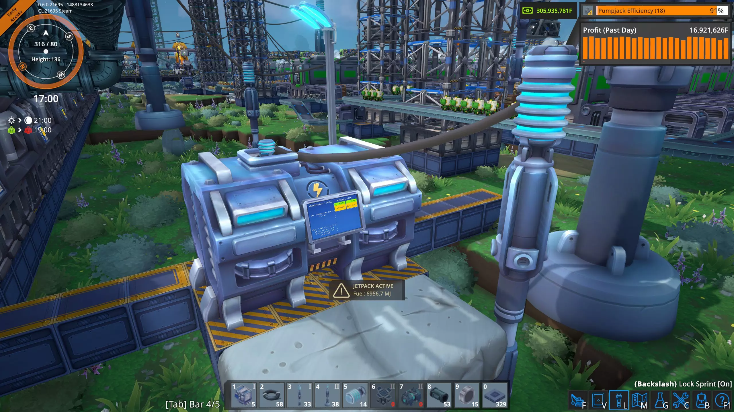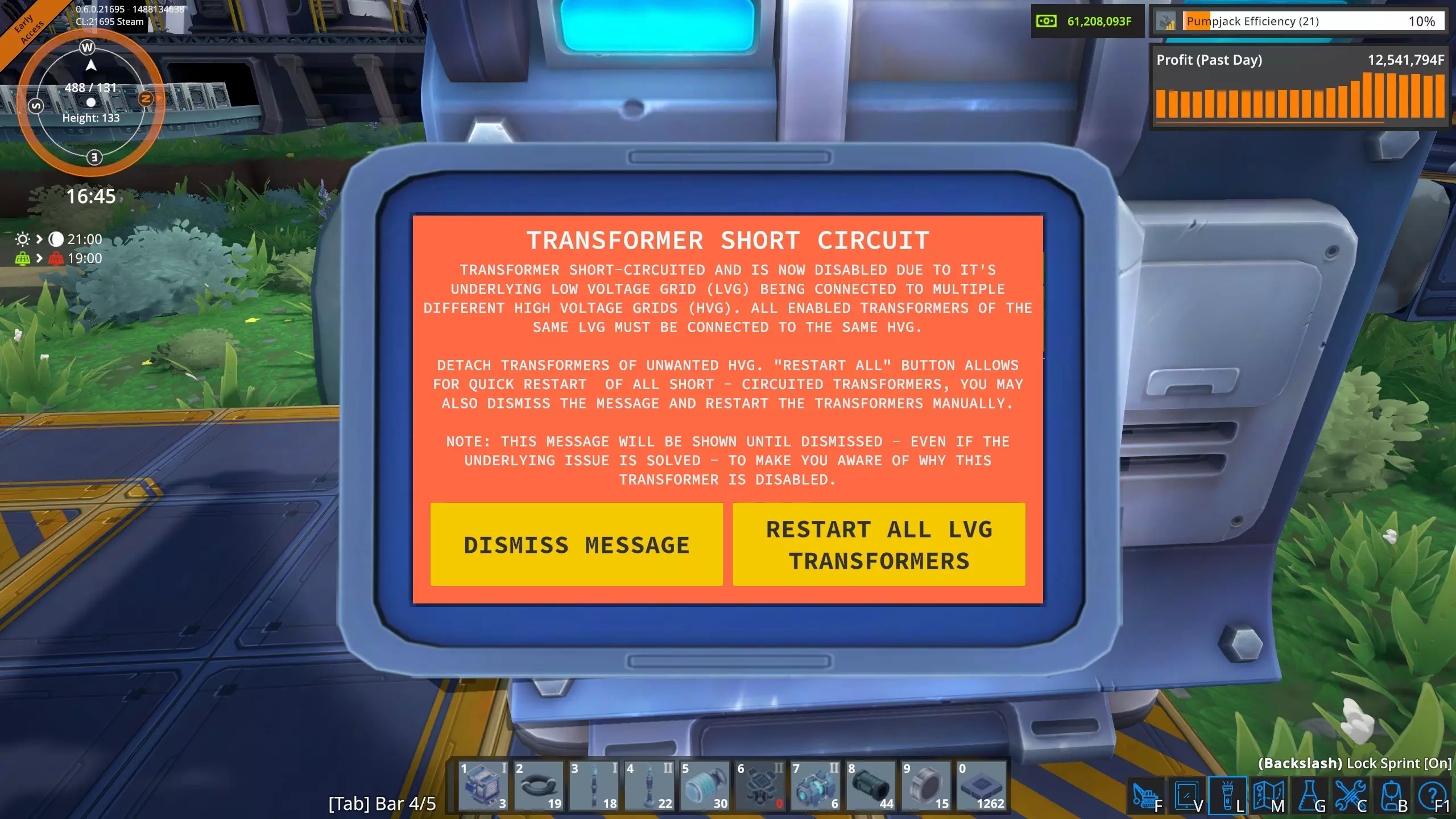虽然大多数时候你的变压器会连接到主高压电网,但有时你可能只想使用电池、太阳能电池板和变压器为低压电网供电。这里我正在为三个泵提供低压电网电力。 变压器短路(橙色死亡屏幕) 有一种情况我遇到过几次。这种情况相当罕见,但确实可能发生。那就是当一个基础电网同时从两个独立的高压电网接收低压电网电力时。我举这个例子是为了解释这种情况。