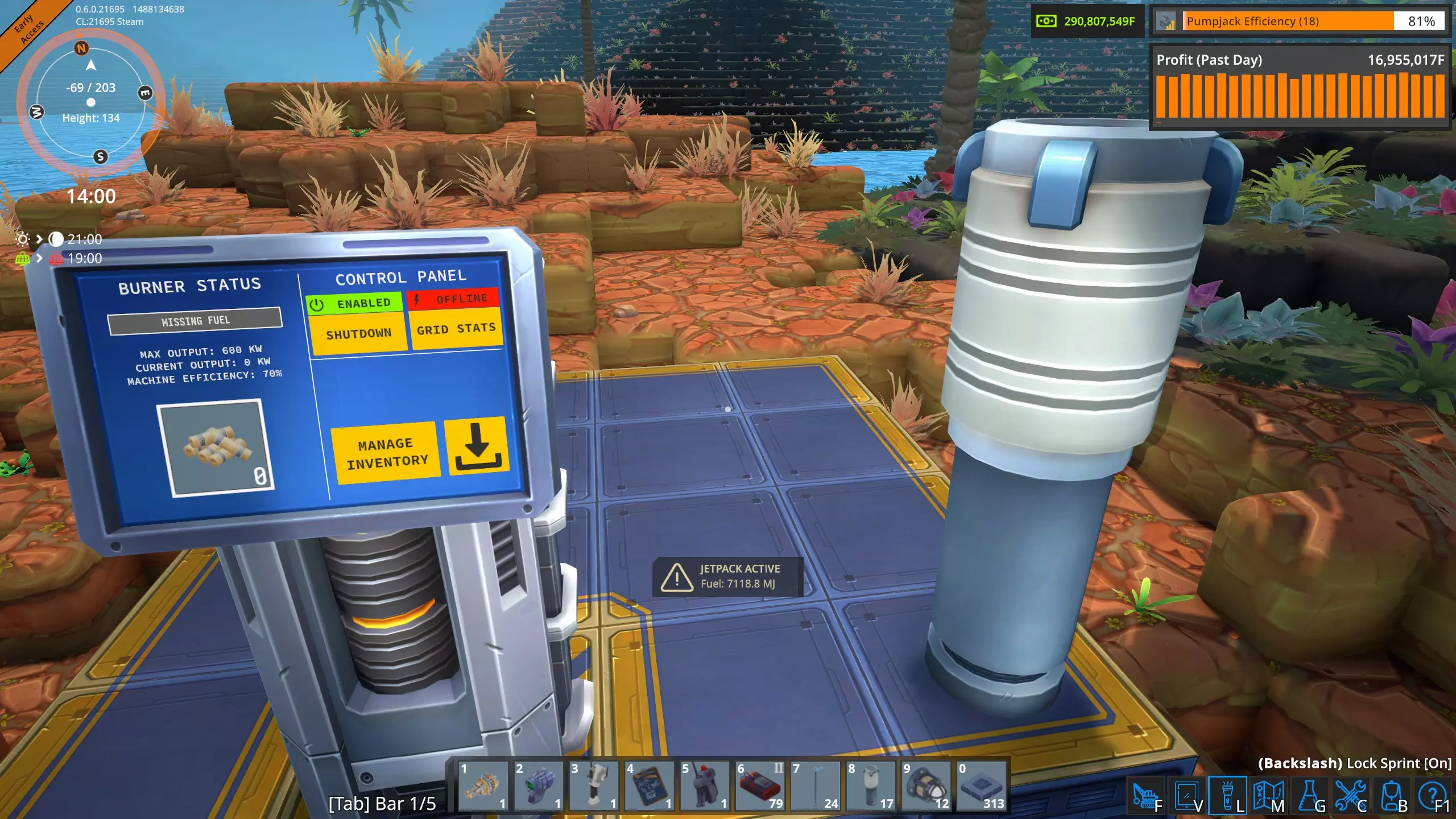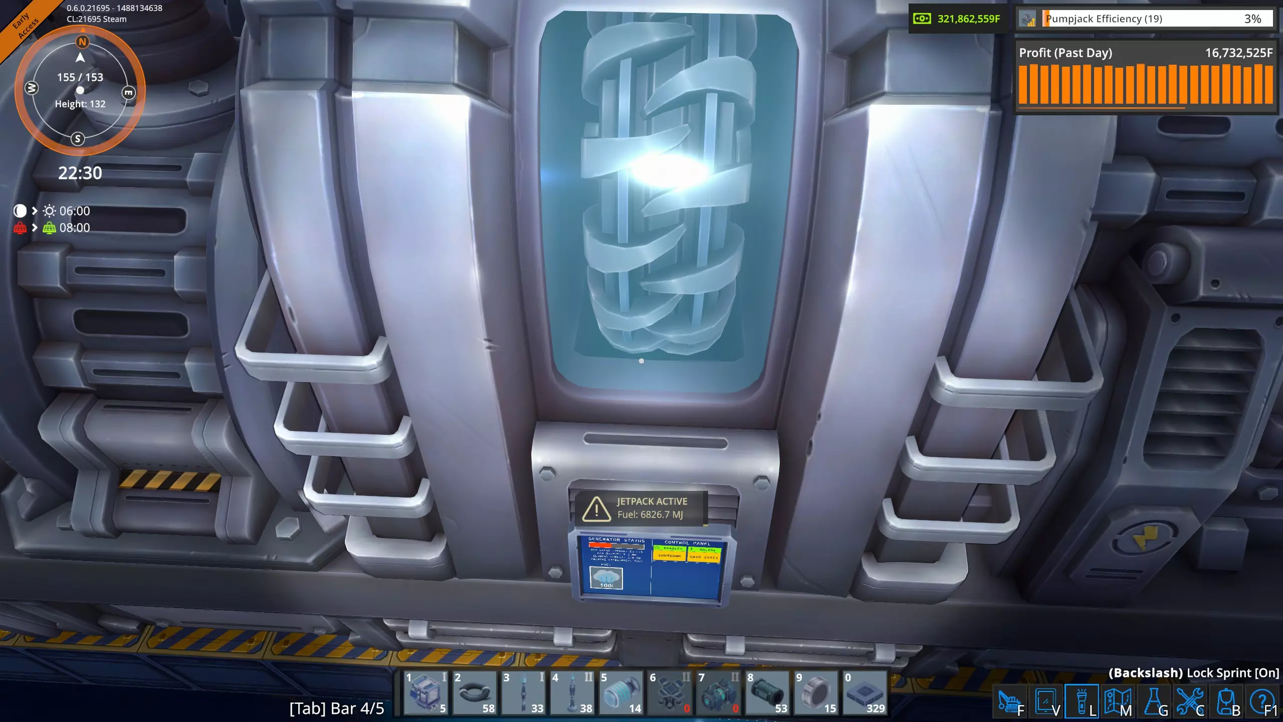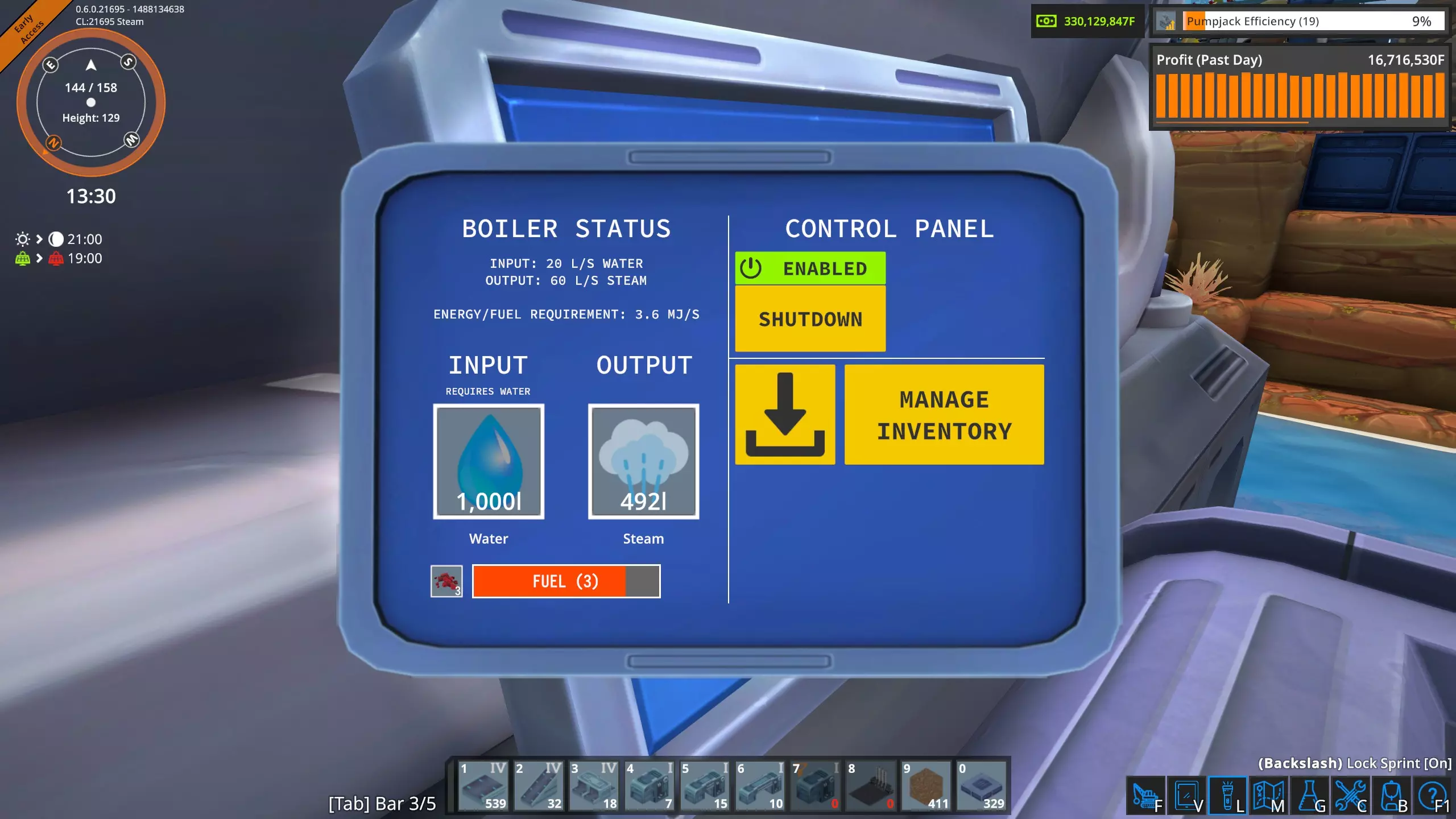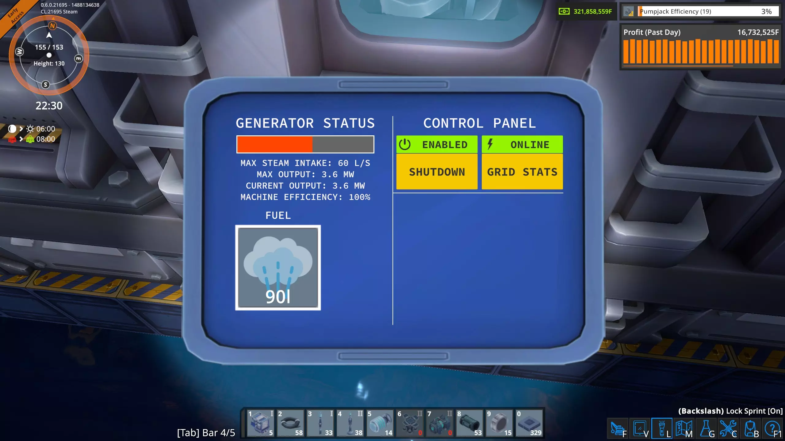 一个锅炉的操作面板。注意上面显示它需要3.6兆焦/秒的燃料,也就是216兆焦/分钟。然而,我的测试显示在满负荷状态下,锅炉的实际燃烧速率为170兆焦/分钟,但涡轮机仍然能输出3.6兆瓦的电力。这表明【燃金矿】(非燃金石)的能量产出约为16兆焦。