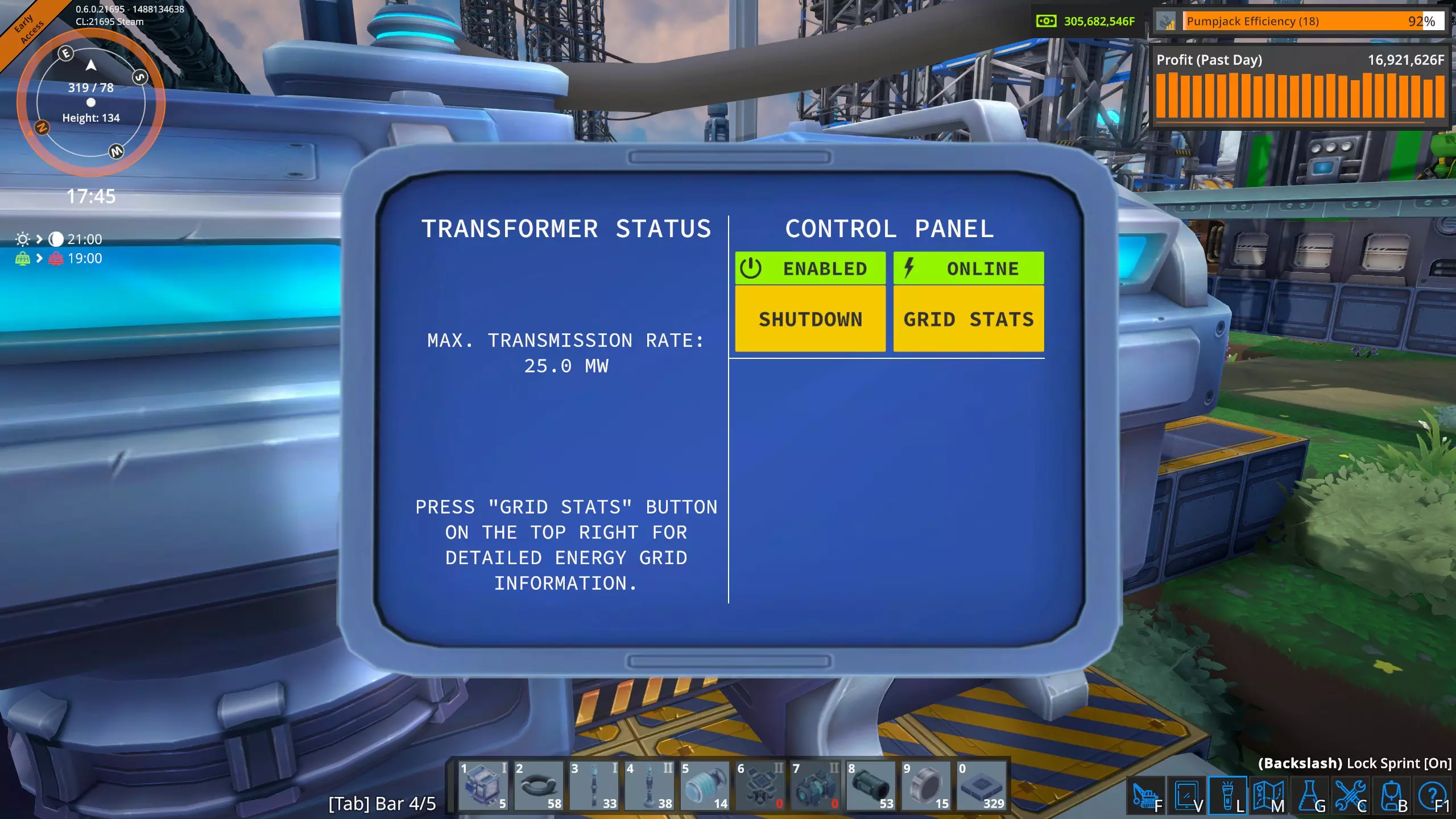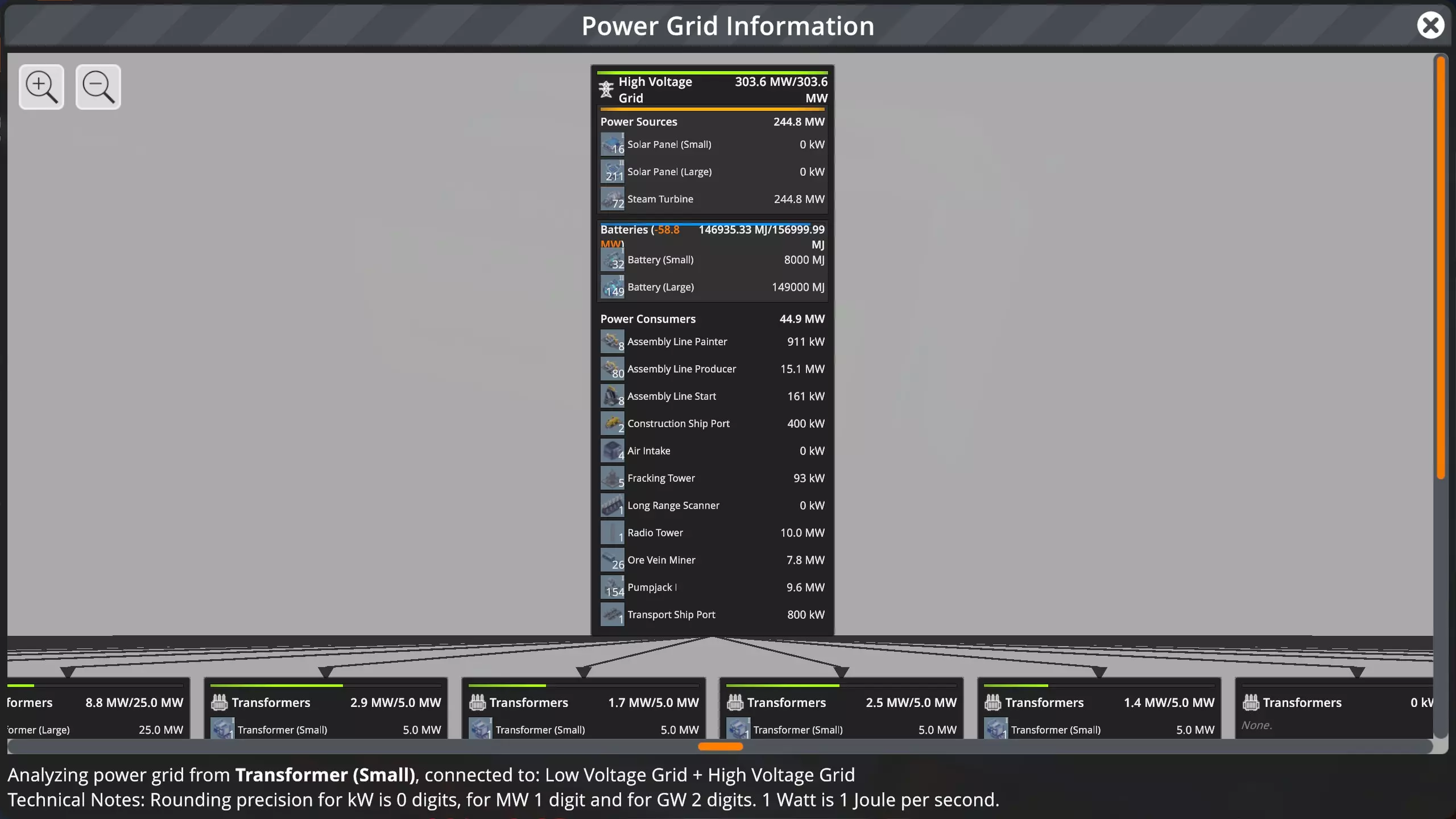 点击面板上的【电网统计】按钮会打开电网信息界面。遗憾的是,该界面不会自动跳转到我当前查看的变压器。我必须四处查找并找到带有橙色轮廓的那个。可以看到,这个变压器仅从高压电网(HVG)抽取两兆瓦电力。下方的方框显示了低压电网的电力使用情况。