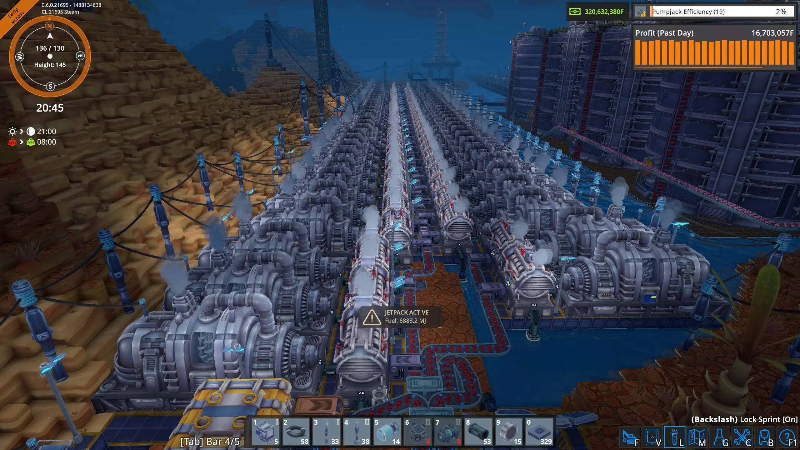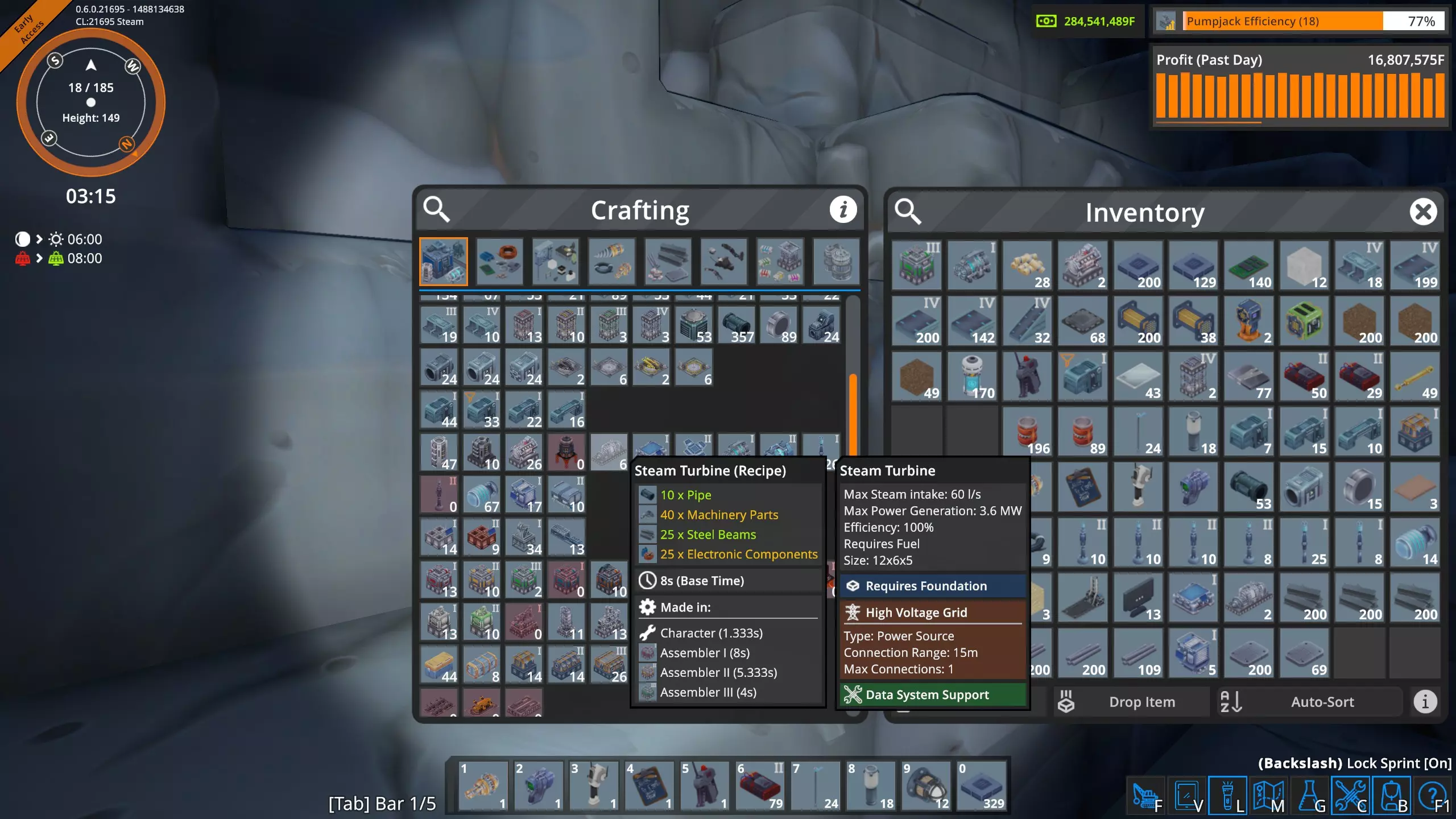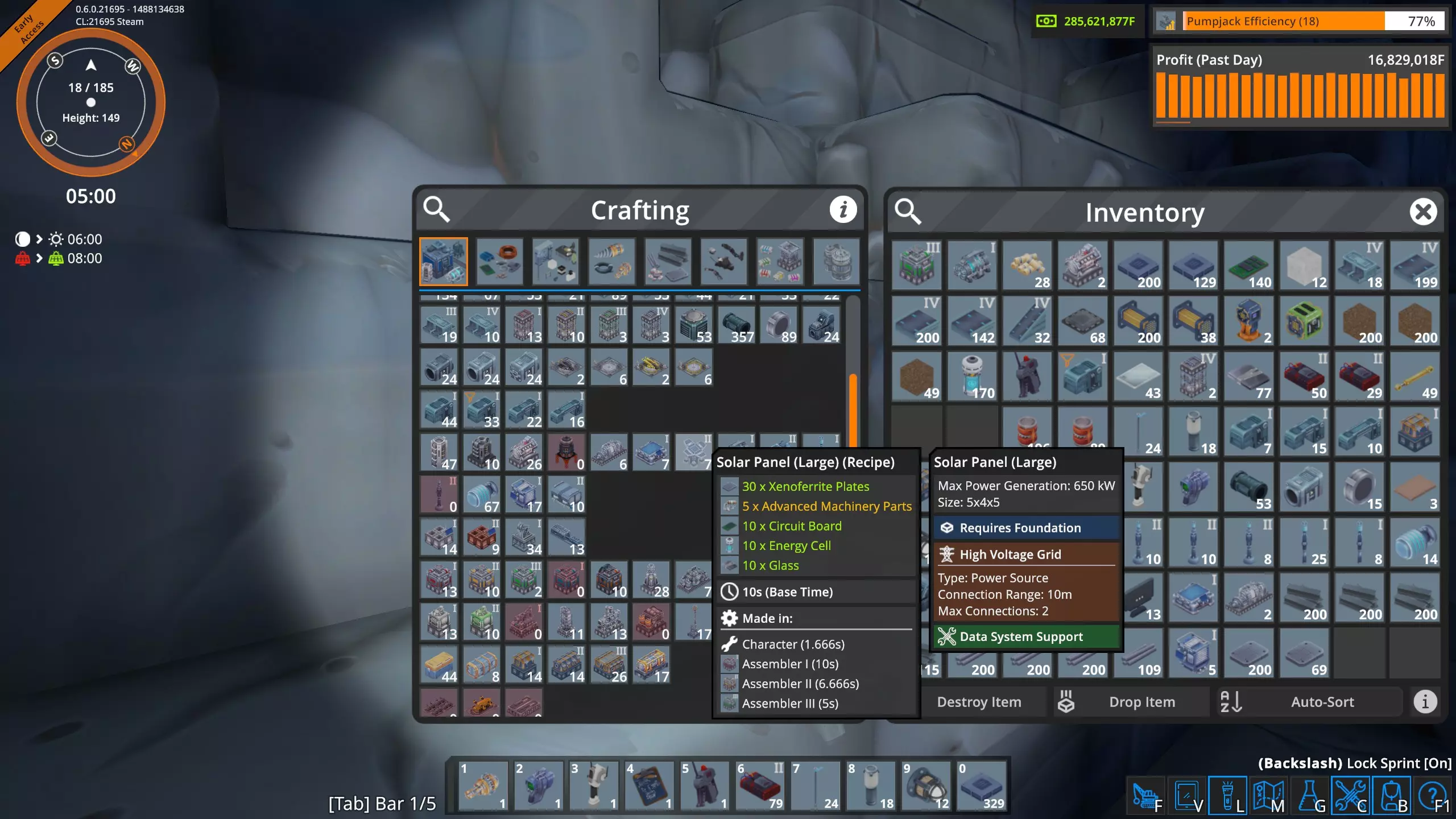 在这张图片中,我们可以看到由高压电网(HVG)直接供电的建筑。这是电力用户的瞬时快照,数值会有所波动。这些建筑消耗了工厂总用电量300兆瓦中的约45兆瓦。 其余250多兆瓦的电力被输送到工厂各处的变压器。遗憾的是,目前电力电网信息显示界面不支持以下操作:点击该界面上的变压器查看其在地图上的位置,也无法在工厂中点击变压器后直接在电力电网信息显示界面查看对应位置。更遗憾的是,当你在游戏世界中处于变压器旁时,无法查看它的实际耗电量。希望未来某个时候这些功能能被添加到游戏中。 我真的需要电池和太阳能板吗? 简单来说,不需要,游戏中没有任何机制强制你使用它们。不过,当你添加新的生产建筑时,它们有助于避免能源短缺。但你能在工厂中完全使用太阳能吗? 我目前的工厂大约消耗300兆瓦,我计算了一下,要在白天持续供应300兆瓦,需要多少大型太阳能板和大型电池,再加上夜间提供300兆瓦所需的足够电池,以及白天为电池充电所需的额外太阳能板。持续电力需求:300兆瓦 昼夜周期总计:1800秒(30分钟) 白天时长:825秒 夜晚时长:975秒 大型太阳能电池板输出:白天持续650千瓦(0.65兆瓦) 大型电池容量:1000兆焦 完整1800秒周期内所需总能量为: 300兆瓦×1800秒=540,000兆焦 太阳能电池板需在白天(825秒)内产生全部能量。 白天所需平均功率=总能耗/白天时长 白天所需平均功率=540,000兆焦/825秒=654.545兆瓦 由于每个大型太阳能电池板白天产生0.65兆瓦电力 电池板数量=所需平均功率/单块电池板功率 电池板数量=654.545兆瓦/0.65兆瓦=1007(向上取整),因此,我需要1007个大型太阳能电池板。 电池必须储存足够的能量,以在整个夜间(975秒)为工厂供电。 电池所需能量=持续电力需求×夜间时长 电池所需能量=300兆瓦×975秒=292500兆焦 每个大型电池可储存1000兆焦,因此所需电池数量为: 电池数量=电池所需能量/单个电池容量 电池数量=292500兆焦/1000兆焦=292.5(向上取整),因此,我需要293个大型电池。在《熔炉》中要持续提供300兆瓦电力,我需要: 1007个大型太阳能电池板 293个大型电池 目前我只有211个大型太阳能电池板和149个大型电池,所以短期内我不打算完全使用太阳能! 高压电网的大部分电力来自锅炉和蒸汽轮机。