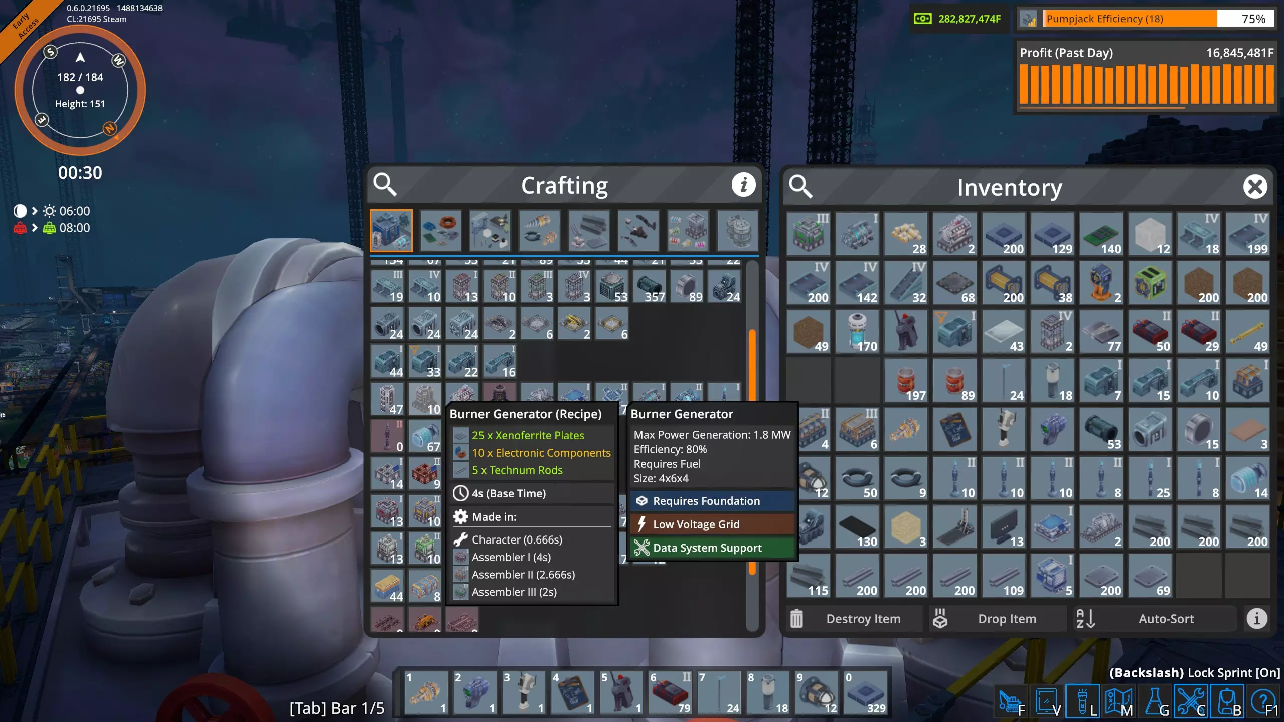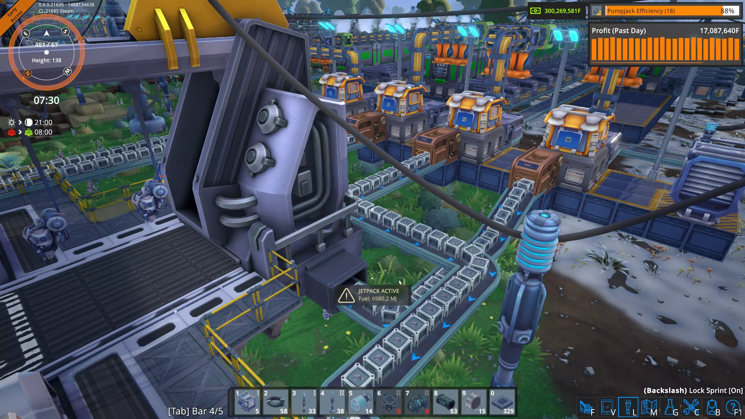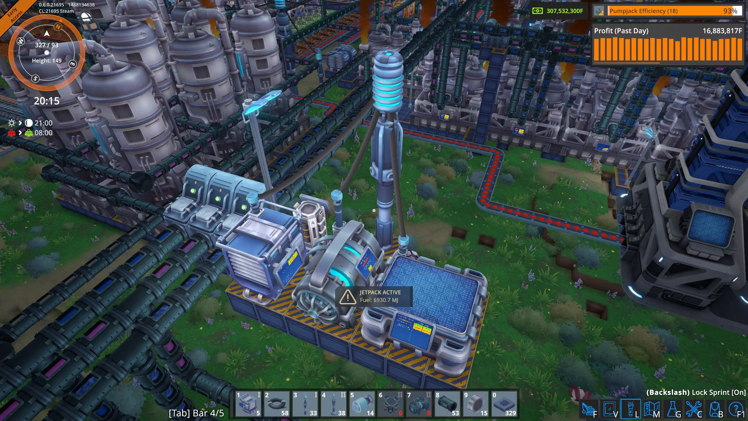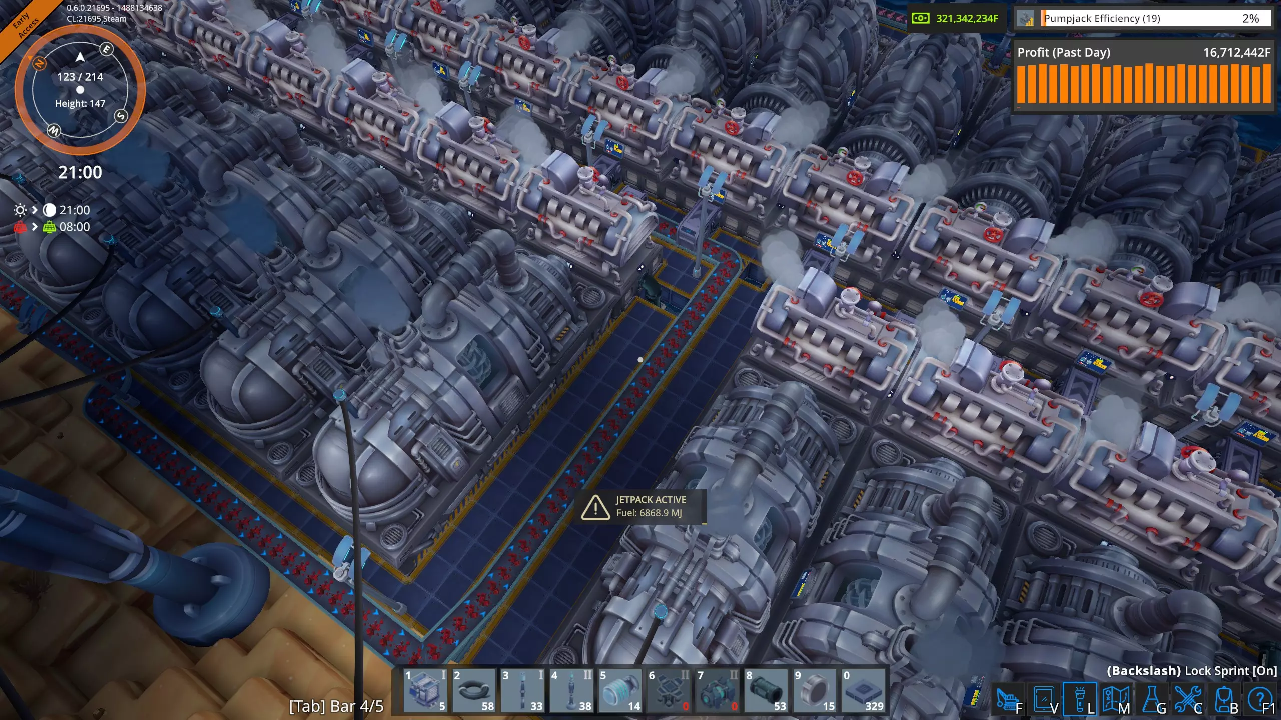 在这张图片中,我们可以看到由高压电网(HVG)直接供电的建筑。这是电力用户的瞬时快照,数值会有所波动。这些建筑消耗了工厂总用电量300兆瓦中的约45兆瓦。 其余250多兆瓦的电力被输送到工厂各处的变压器。遗憾的是,目前电力电网信息显示界面不支持以下操作:点击该界面上的变压器查看其在地图上的位置,也无法在工厂中点击变压器后直接在电力电网信息显示界面查看对应位置。更遗憾的是,当你在游戏世界中处于变压器旁时,无法查看它的实际耗电量。希望未来某个时候这些功能能被添加到游戏中。 我真的需要电池和太阳能板吗? 简单来说,不需要,游戏中没有任何机制强制你使用它们。不过,当你添加新的生产建筑时,它们有助于避免能源短缺。但你能在工厂中完全使用太阳能吗? 我目前的工厂大约消耗300兆瓦,我计算了一下,要在白天持续供应300兆瓦,需要多少大型太阳能板和大型电池,再加上夜间提供300兆瓦所需的足够电池,以及白天为电池充电所需的额外太阳能板。持续电力需求:300兆瓦 昼夜周期总计:1800秒(30分钟) 白天时长:825秒 夜晚时长:975秒 大型太阳能电池板输出:白天持续650千瓦(0.65兆瓦) 大型电池容量:1000兆焦 完整1800秒周期内所需总能量为: 300兆瓦×1800秒=540,000兆焦 太阳能电池板需在白天(825秒)内产生全部能量。 白天所需平均功率=总能耗/白天时长 白天所需平均功率=540,000兆焦/825秒=654.545兆瓦 由于每个大型太阳能电池板白天产生0.65兆瓦电力 电池板数量=所需平均功率/单块电池板功率 电池板数量=654.545兆瓦/0.65兆瓦=1007(向上取整),因此,我需要1007个大型太阳能电池板。 电池必须储存足够的能量,以在整个夜间(975秒)为工厂供电。 电池所需能量=持续电力需求×夜间时长 电池所需能量=300兆瓦×975秒=292500兆焦 每个大型电池可储存1000兆焦,因此所需电池数量为: 电池数量=电池所需能量/单个电池容量 电池数量=292500兆焦/1000兆焦=292.5(向上取整),因此,我需要293个大型电池。在《熔炉》中要持续提供300兆瓦电力,我需要: 1007个大型太阳能电池板 293个大型电池 目前我只有211个大型太阳能电池板和149个大型电池,所以短期内我不打算完全使用太阳能! 高压电网的大部分电力来自锅炉和蒸汽轮机。