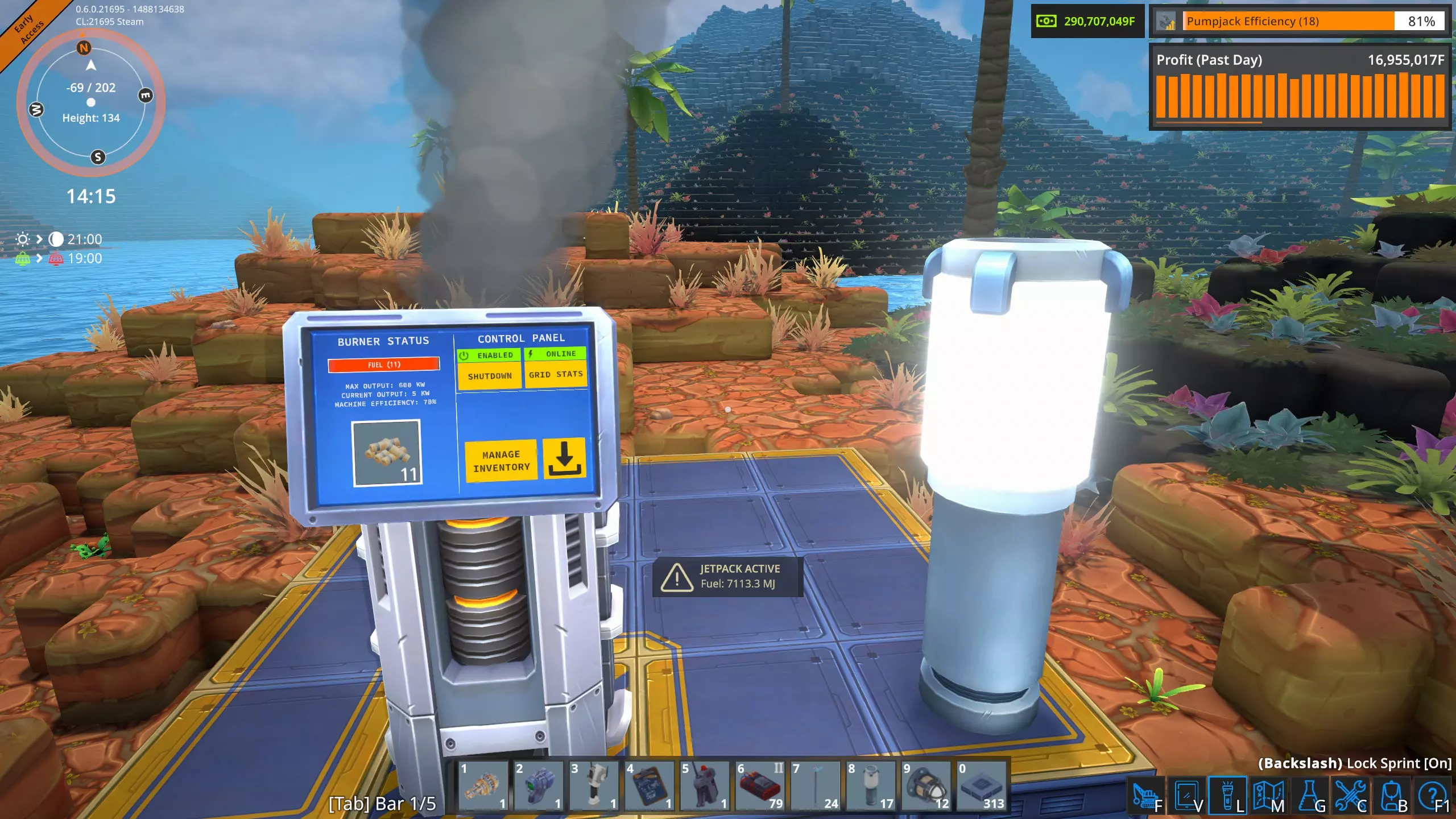 我在60多个锅炉和蒸汽轮机的地基上放置了这两个生物质燃烧器。只要地基有LVG电力供应,这些燃烧器就会保持关闭状态。但如果我不小心移除了为该地基变压器供电的电线或电杆,这两个生物质燃烧器就会启动,以保持装载机运转,为锅炉提供燃料。 总结 在《熔炉》中发电和配电是一项非常有趣的挑战。我所展示的是我应对挑战的方法,但还有其他方法。你可以尝试完全使用太阳能和电池的绿色能源方案。或者你可以在锅炉中燃烧更高能量的燃料,比如用奥鲁石制成的便携燃料,这样所需的燃料就会更少。或者,如果你或许更聪明的话,你可以想出一个我甚至都没想过的解决方案!