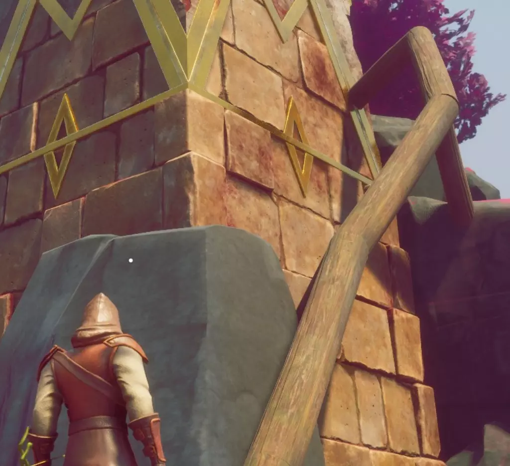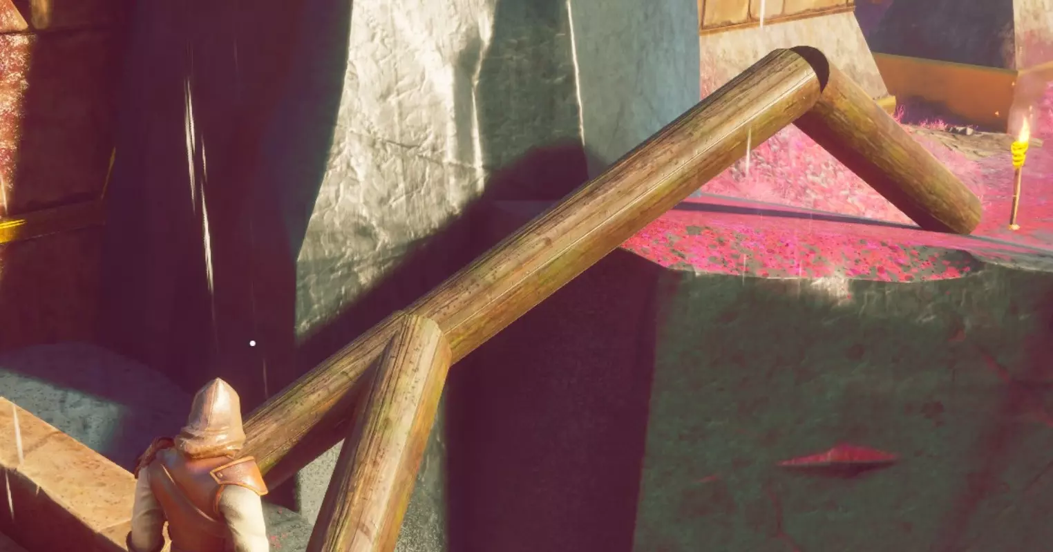 接下来要决定的是如何进入神殿。营地内敌人众多,巡逻路线相互重叠。高处有狙击手,地面上则有近战敌人和法师。你是选择悄悄潜入还是强行突破? 悄悄潜入: 搭建一条通往山顶的路径。如果你需要木材,刚经过的区域有很多树木。