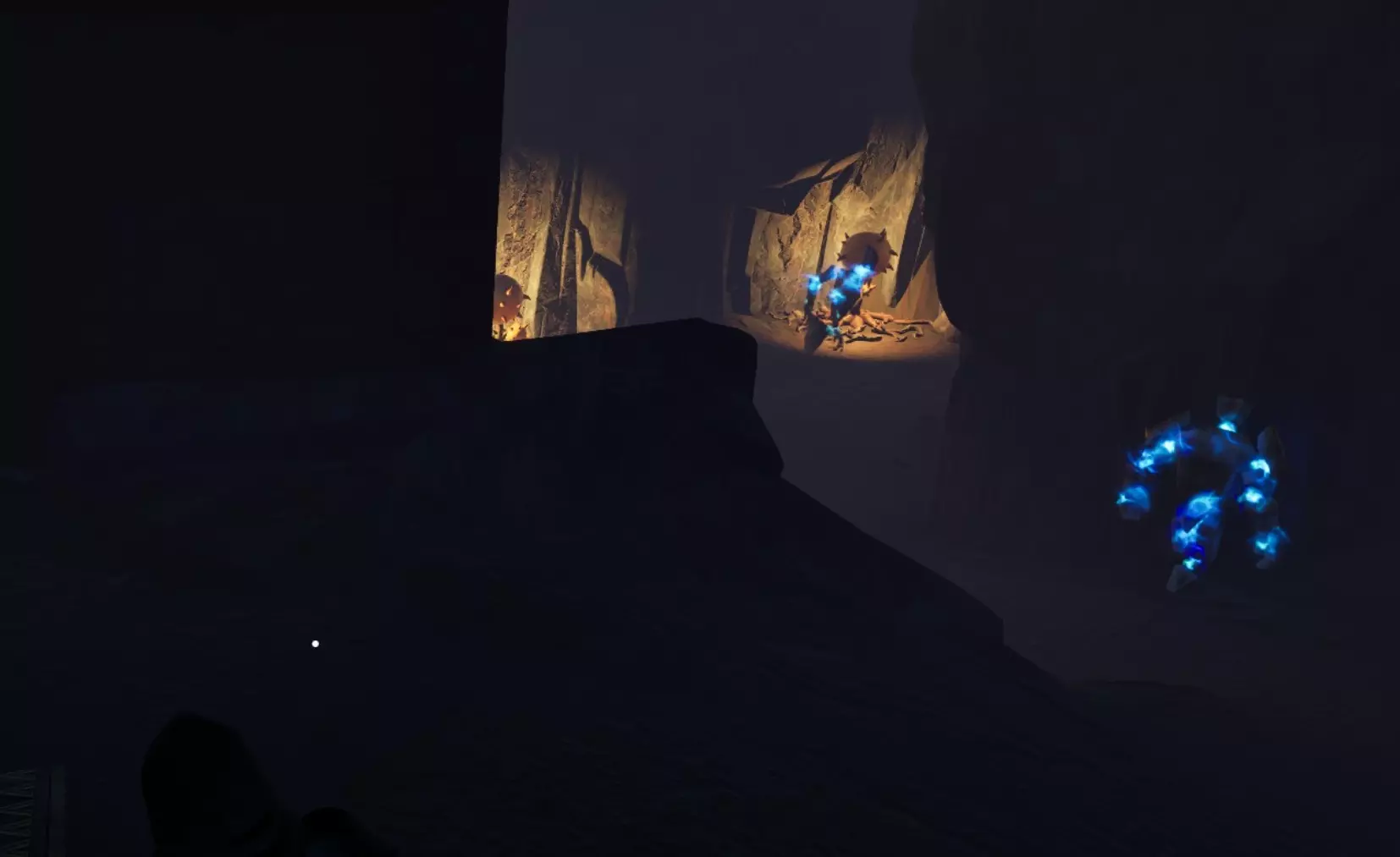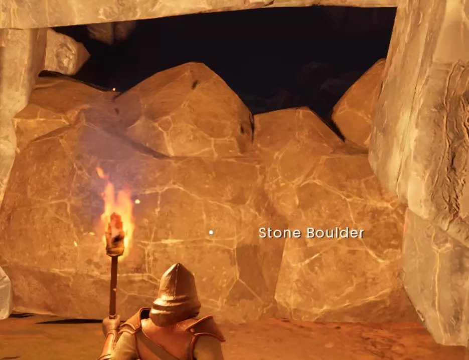 向右走过水域,在另一堵可破坏的墙后面有一个铜矿节点、一些砂岩和一株 dwellberry 植物。