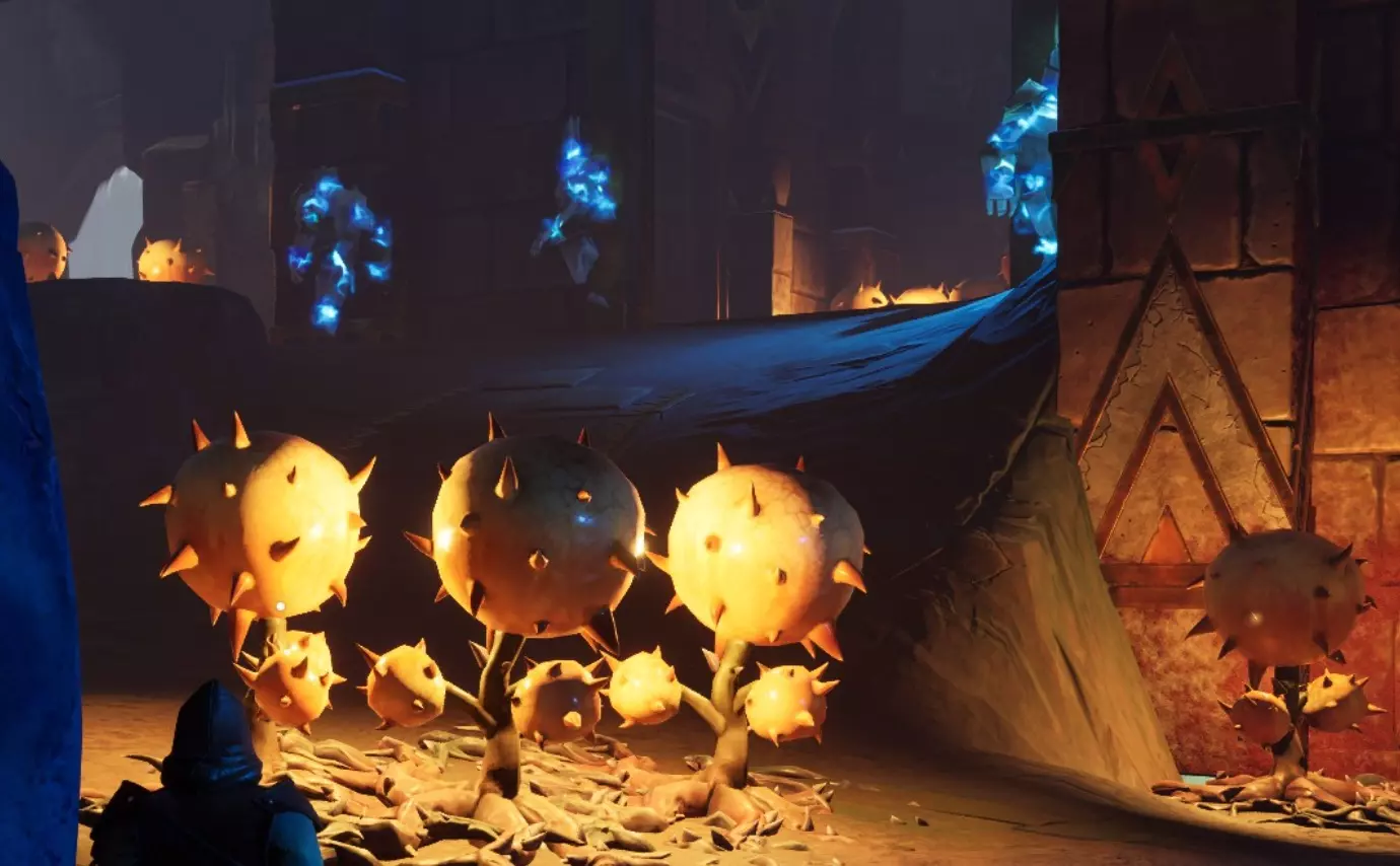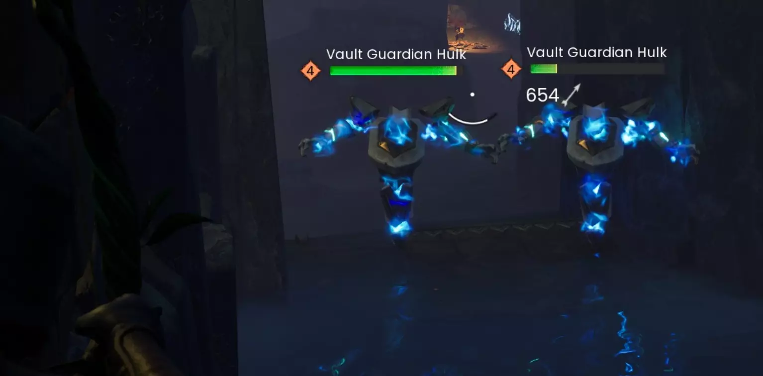 狙击点上方有一个区域,使用【风步】法术可以进入,在那里你会找到一个宝箱。再次使用【风步】到另一边的岩架上,你会发现3个铜矿节点和一些符文精华。在跳过去之前,一定要先射击爆炸植物。 继续深入宝库 穿过水域,宝库会通往一个巨大的洞穴。