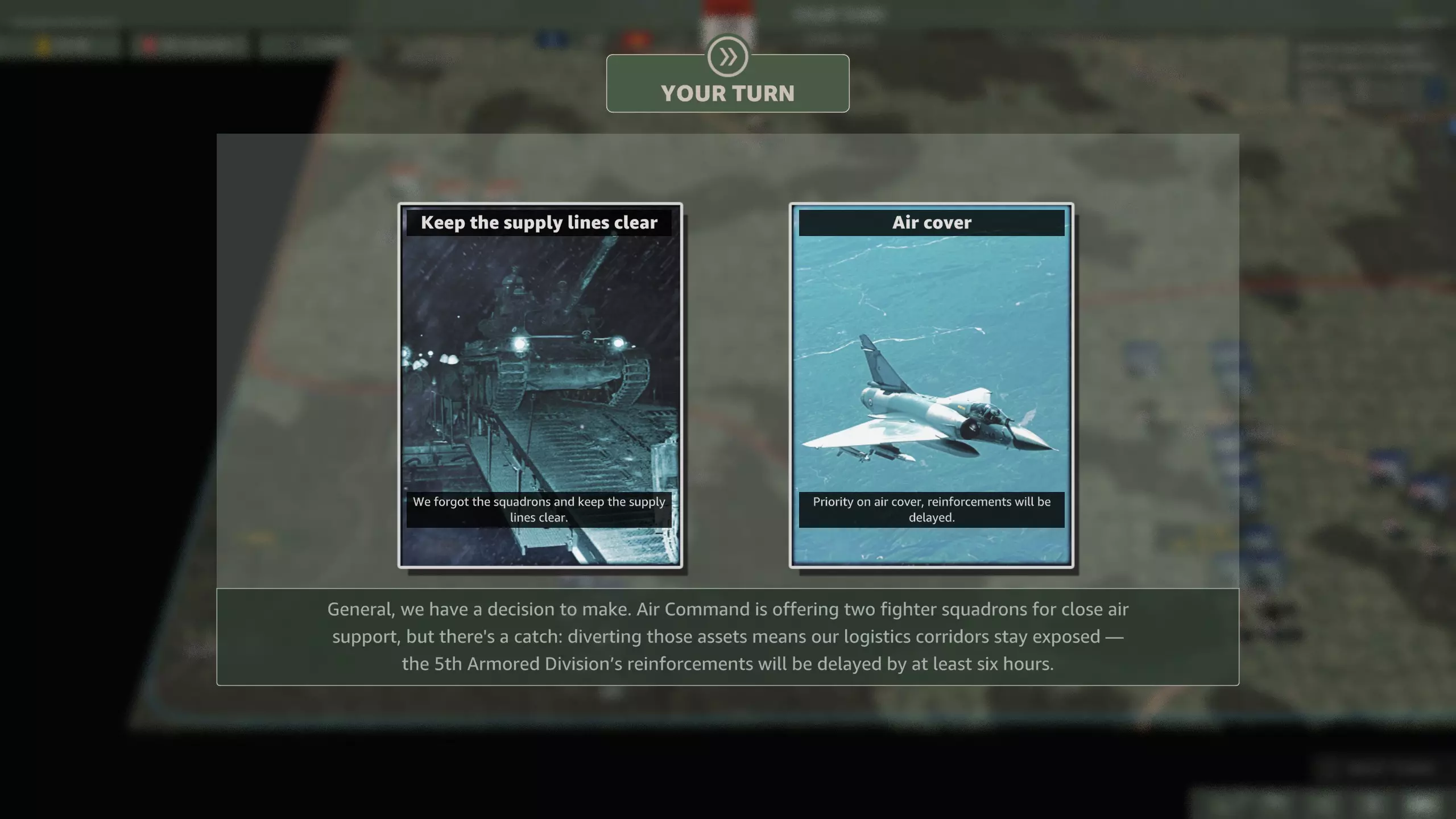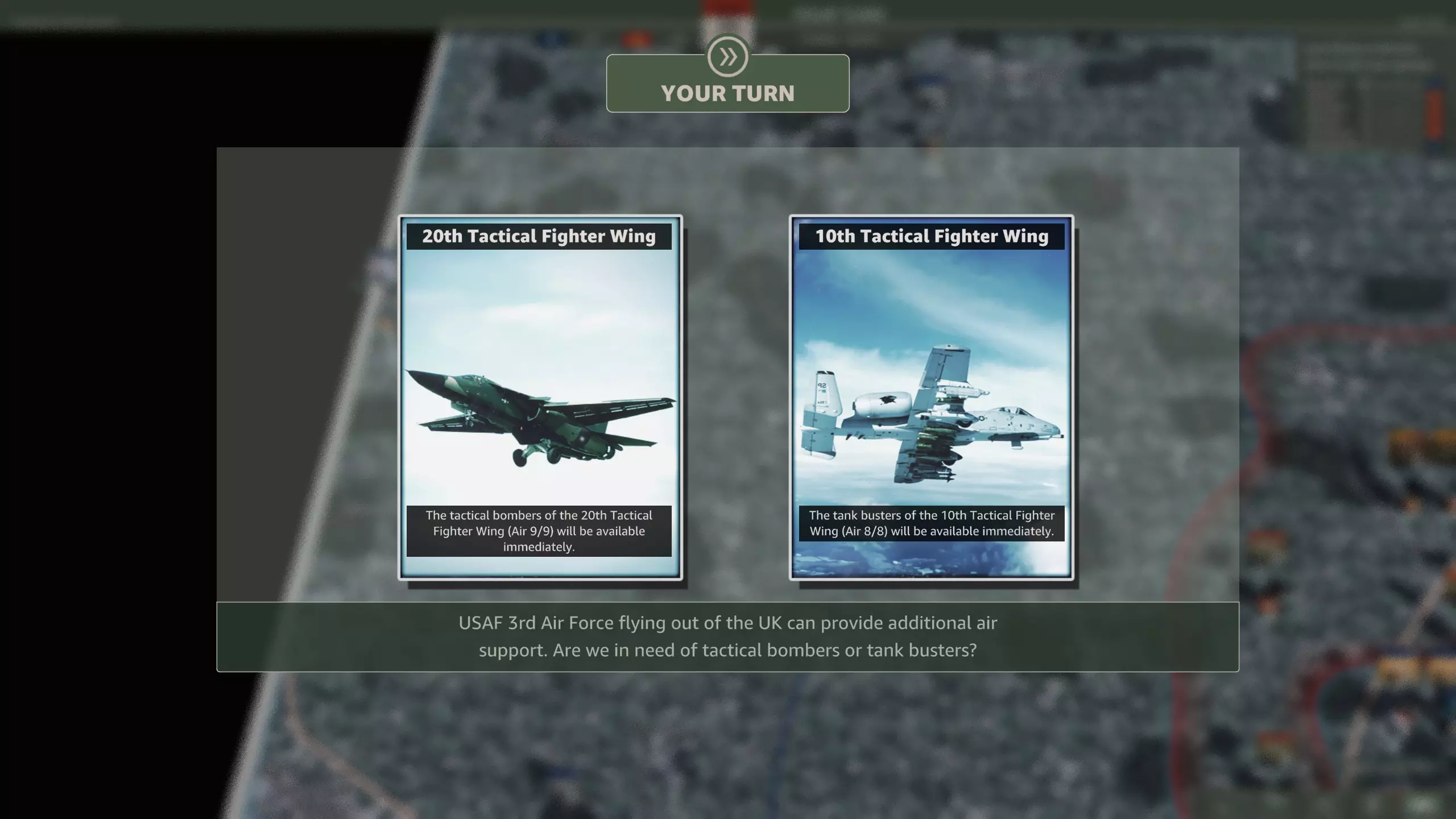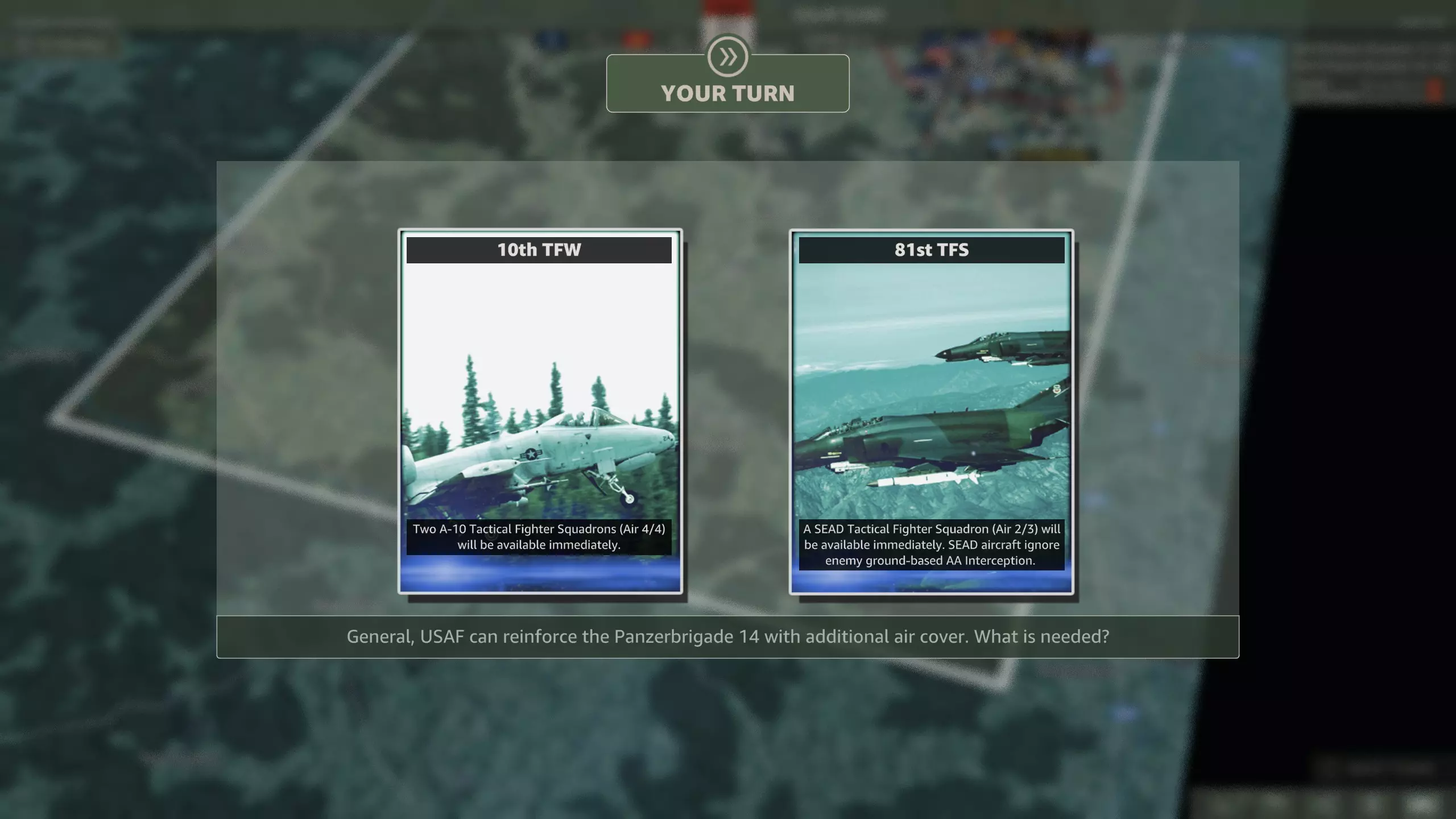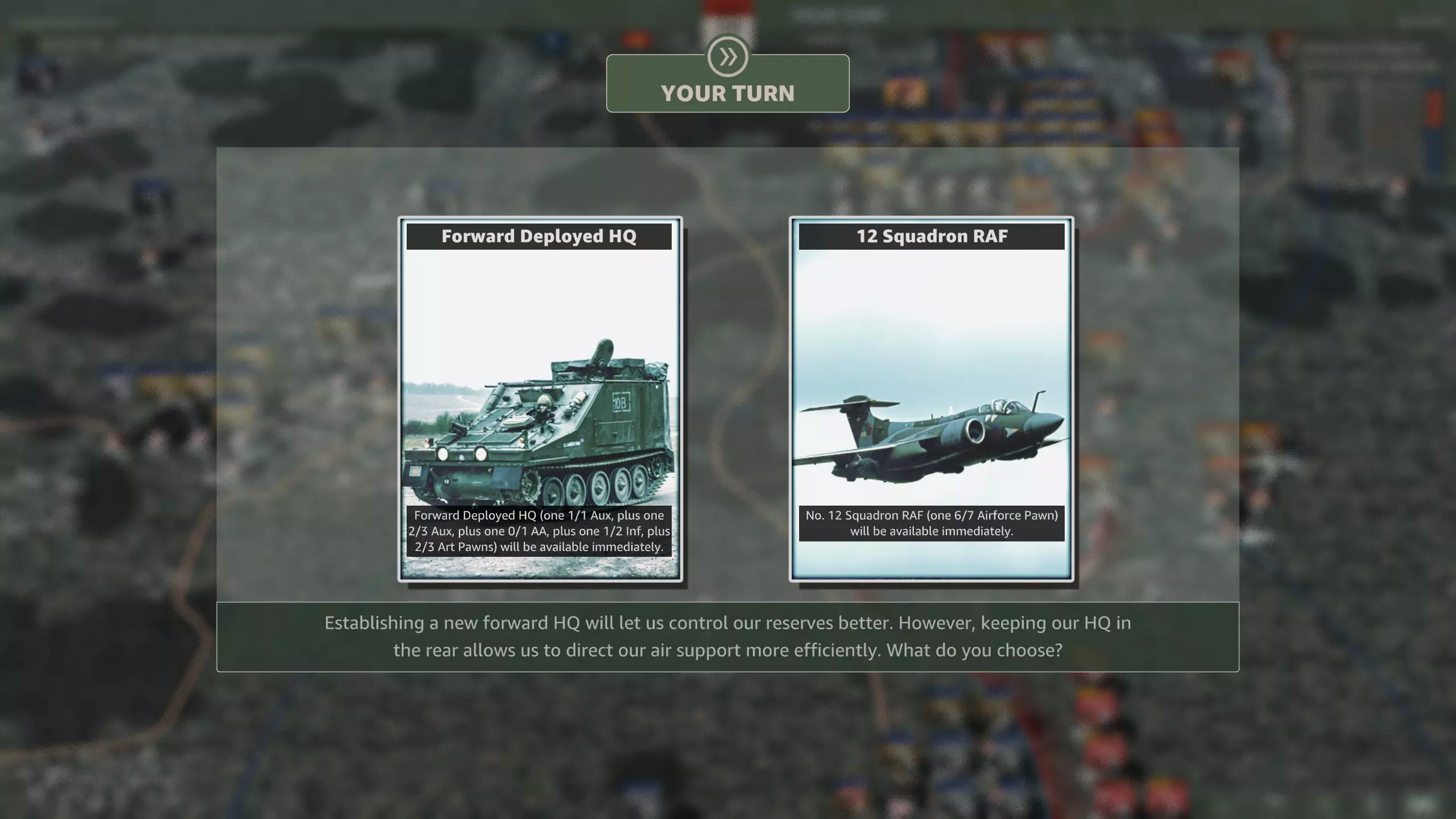 你应该选择哪个? 美洲虎战机在整个战役中都可使用,虽然第5装甲师稍晚抵达会带来一些问题,但这比没有近距离空中支援(CAS)的情况要好得多。 第12回合