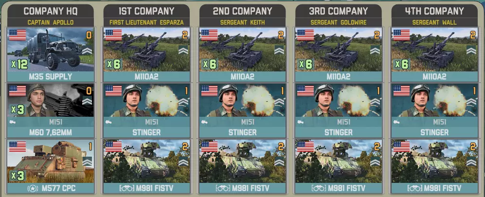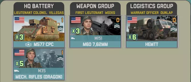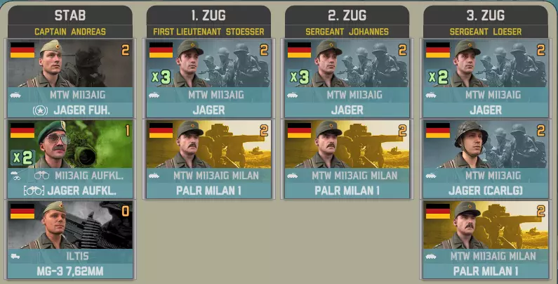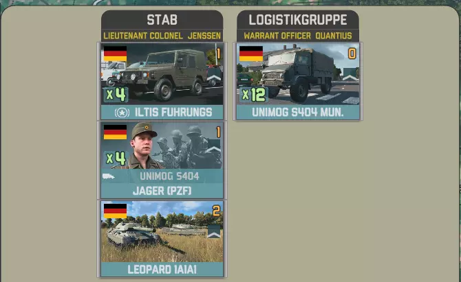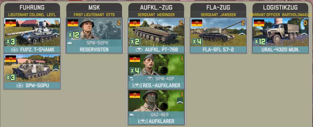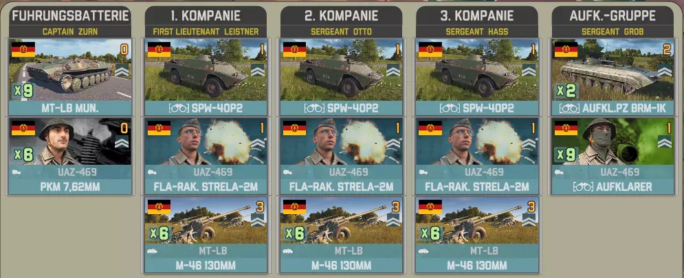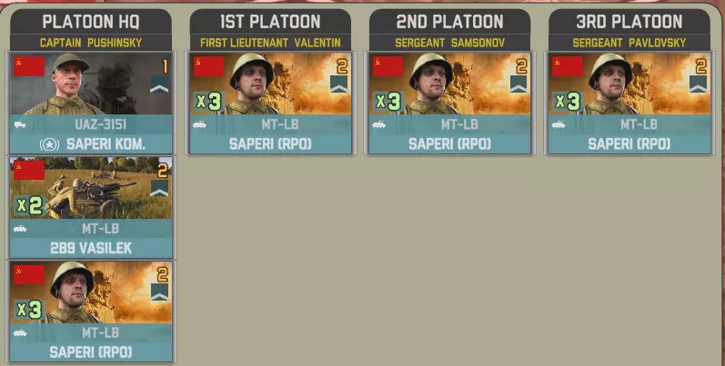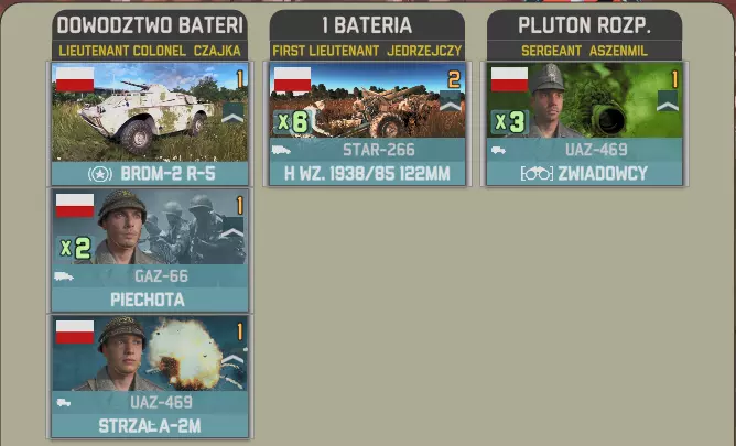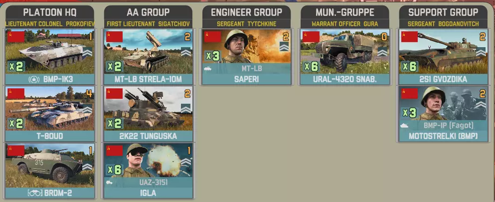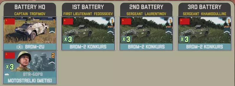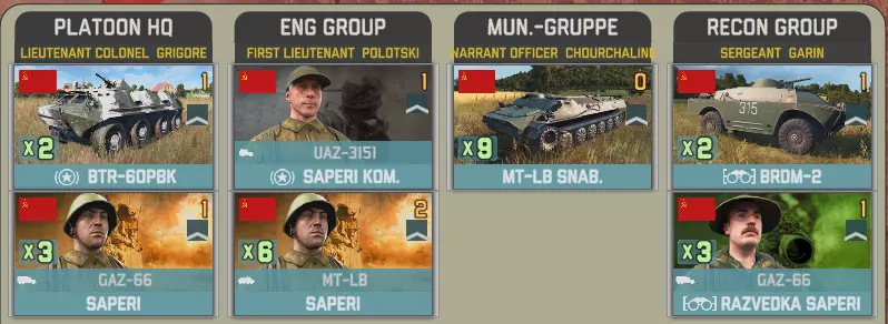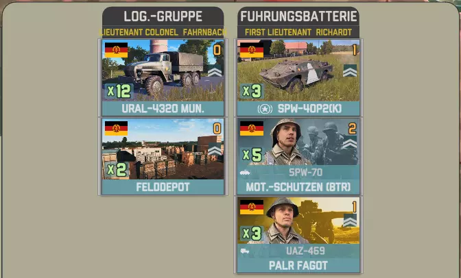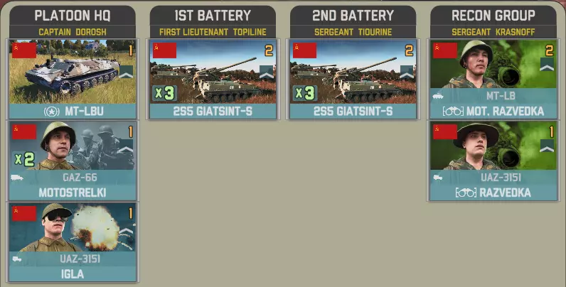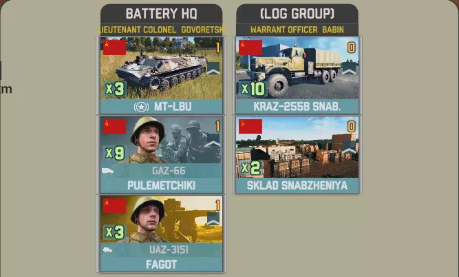 目前提供的Giatsints(自行火炮)在一定程度上受到困扰NORTHAG DLC大部分内容的一个问题影响:它们极度缺乏补给。除了火炮自身携带的弹药外,只有9辆MT-LB(多用途装甲车)能满足你的补给需求。如果在反炮火作战中出现几次失误,你可能会发现自己难以进行还击。 这些营级单位包含一个人员有限的参谋连: