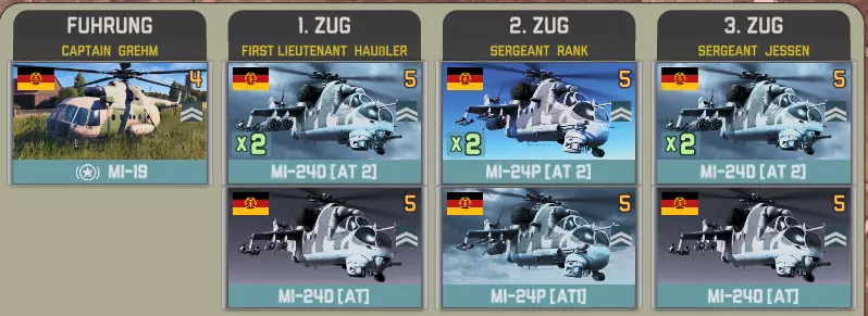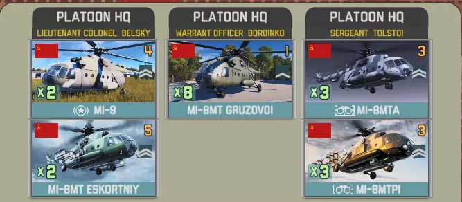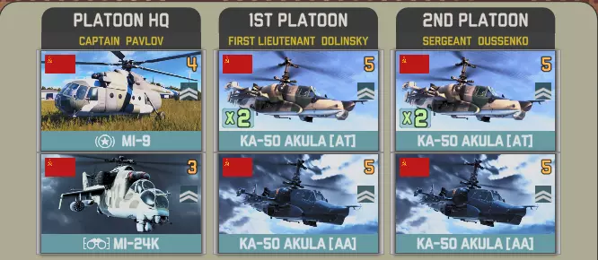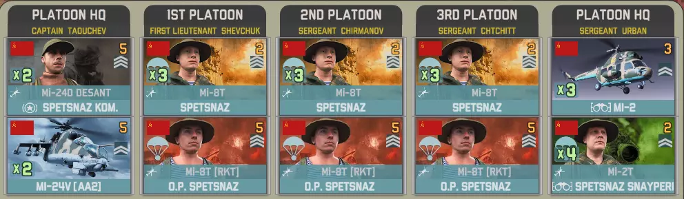 【Spetz. Otd. Vertoletniy Polk】带来了华约武器库中最强大的直升机参与战斗。 参谋连具备强大的补给、侦察和信号情报能力。