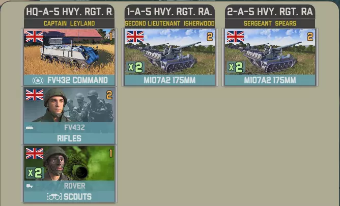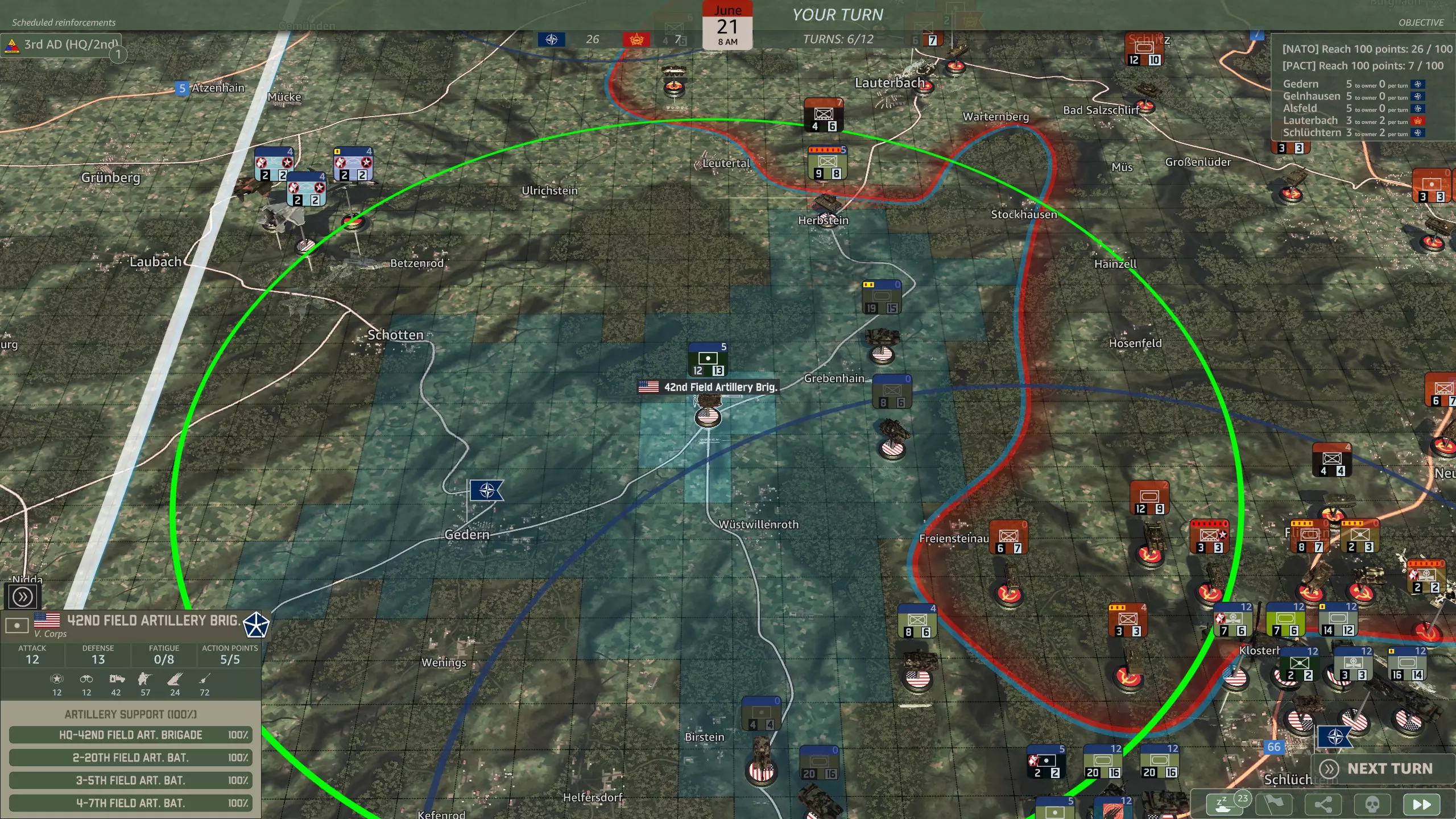 在第六回合,你需要选择花费10点胜利点来获得第42野战炮旅,或者保留这些点数,放弃目前所有AG中最强大的炮兵单位。 第42野战炮旅由不少于三个重型炮兵营合并而成。拥有72门M110自行火炮,你应该有足够的火力来支持整个战役。不过它们在自动战斗之外的实用性可能存疑。 该旅包含一个参谋连,值得注意的是没有前方作战基地(FOB)。
