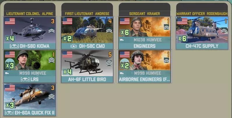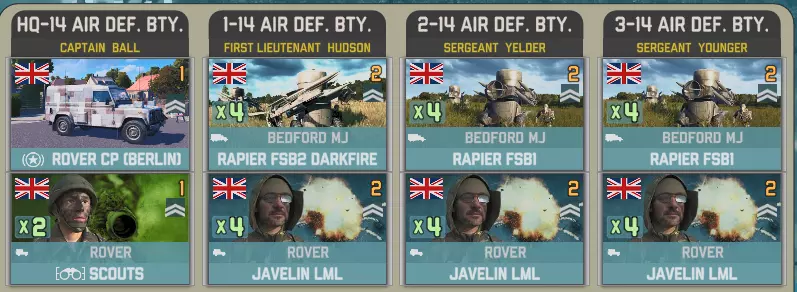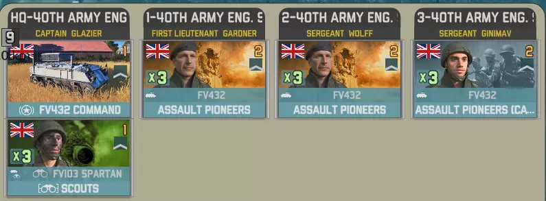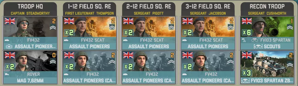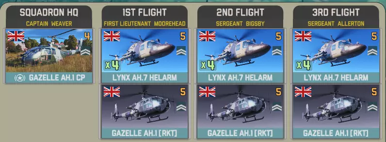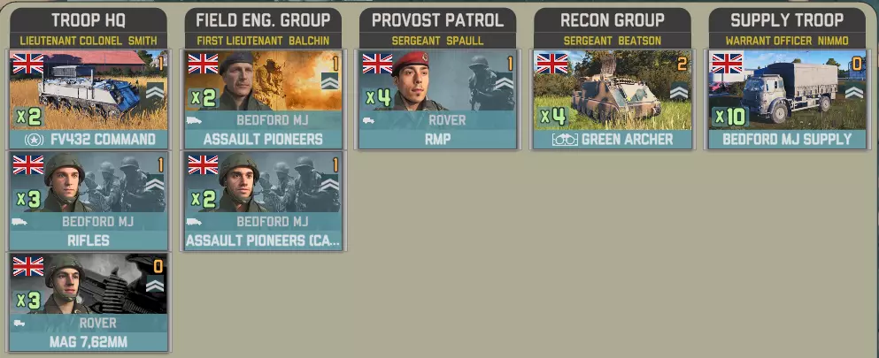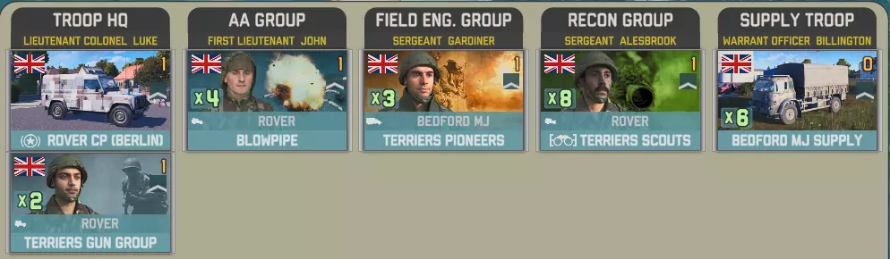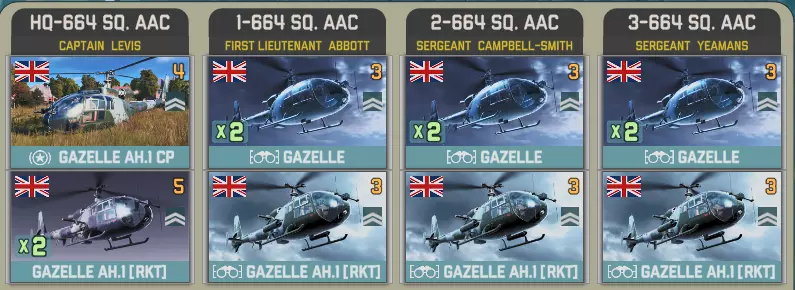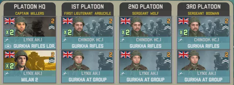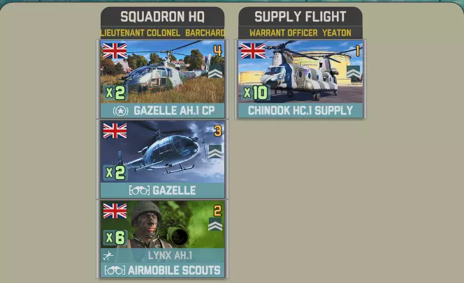 空降突击中北约方有一个选择。你想要一架直升机和一些廓尔喀兵?还是5点胜利点? 英国陆军航空兵团第3团拥有多种直升机,包括反坦克型山猫直升机、火箭型和侦察型瞪羚直升机。你还将获得20000补给品(由支奴干直升机运输)以及一小队廓尔喀兵。 参谋连配备了空中和地面侦察兵: