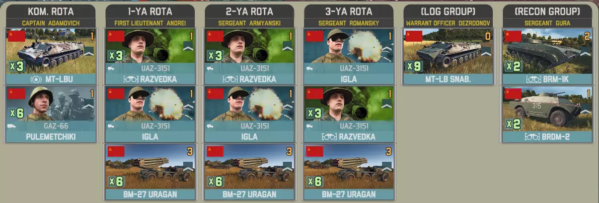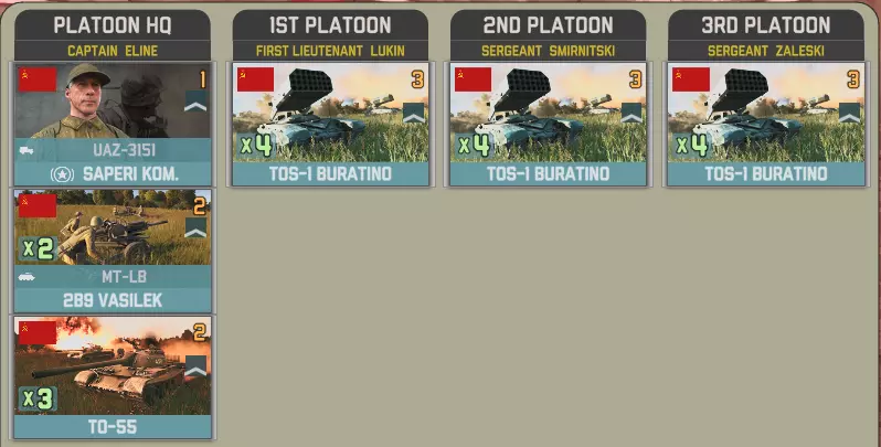 这里的选择相当直接。布拉提诺火箭炮连配备了庞大且多样化的工程辅助营,使其能够直接支援进攻。而吉亚辛特-S自行火炮连则编成了一个规模较小的旅级单位,凭借两个前沿作战基地(FOB)拥有强大的火力。 第21独立喷火营凭借十二门TOS-1布拉提诺火箭炮带来温压弹的雷霆打击。该营包含一个参谋连,但补给非常有限。