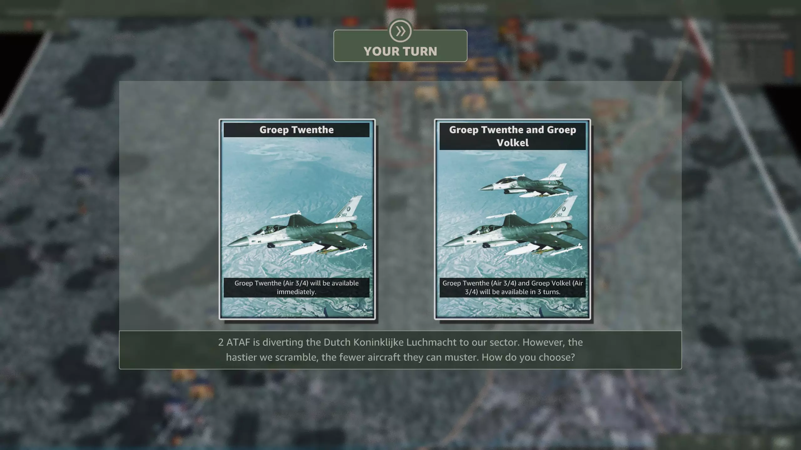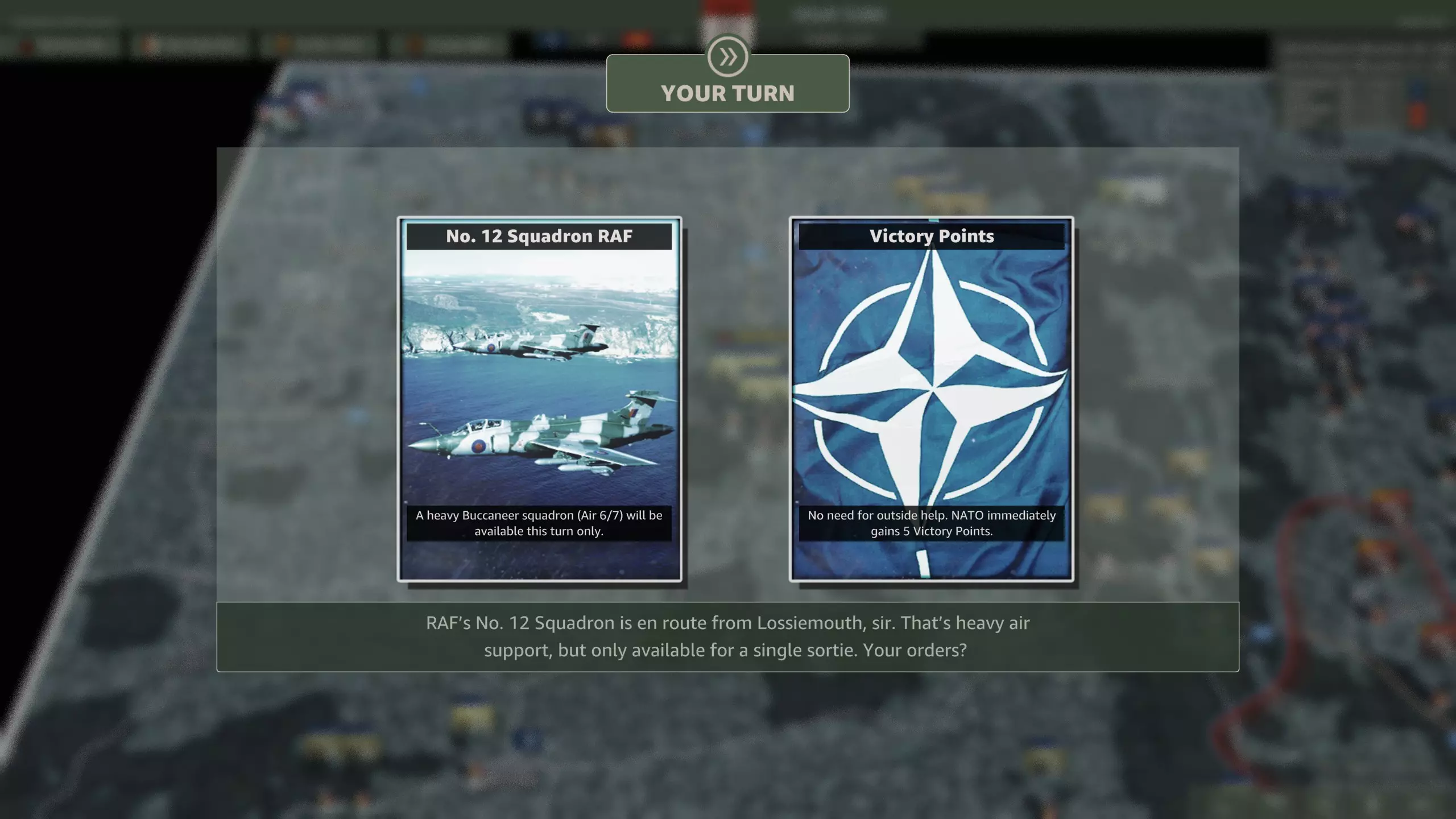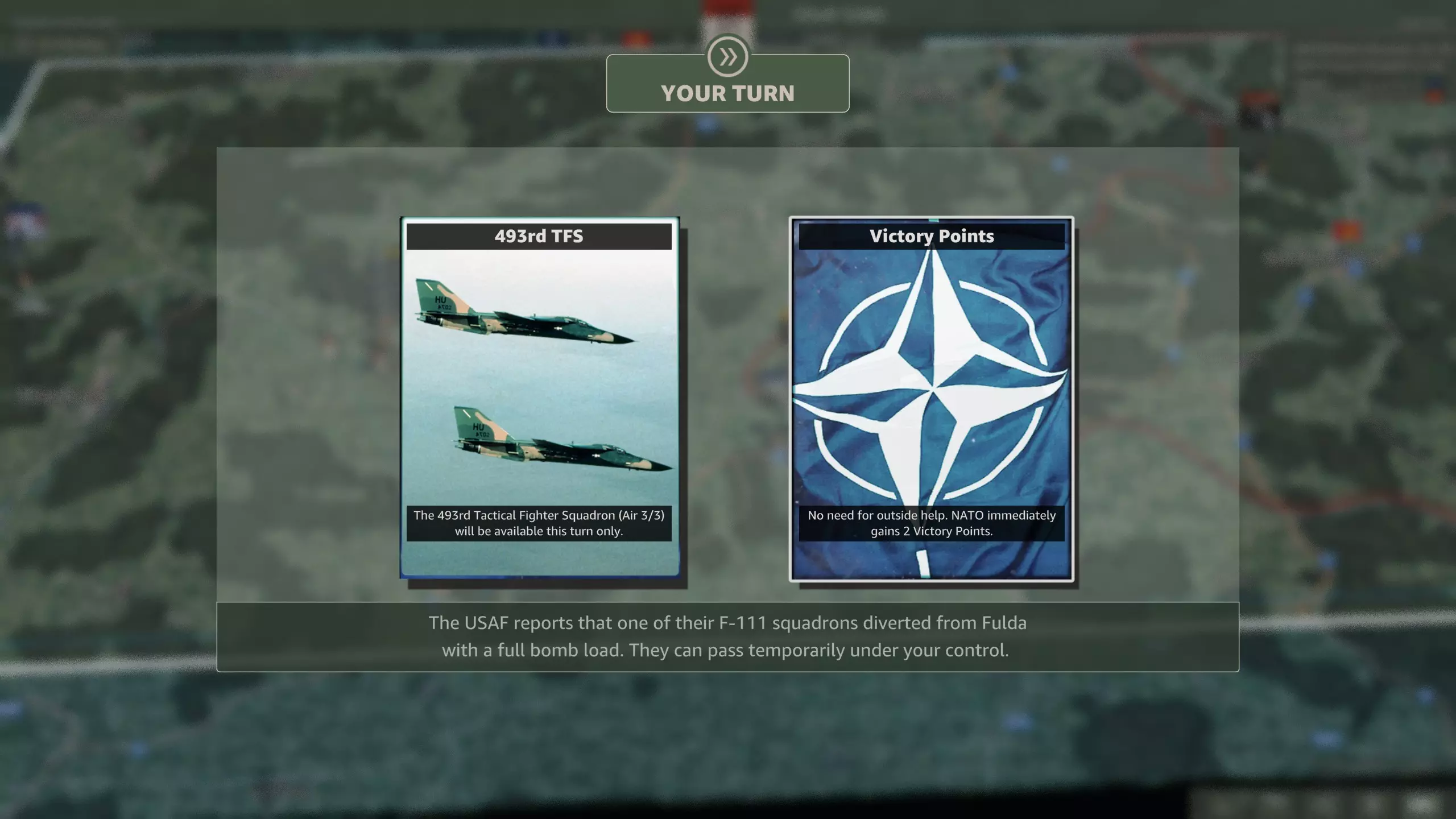 北约可以选择两次。 第十二回合会出现一个两难选择:现在获得一个荷兰空军联队,或是两回合后获得两个。 第十六回合可选择:三架F-111战斗轰炸机联队,或是两架A-10攻击机联队。 提供的选择如下: 第十二回合