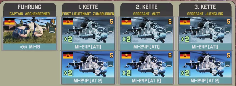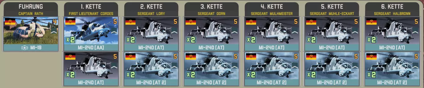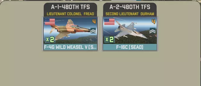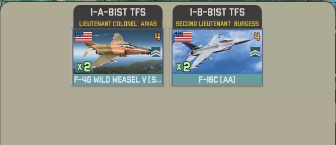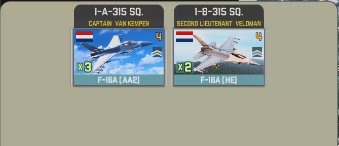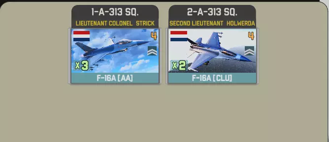 提供的联队为特文特联队和沃尔克尔联队。每个联队至少配备20架F-16,特文特联队在第12回合抵达,或两个联队均在第15回合抵达。 特文特联队包含两个中队,每个中队有3架战斗机和2架轰炸机。出于某种可能只有某些人能理解的原因,半数战斗机配备6枚导弹,另一半配备4枚。 半数轰炸机携带高爆炸弹: