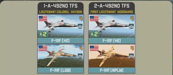 此时你必须在《手足相残》的A-10攻击机和《手足相残》的F-111战斗轰炸机之间做出选择。后者的形式有所扩展。 第20战术战斗机联队提供三个联队,每个联队包含两个F-111战斗轰炸机中队。 每个联队都有一个配备凝固汽油弹的中队。
