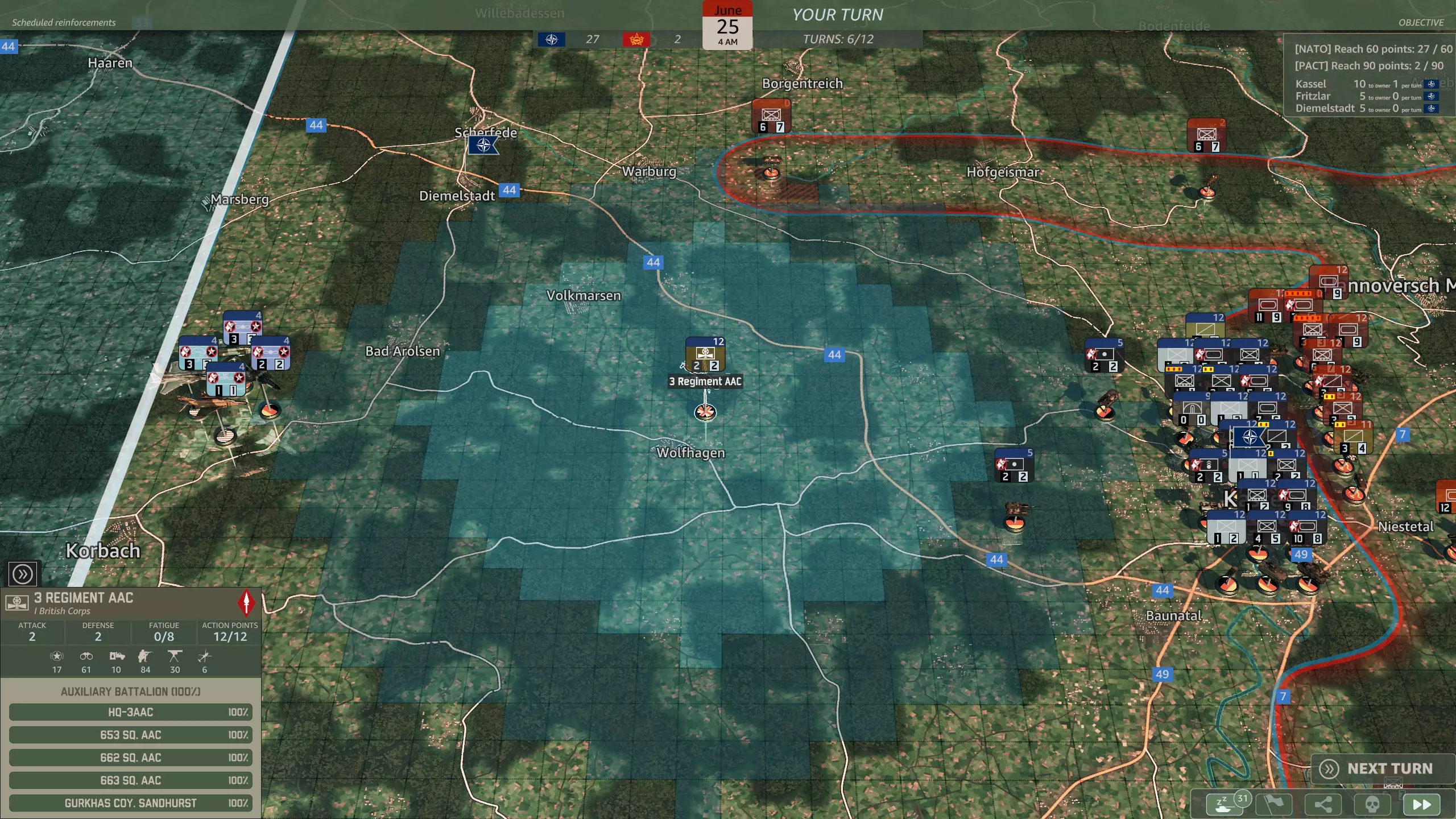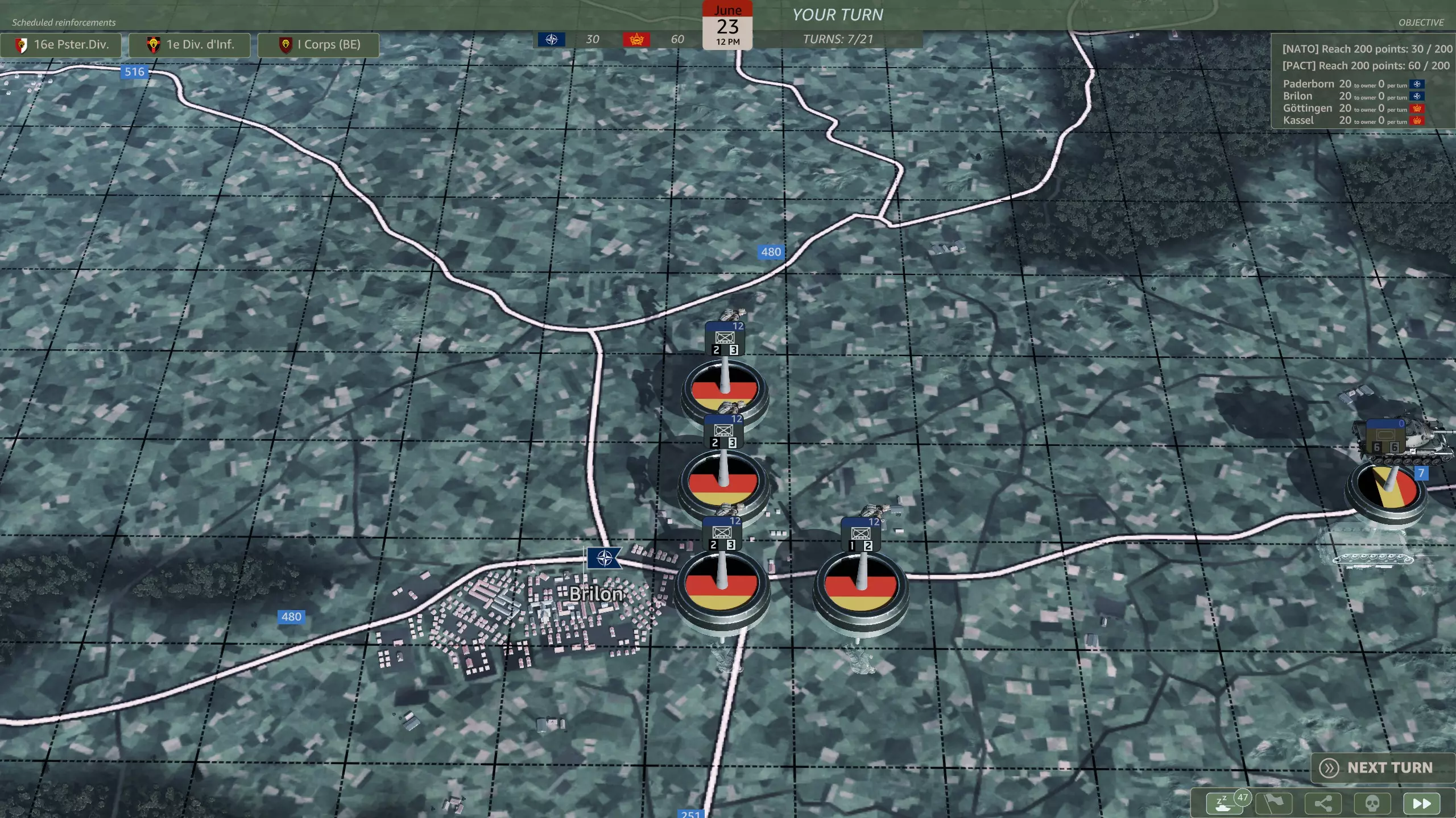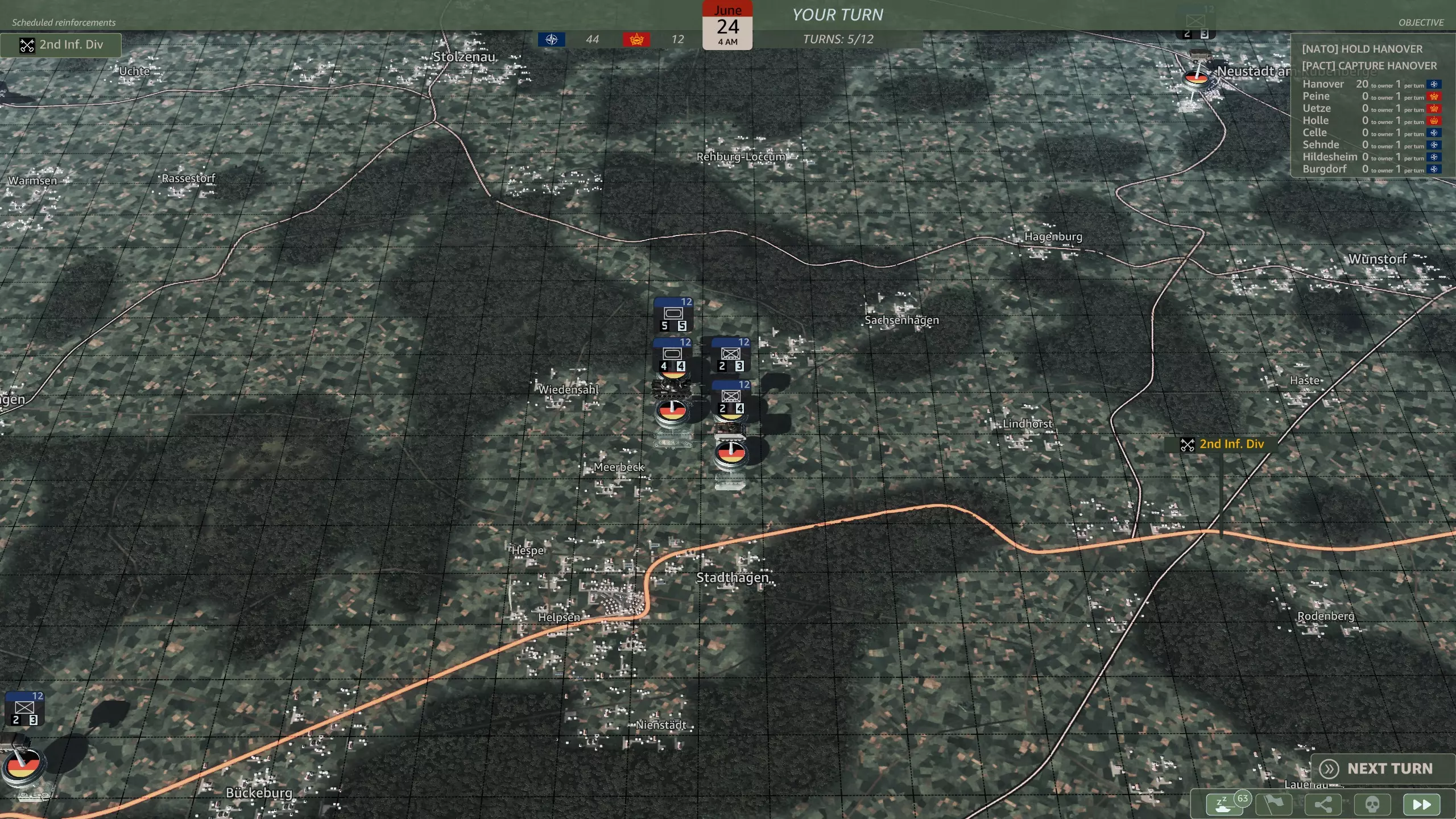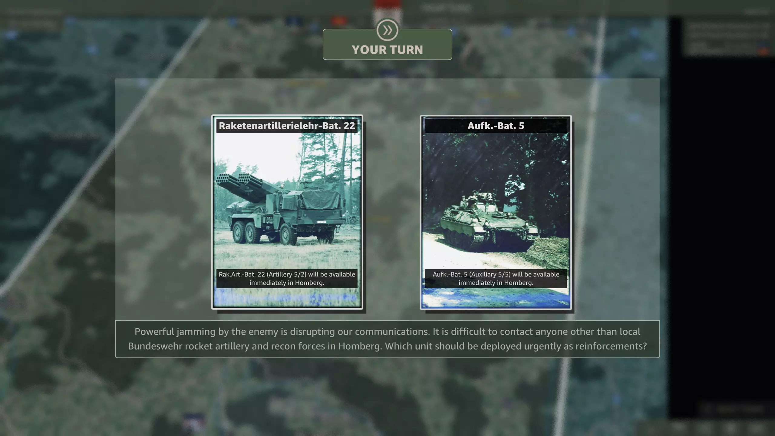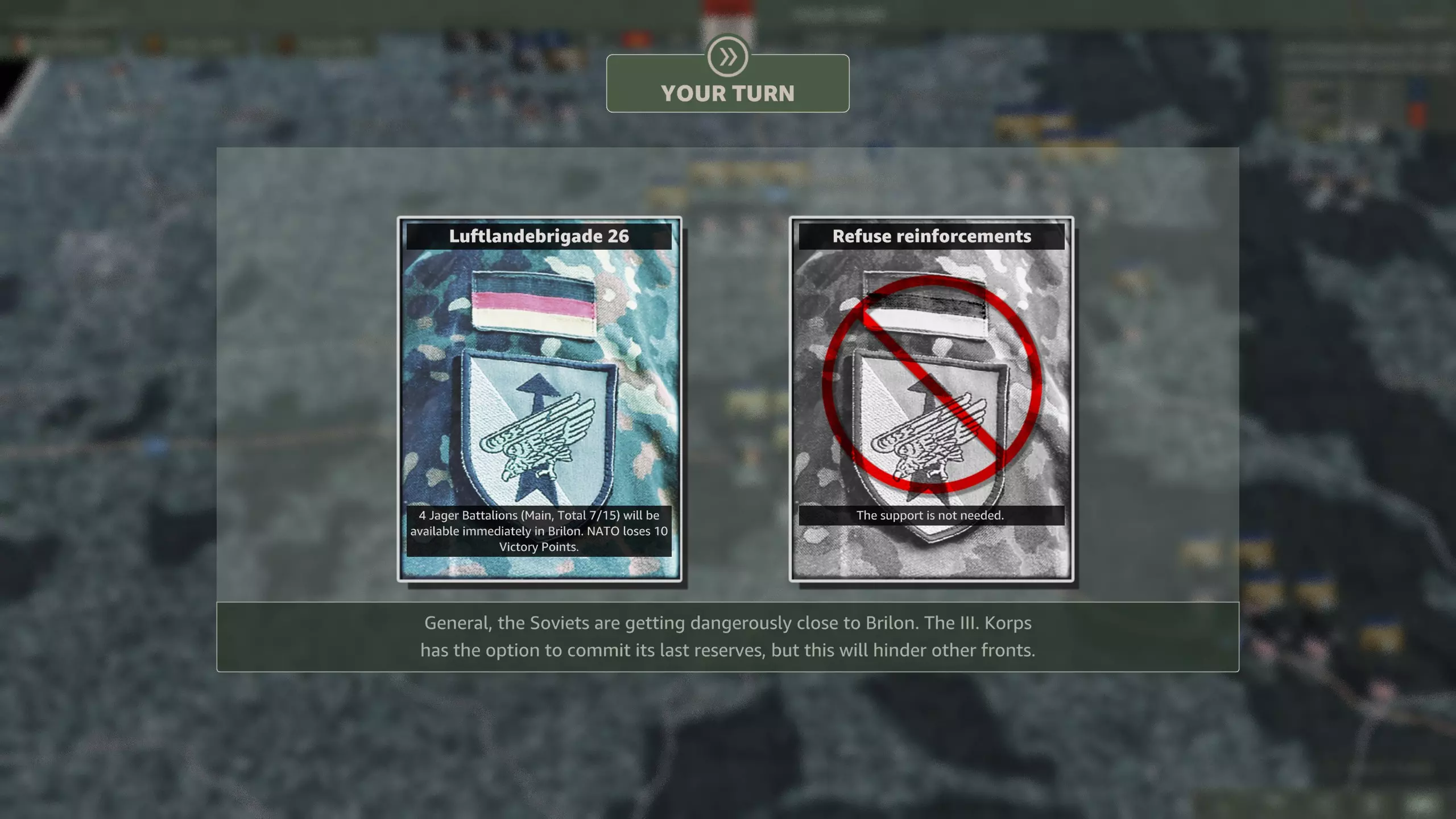 你应该选择哪一个? 这是一个相当无意义的选择,因为你应该有足够的兵力来守住防线。M48坦克(原词:M48s)对抗T-64和T-80坦克时几乎毫无用处,而且第二步兵师会提供远超你所需数量的轻型摩托化步兵。62国土防御旅(原词:Heimatschutzbrigade 62)或许能在初期填补一回合的缺口,仅此而已。 第六回合