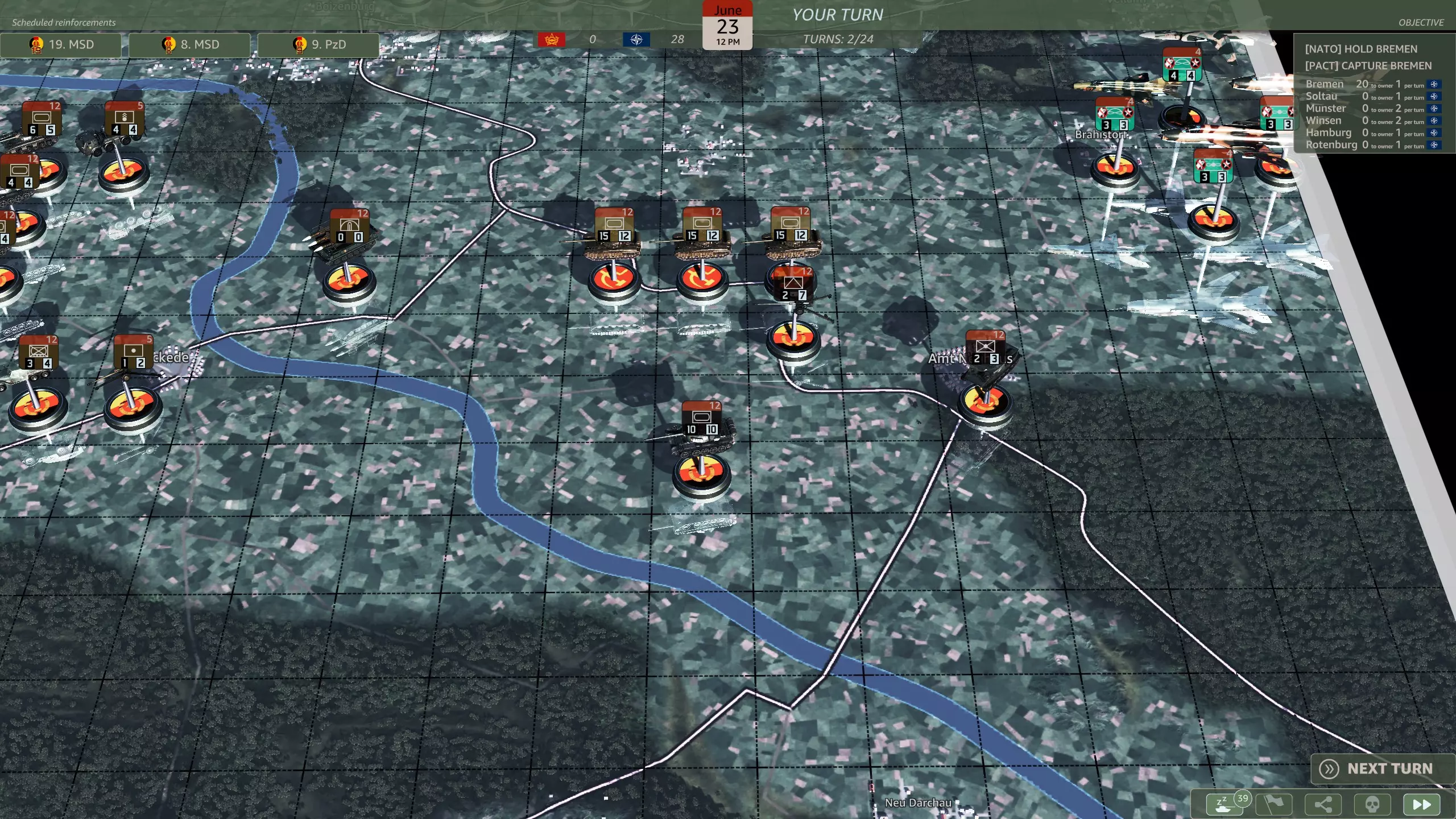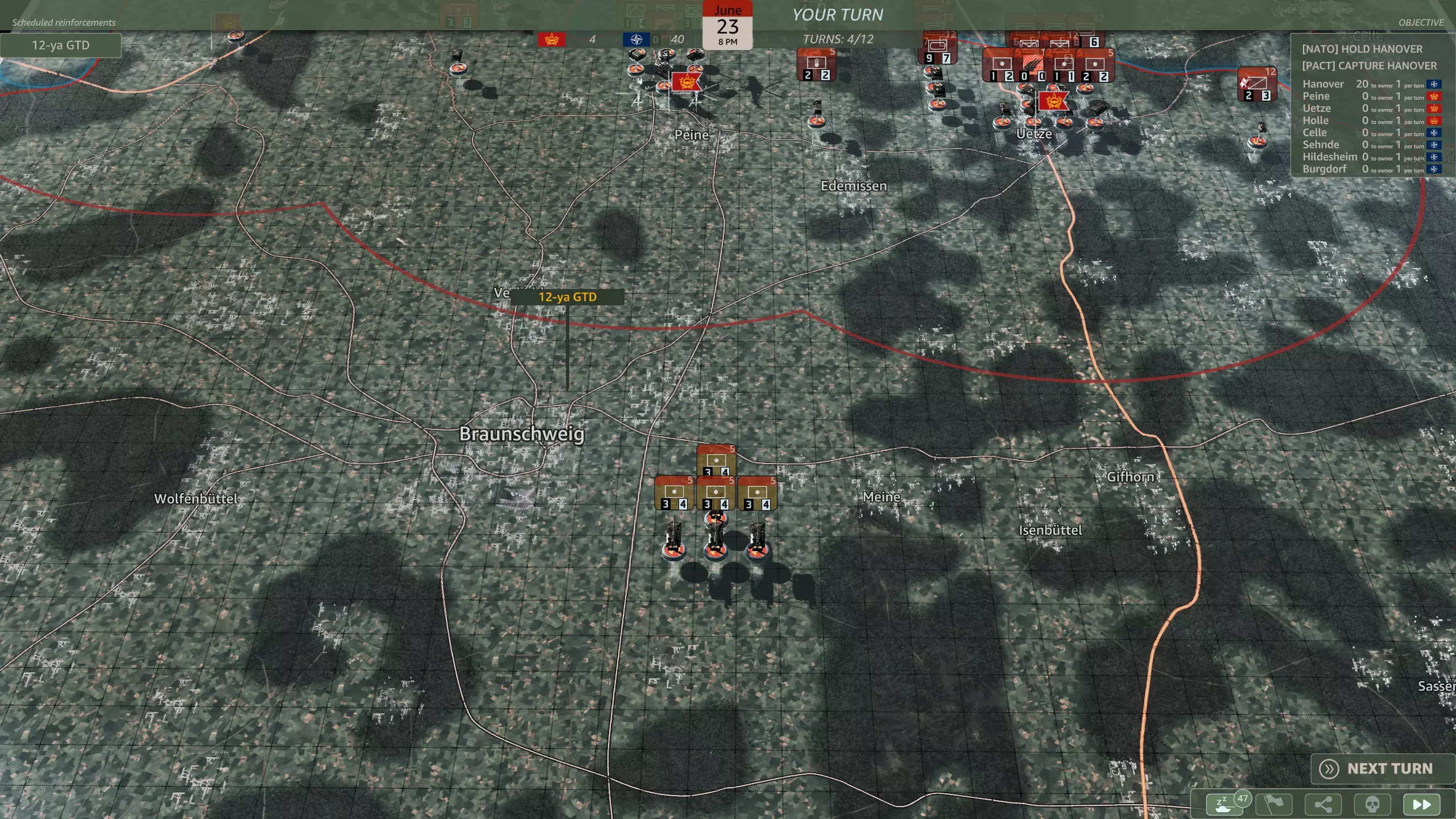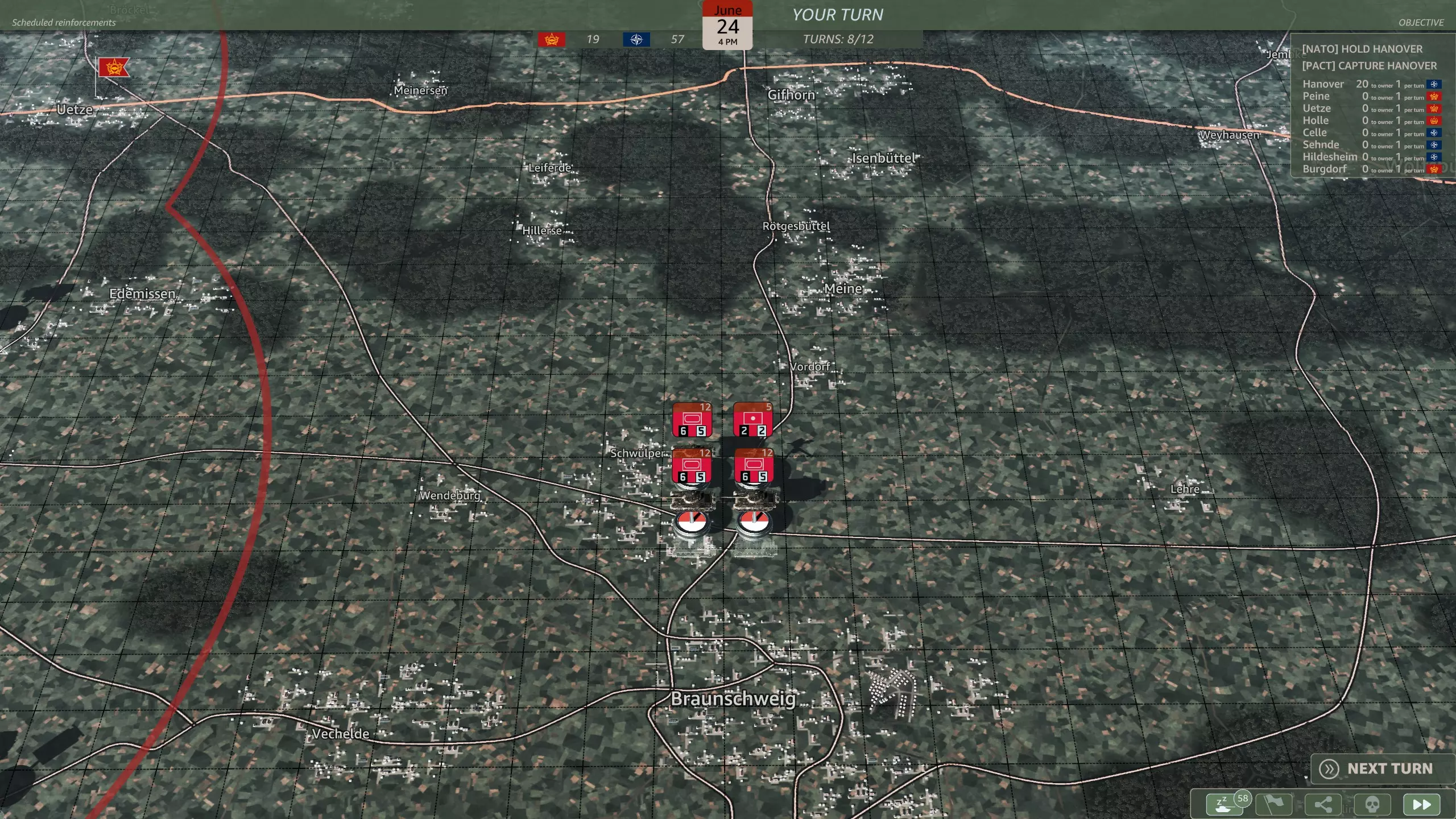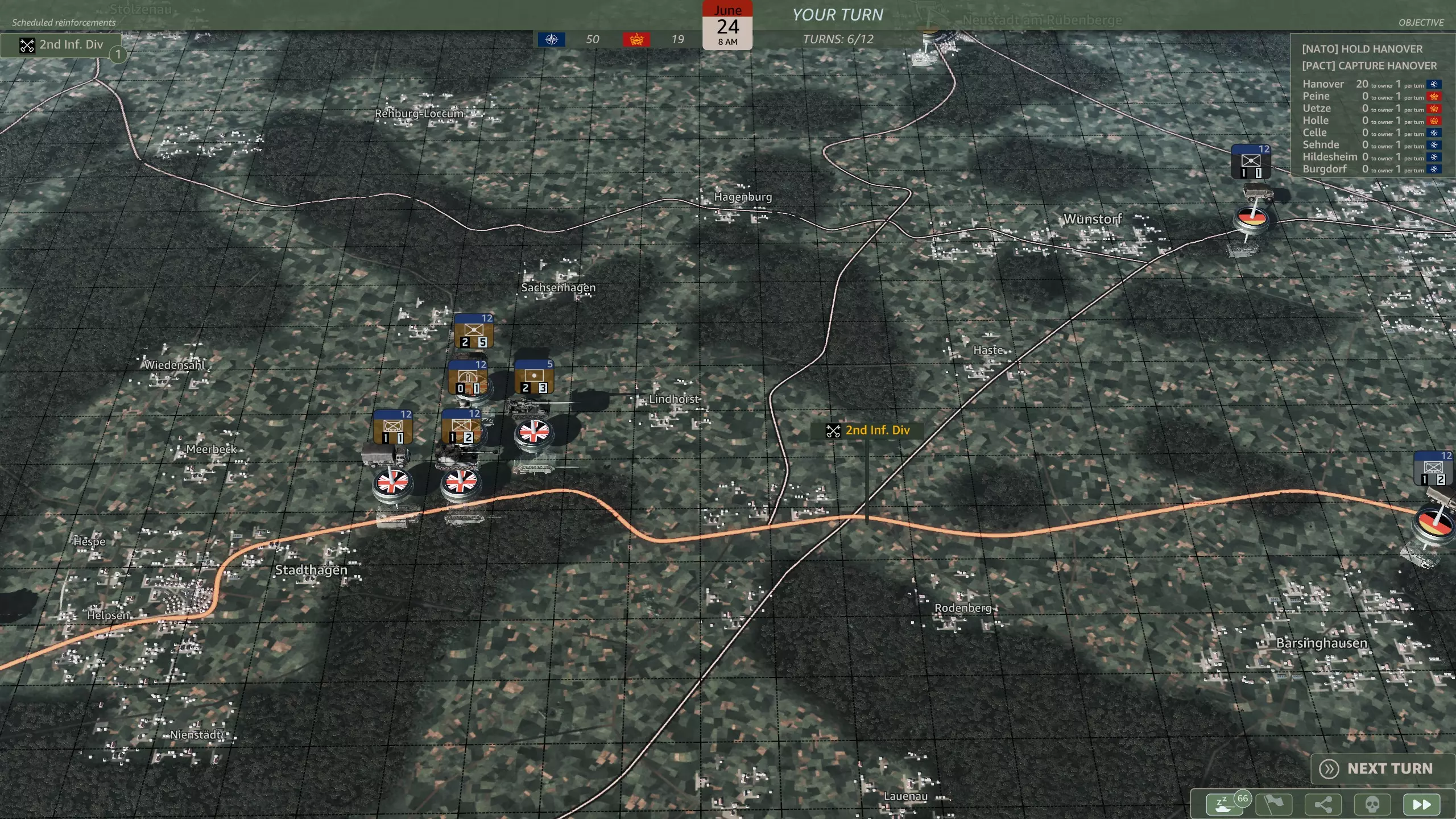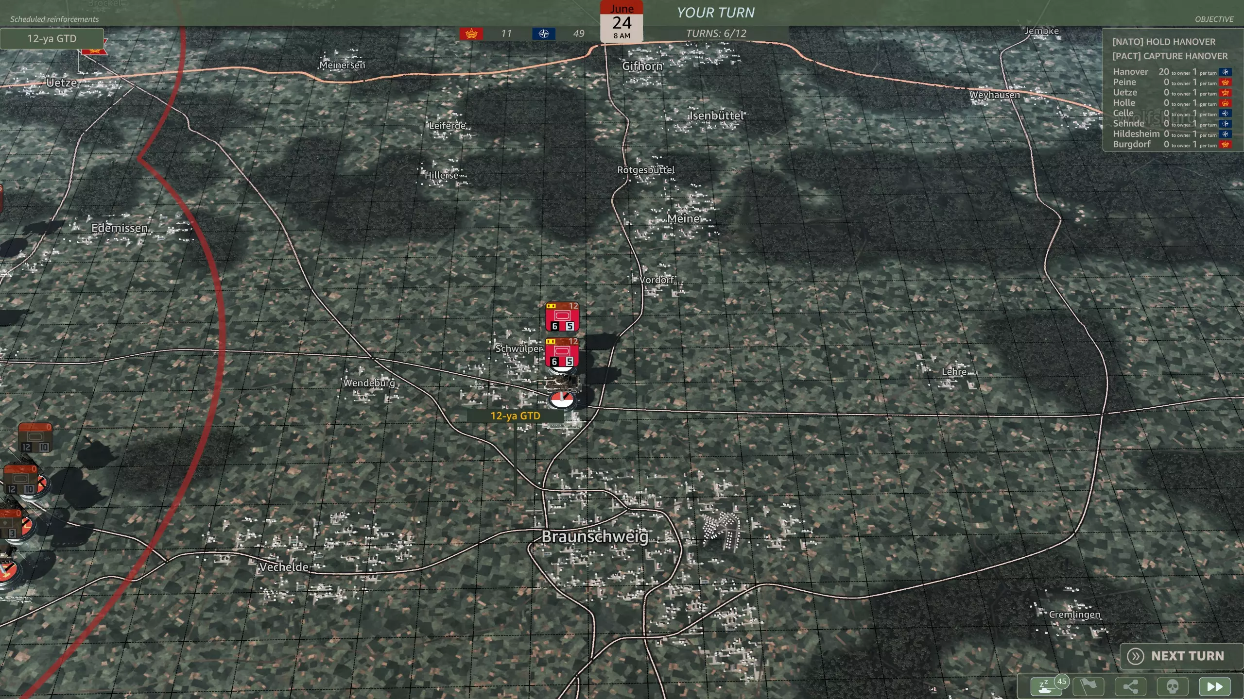 你应该选择哪一个? 这是一个相当无意义的选择,因为你应该有足够的兵力来守住防线。M48坦克(原词:M48s)对抗T-64和T-80坦克时几乎毫无用处,而且第二步兵师会提供远超你所需数量的轻型摩托化步兵。62国土防御旅(原词:Heimatschutzbrigade 62)或许能在初期填补一回合的缺口,仅此而已。 第六回合
