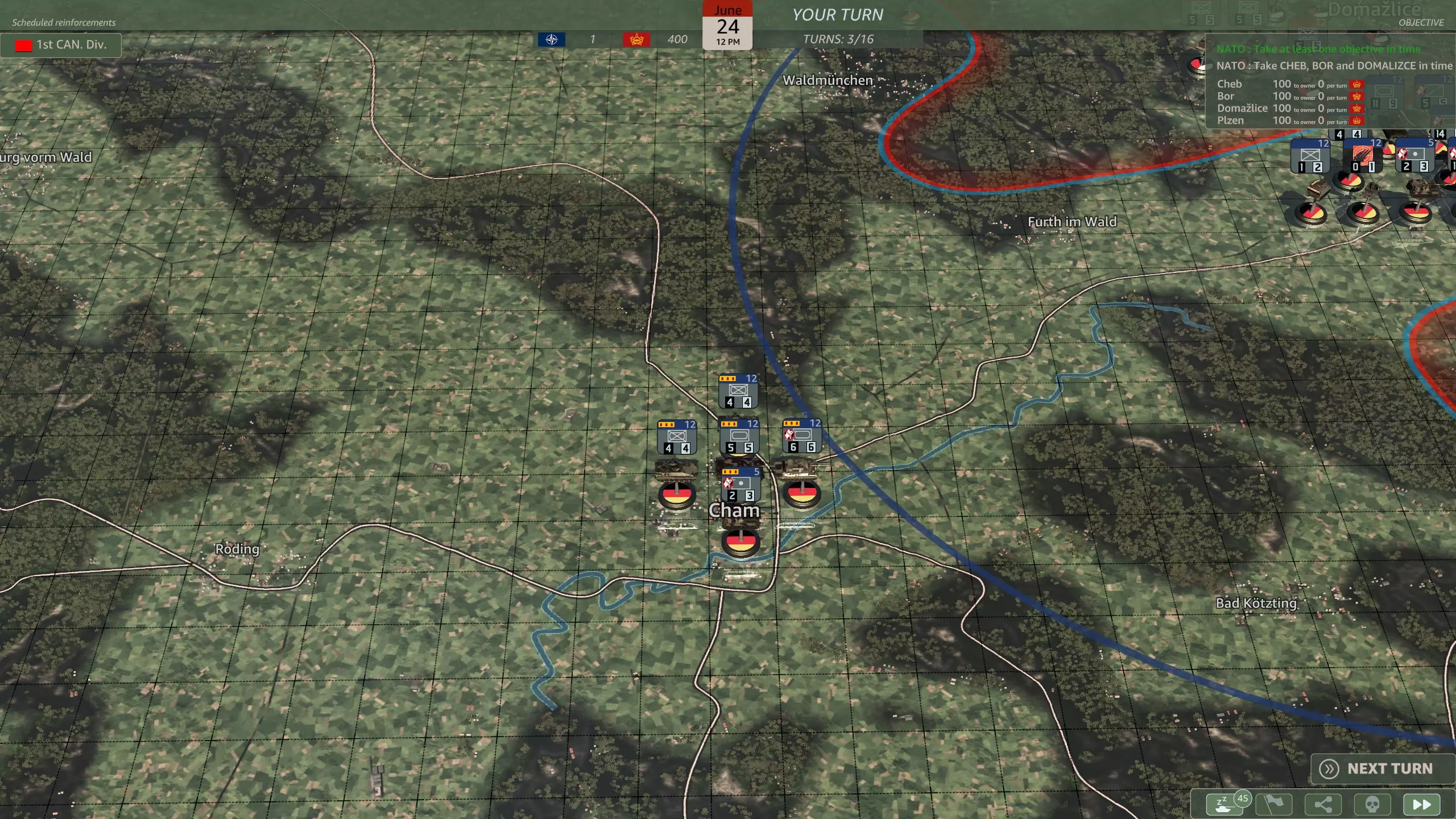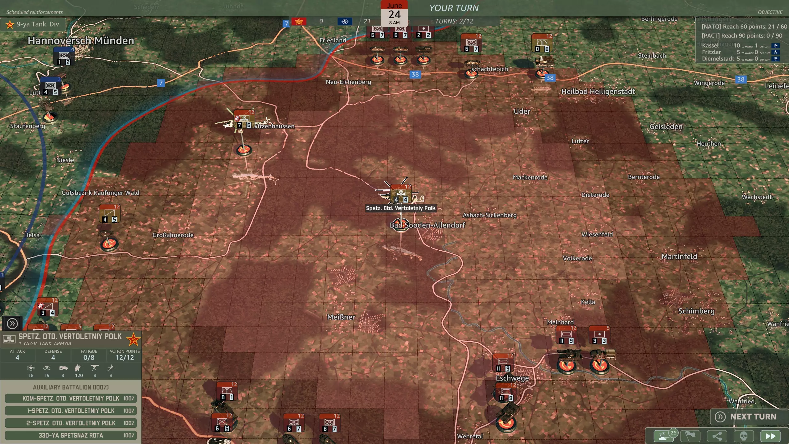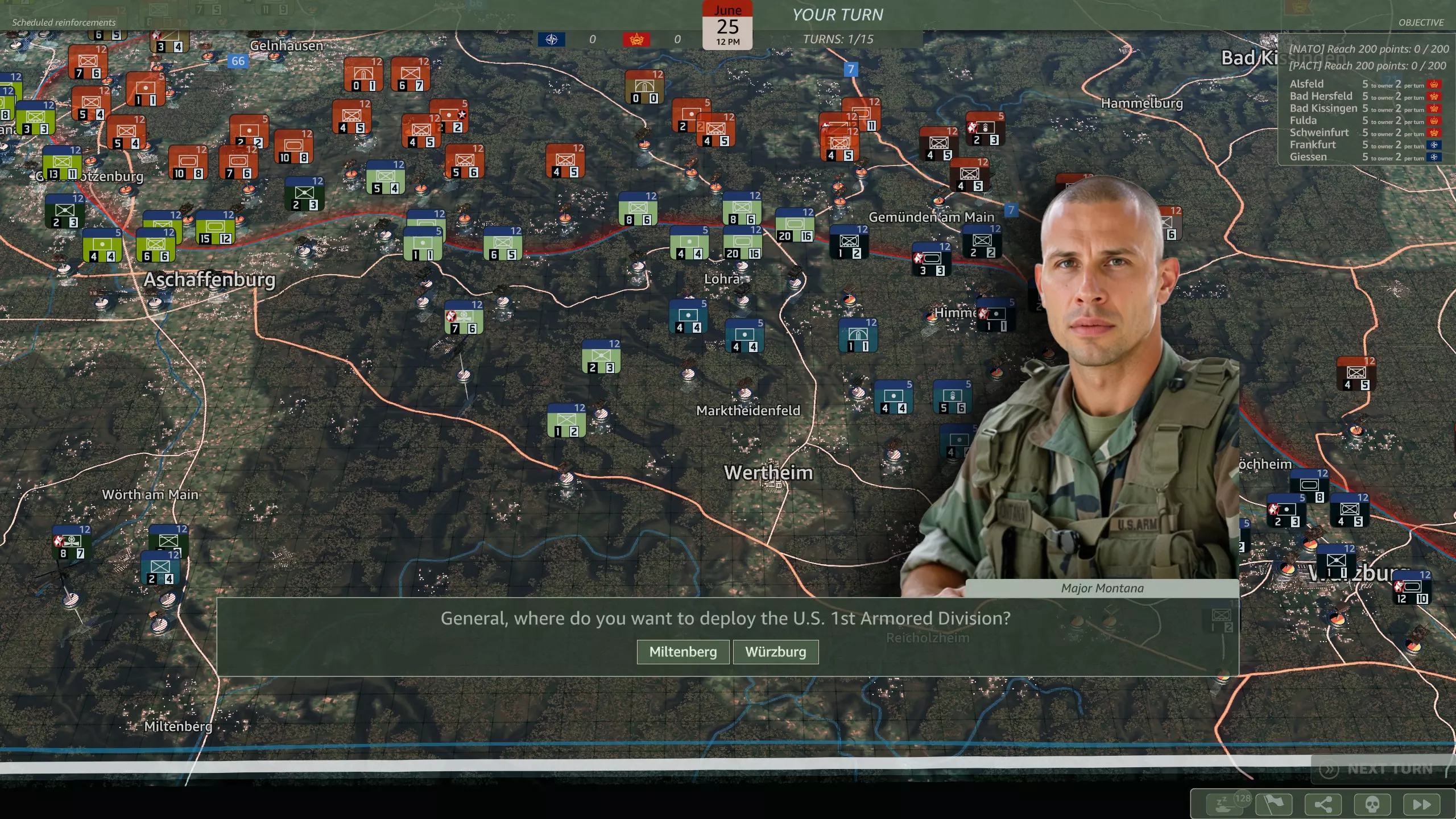 你想将第1装甲师派往米尔滕贝格还是维尔茨堡? 该师的详细信息可在游戏中直接查看,这里不再赘述。 你应该选择哪一个? 米尔滕贝格能够对进攻法兰克福的华约部队侧翼发动有效攻击。 维尔茨堡则提供了向施韦因富特进行侧翼包抄的机会。 两者都是可行的选择,我认为维尔茨堡是更好的选择,因为你可以夺取两个关键胜利点,并支援较弱的第12装甲师。 第9回合