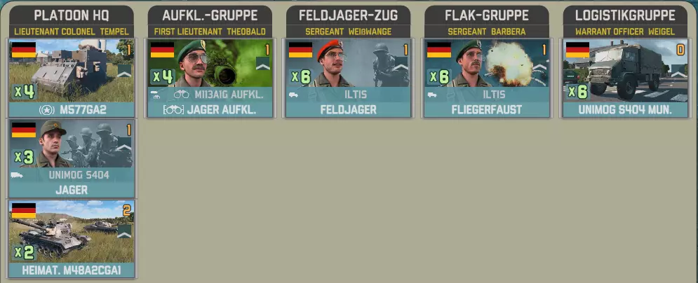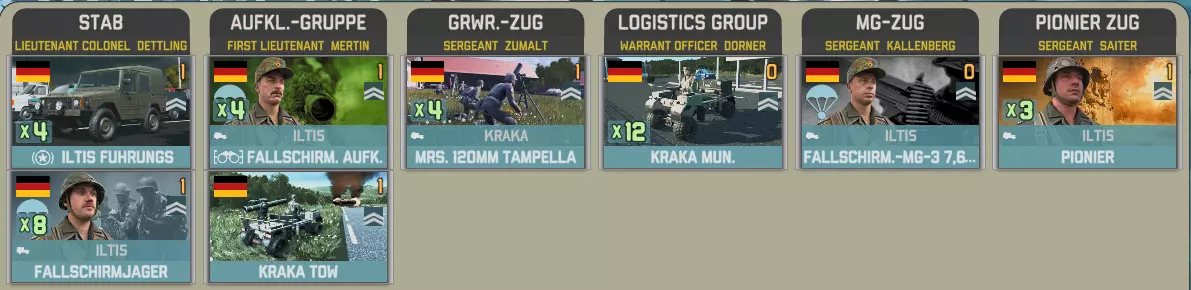 前沿部署指挥部包含一个指挥部、重型火炮、工兵、防空炮和一些摩托化步兵。 I BR军指挥部包含一个配备大量补给的参谋连。