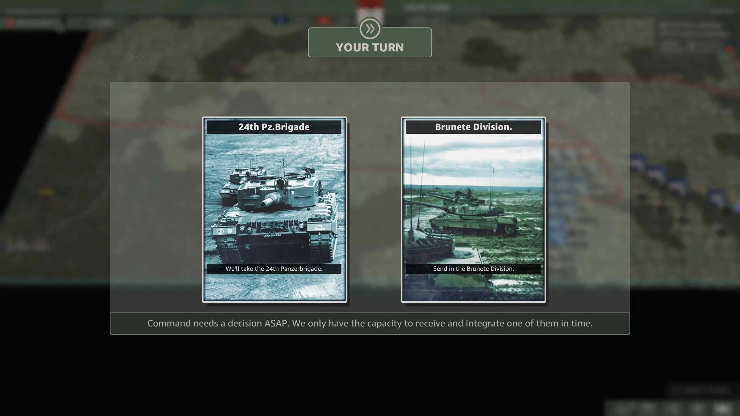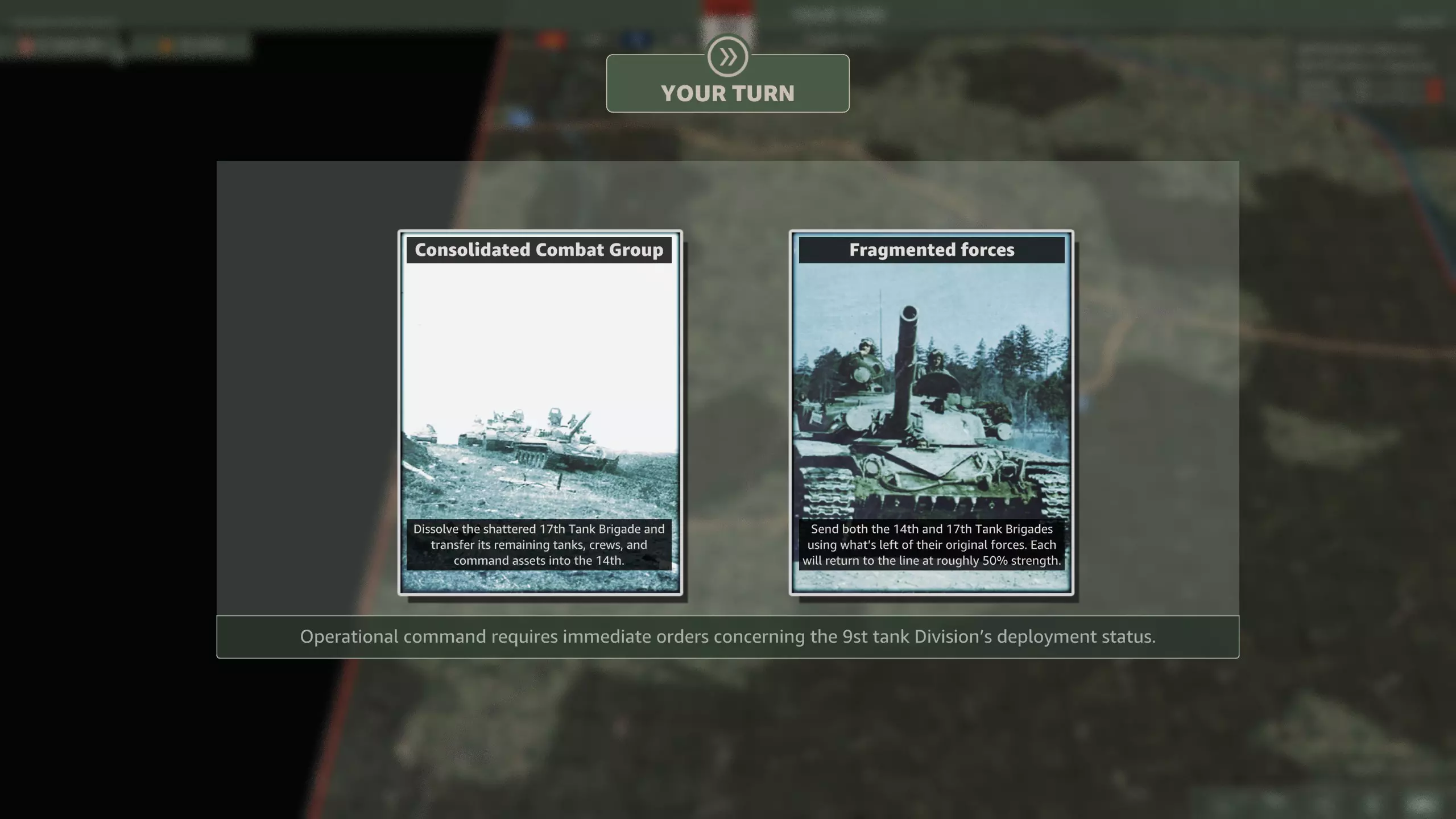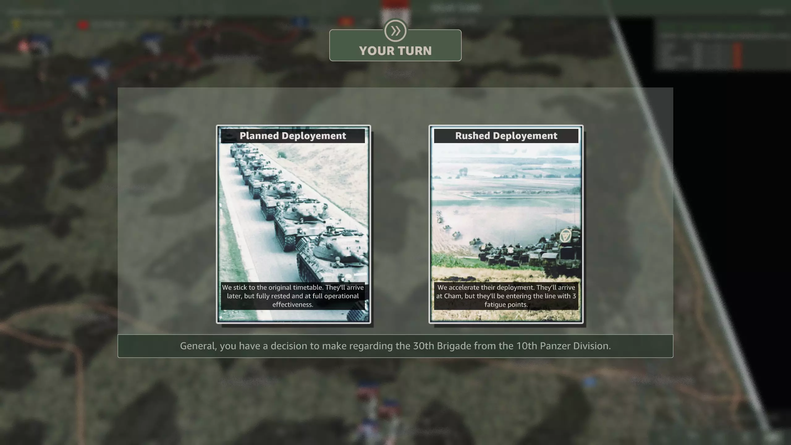 同样的决定却更糟?部署时间还异常滞后?简直了! 你可以选择让两个旅都以70%的兵力投入战斗,但会带有一定疲劳值。而且师属侦察团不知为何被取消了。 或者让两个旅都保持100%的兵力,但部署时间太晚,根本无法参与任何战斗? 游戏中已包含编制表,这里不再赘述。我也无需告诉你该选哪一个。 目前为止最糟糕的事件选择。 坚守进攻