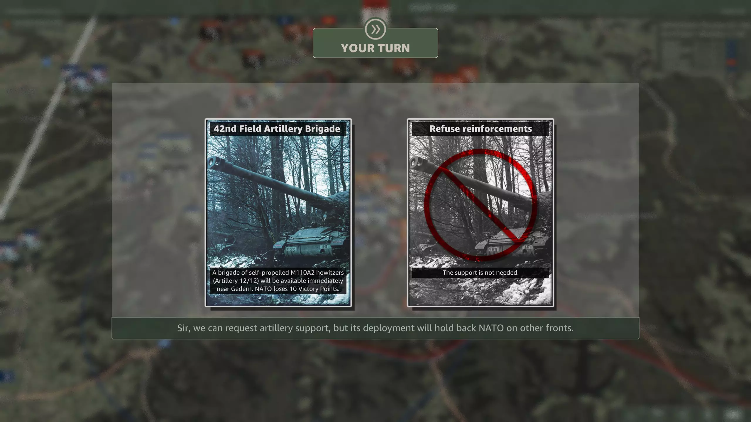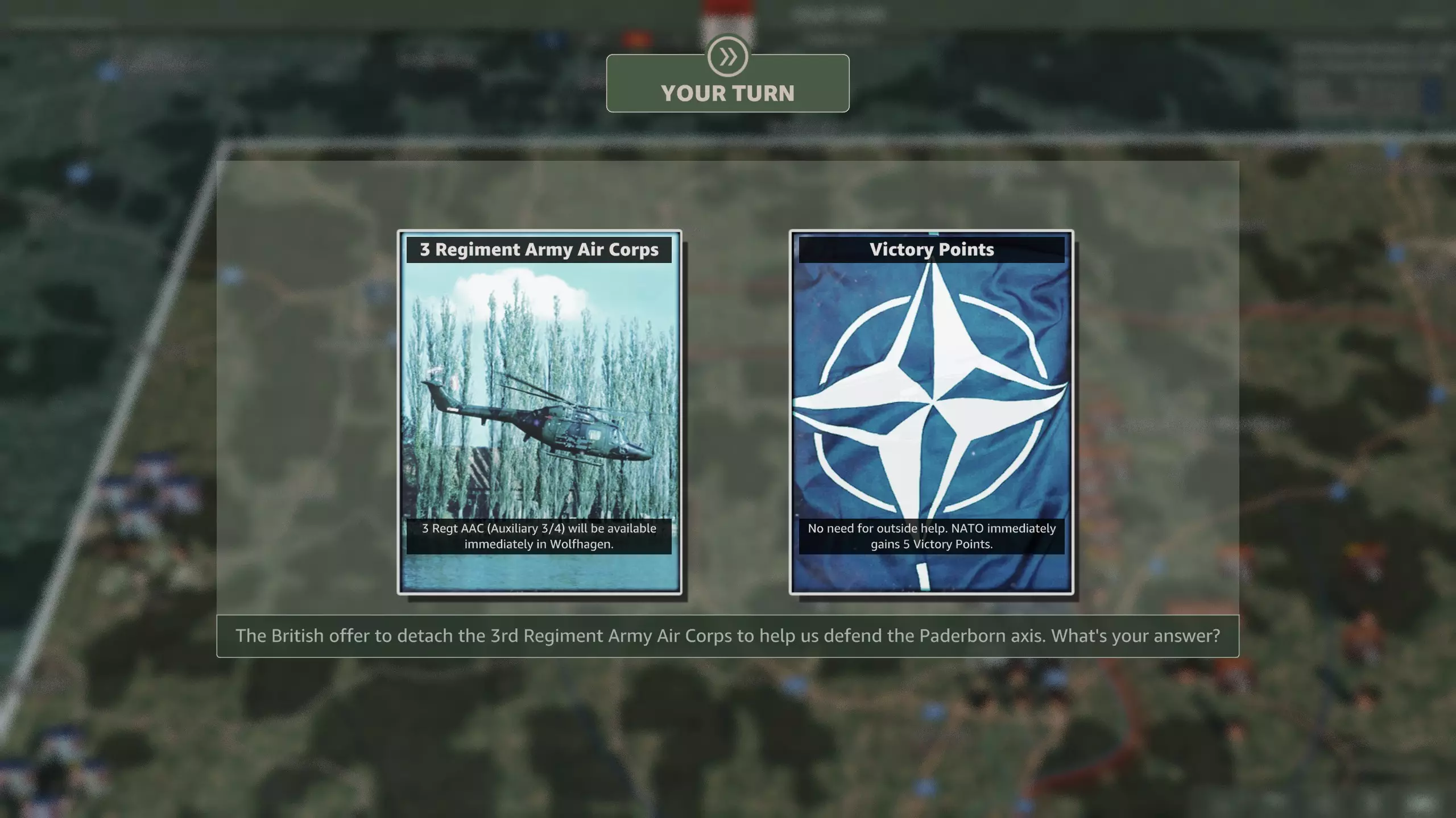 北约在此处有两个事件。 在第二回合,你可以选择获得一个绿色贝雷帽营,或是一支配备电子战支援的专职SEAD联队。 而在第六回合,你可以通过放弃一些胜利点来获得一些大型火炮。 让我们来看看具体情况: 第二回合