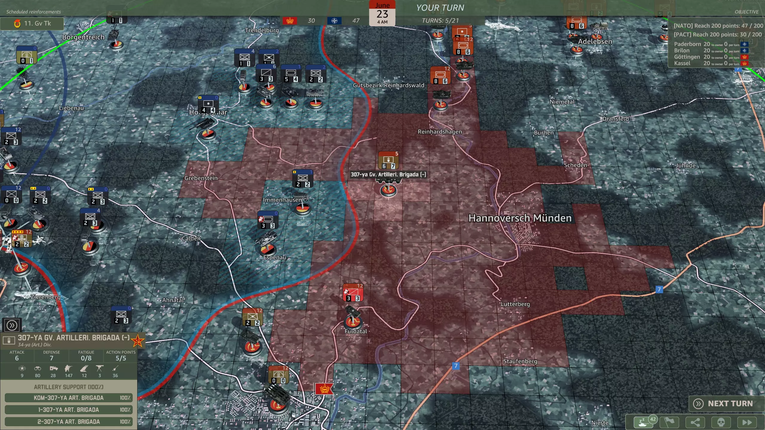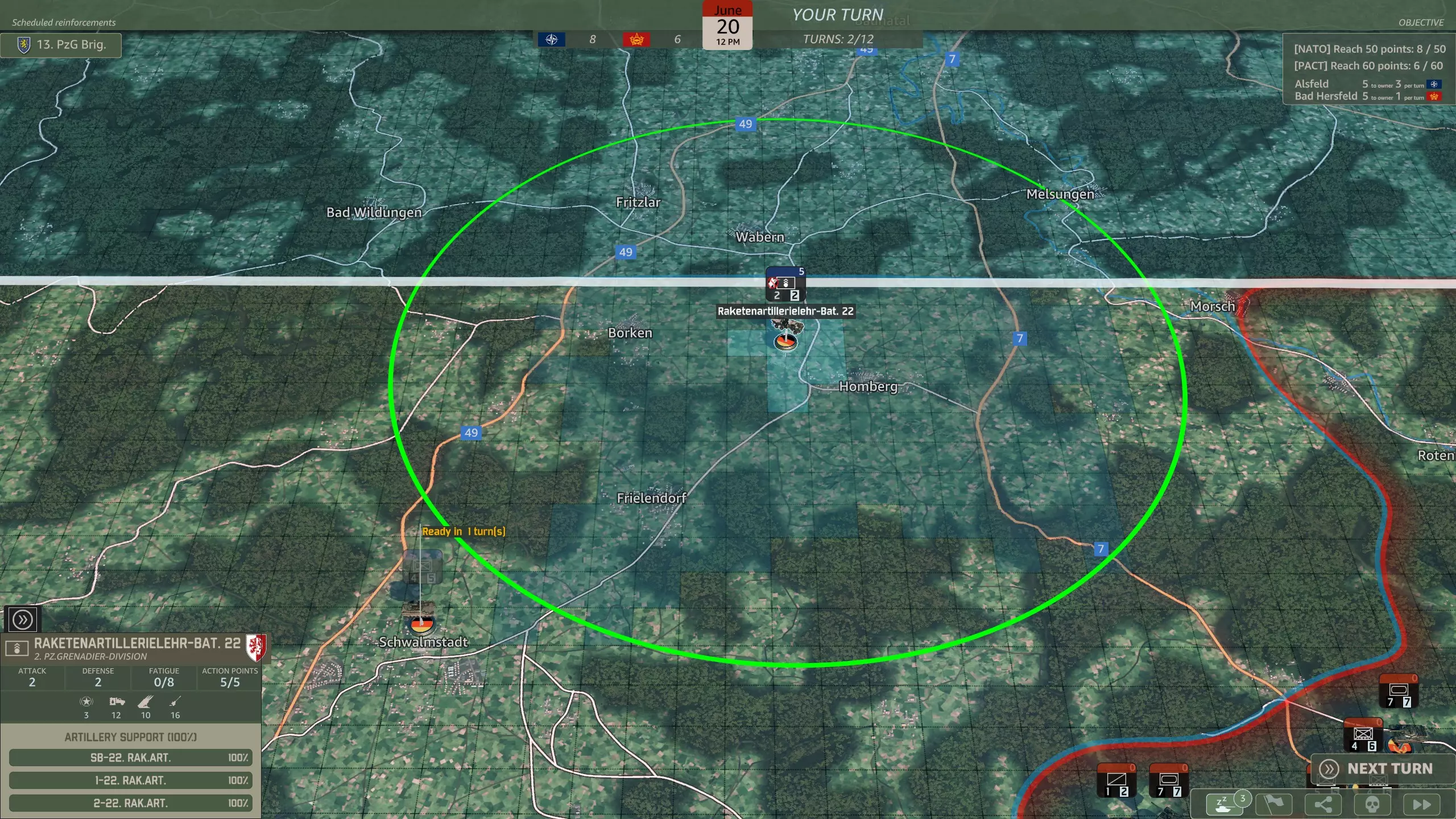 该选哪一个? 如前所述,这十点并不是什么大问题。由于过高的点数要求,战役会保证持续21回合,你或许有时间使用步兵。不过,如果你能充分利用英国第3师的重型装甲,可能就不需要步兵了。 我通常会选择步兵,但很少需要用到它们。 华约集团也会采取相应行动 第五回合,用重型火箭炮兵来获取点数? 以下是你将获得的内容: 第五回合