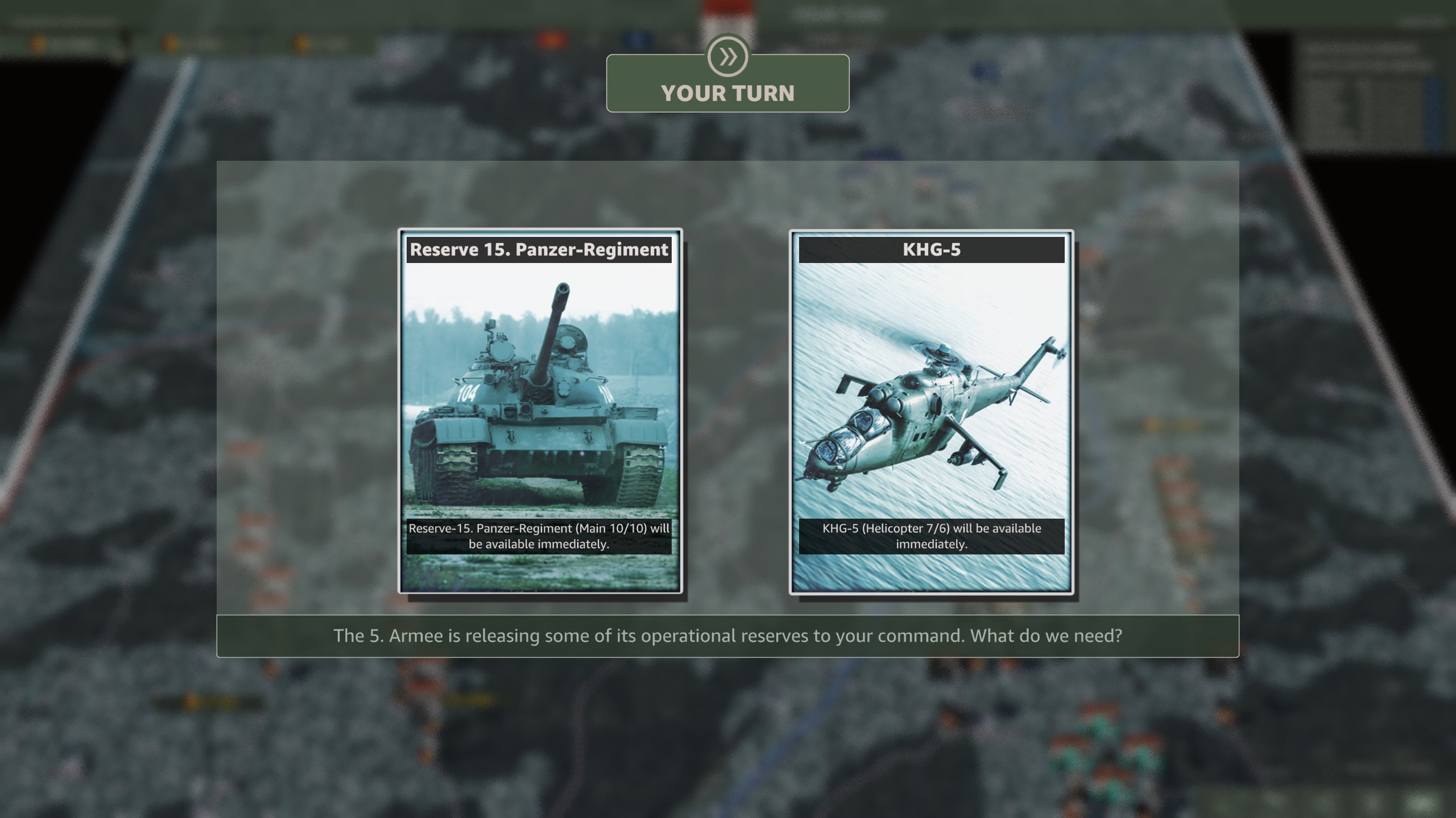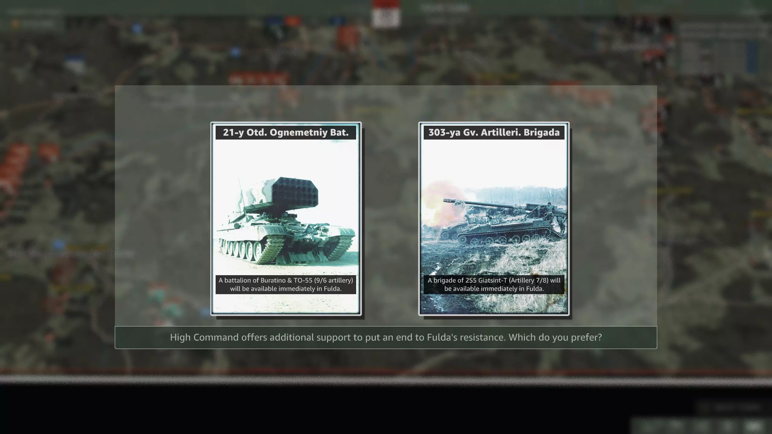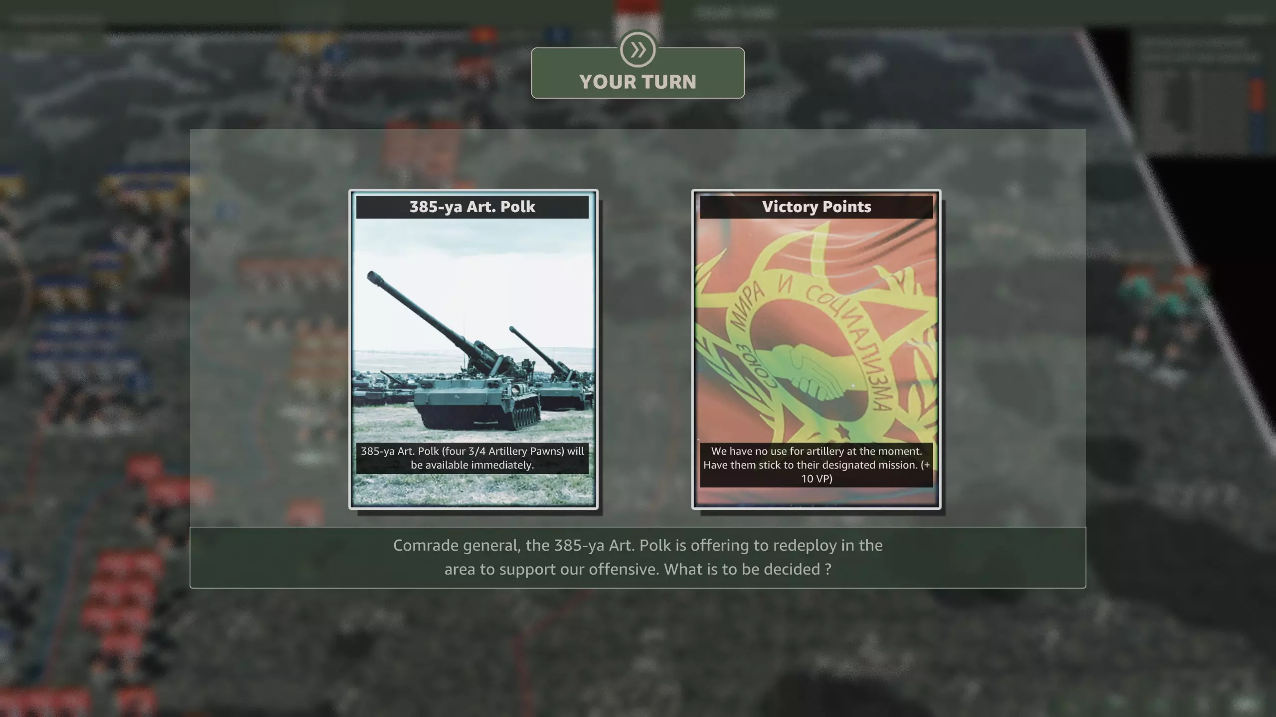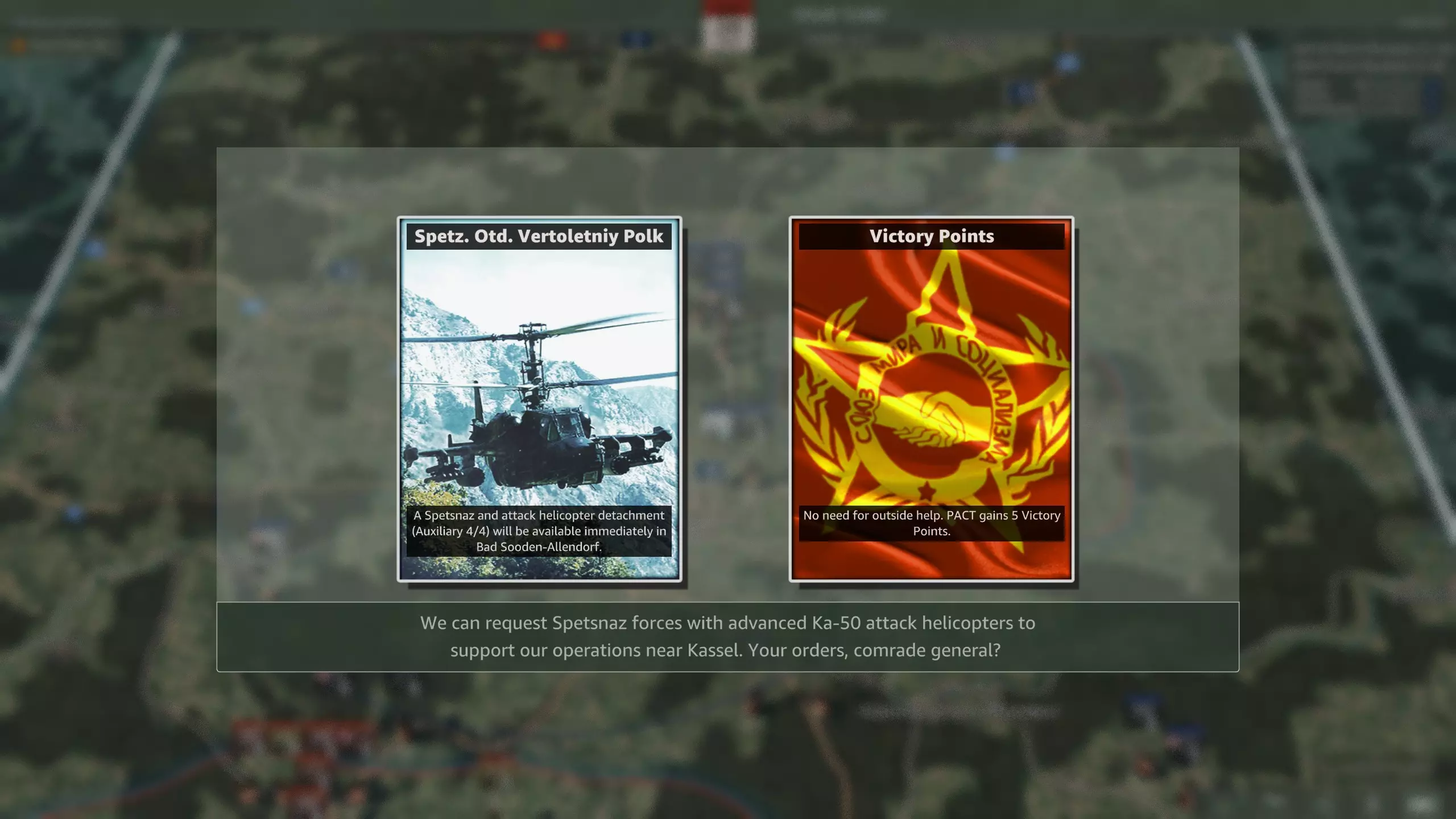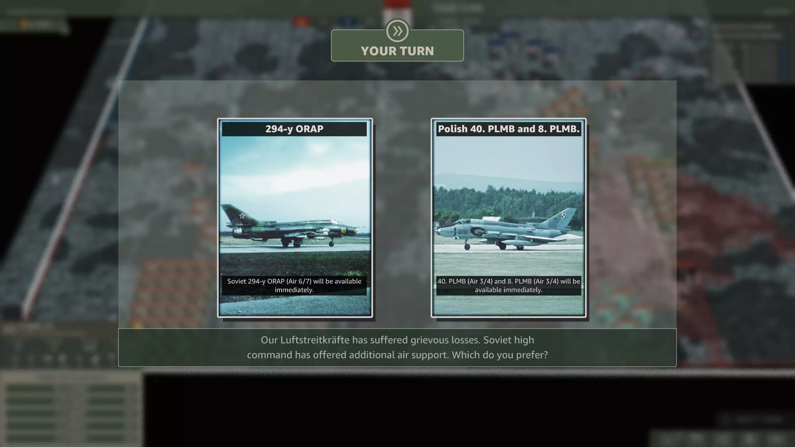 该选哪一个? 战役地图狭窄,而华约有大量防空单位,因此防空压制至关重要。另一方面,指挥部实际价值不大。你已经有3个师级指挥部,并且从第二步兵师还会再获得一个。选择空军是唯一合理的选项。 华约这次凭借三个 第四回合提供火炮或点数选项。 第七回合可以派出波兰部队。 第十回合会有重型空中支援。 选项包括: 第四回合